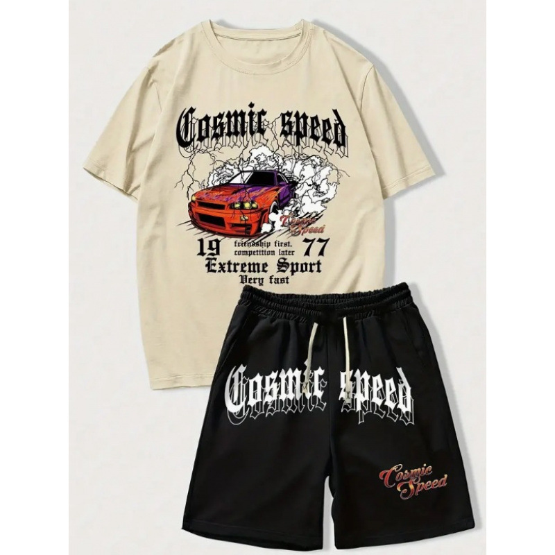 2024년 국경 간 Temu 여름 인기 모델 자동차 그래픽 프린트 남성용 2피스 의류 공장 직접 판매스토어 가기