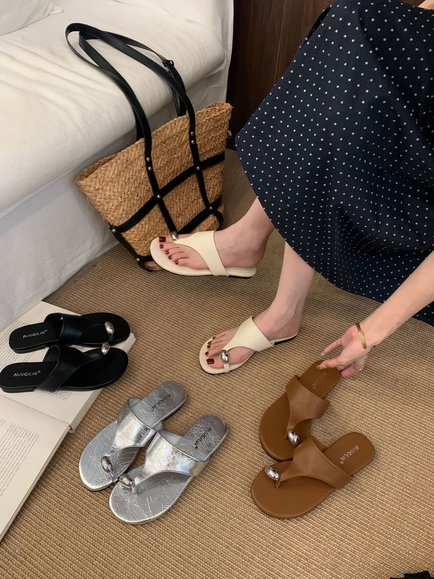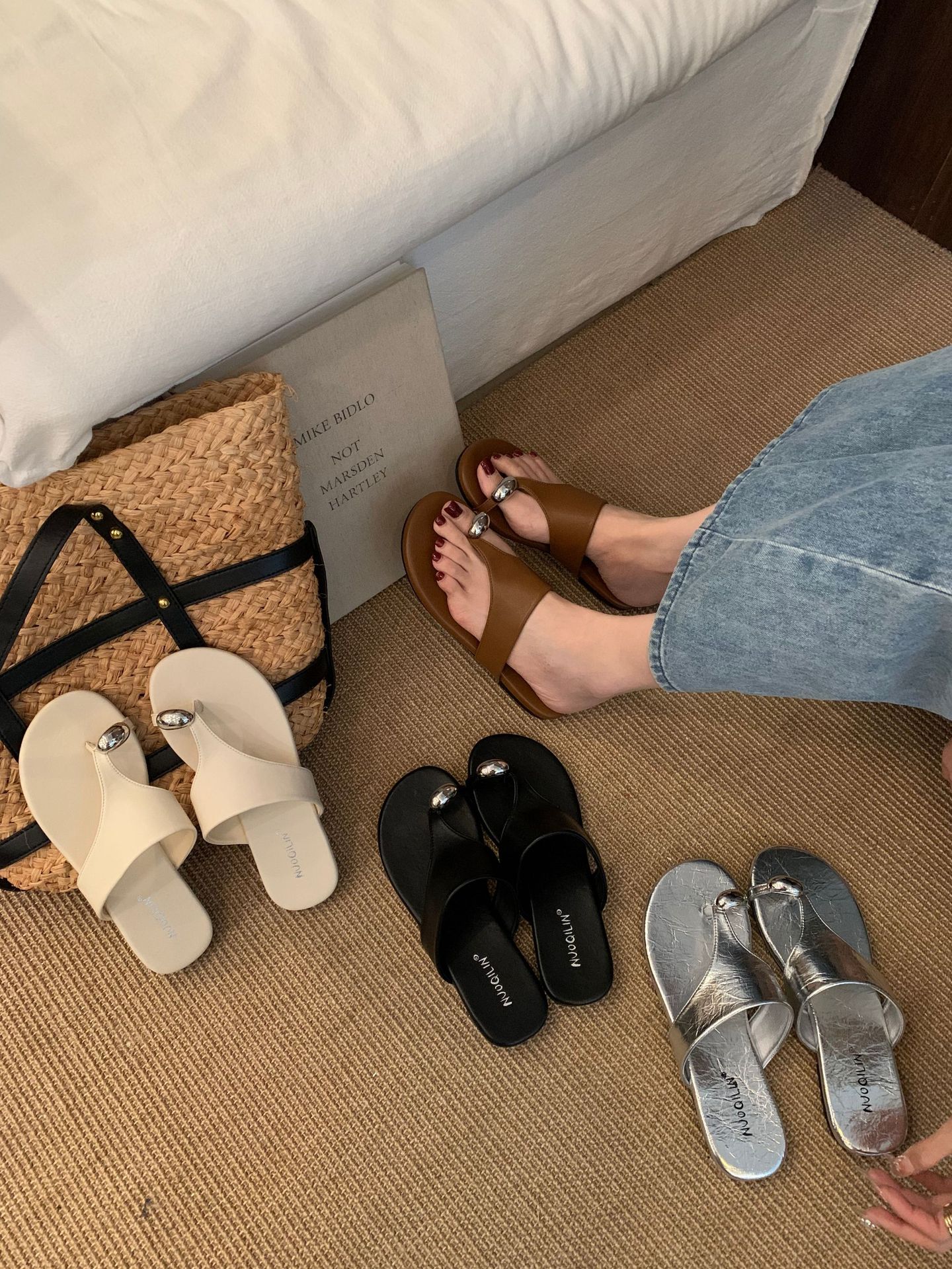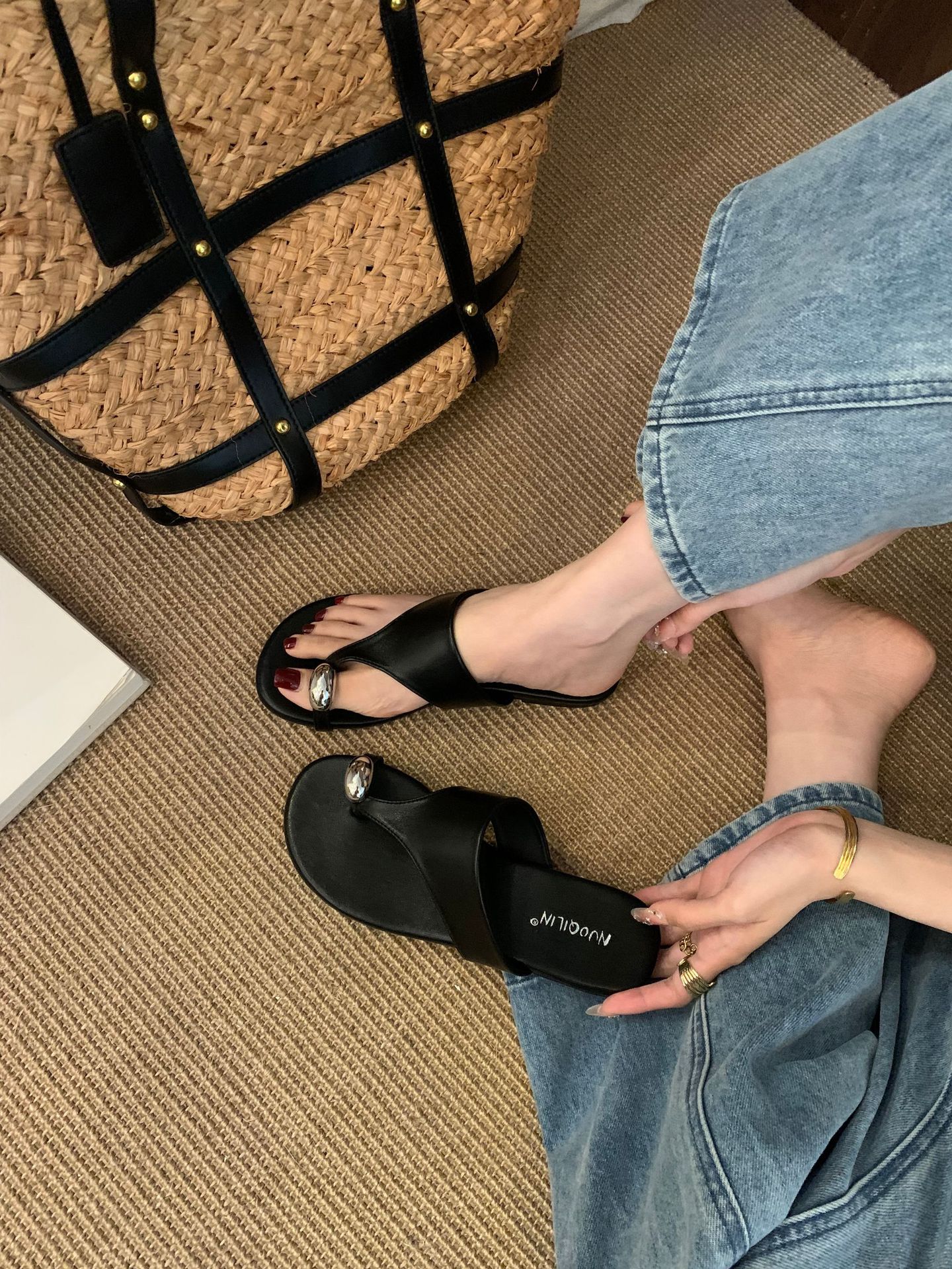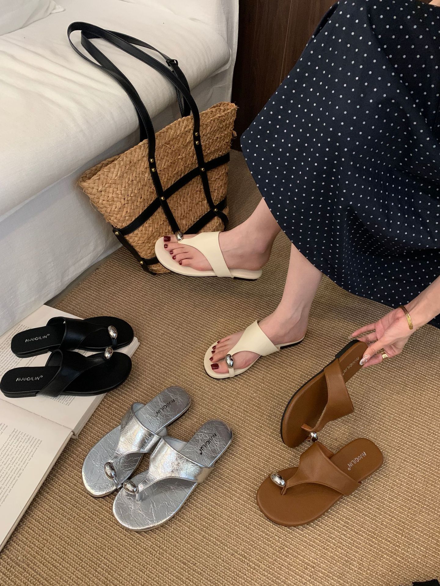 부드러운 가죽 버전 ~ 여성용 프렌치 슬리퍼 2025 뉴 레트로 다용도 플랫 메탈 슬리퍼 비치 슈즈 슬리퍼