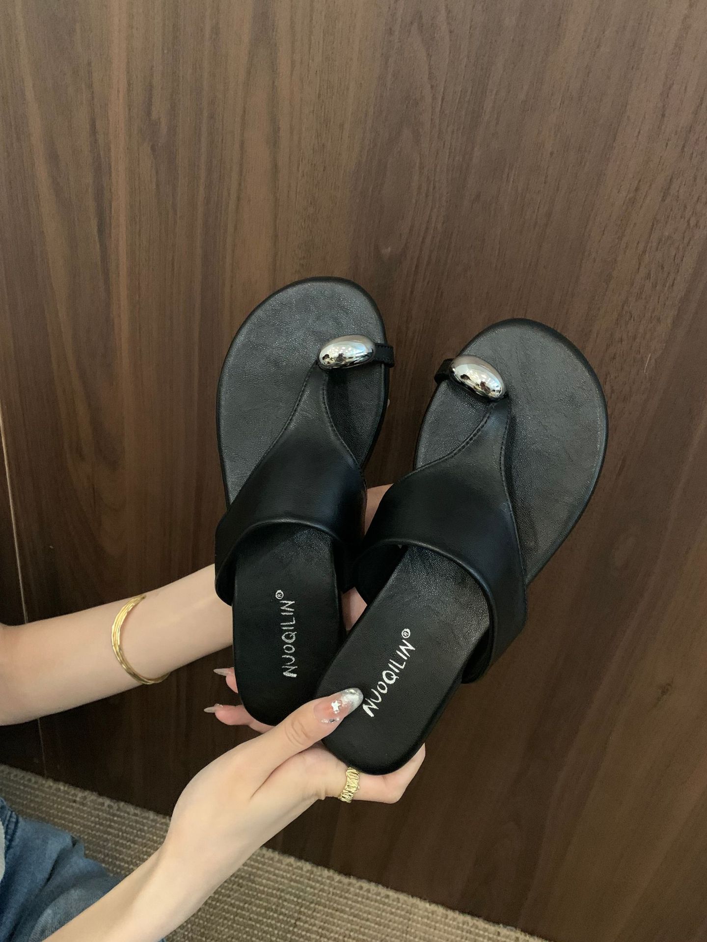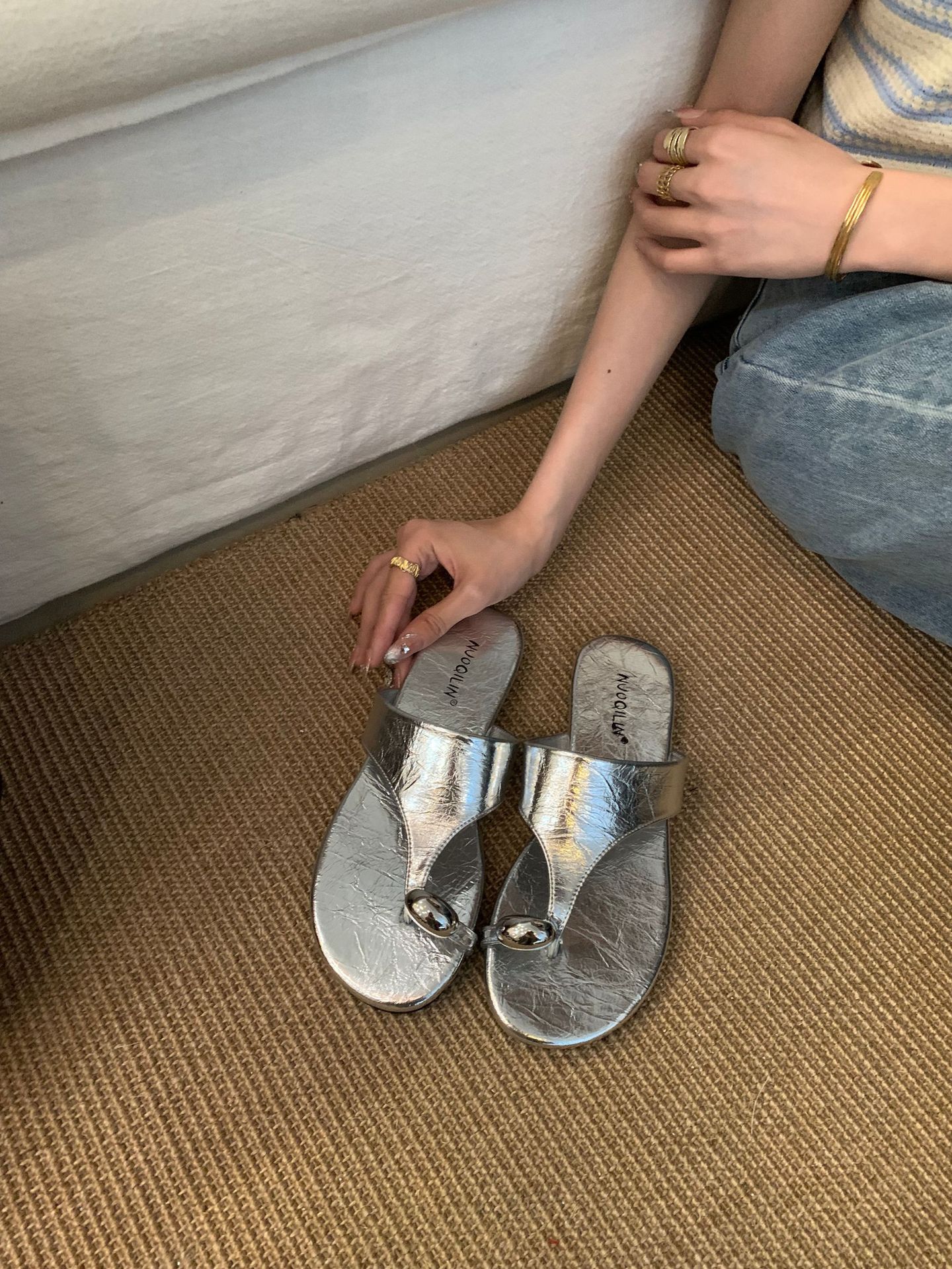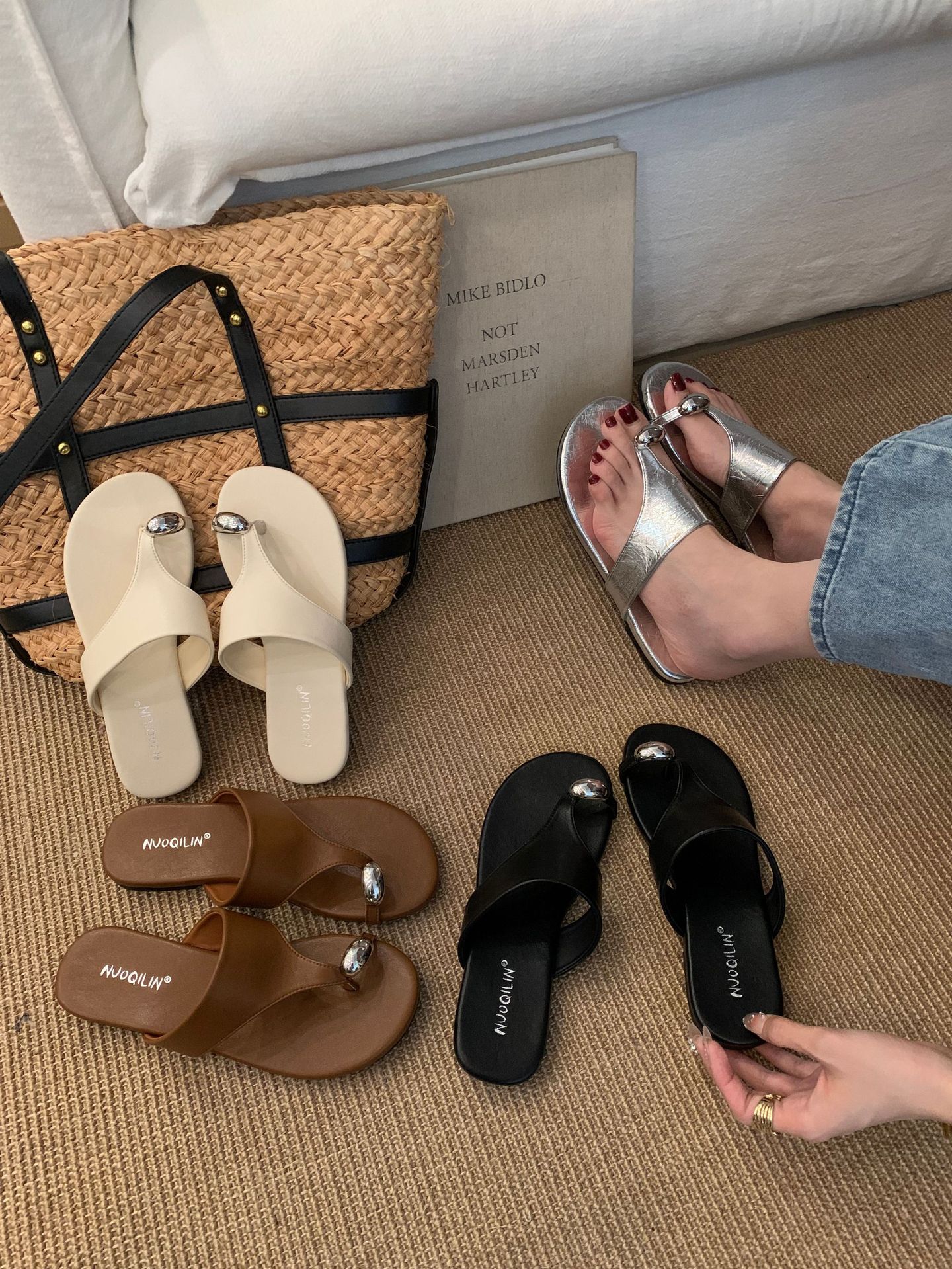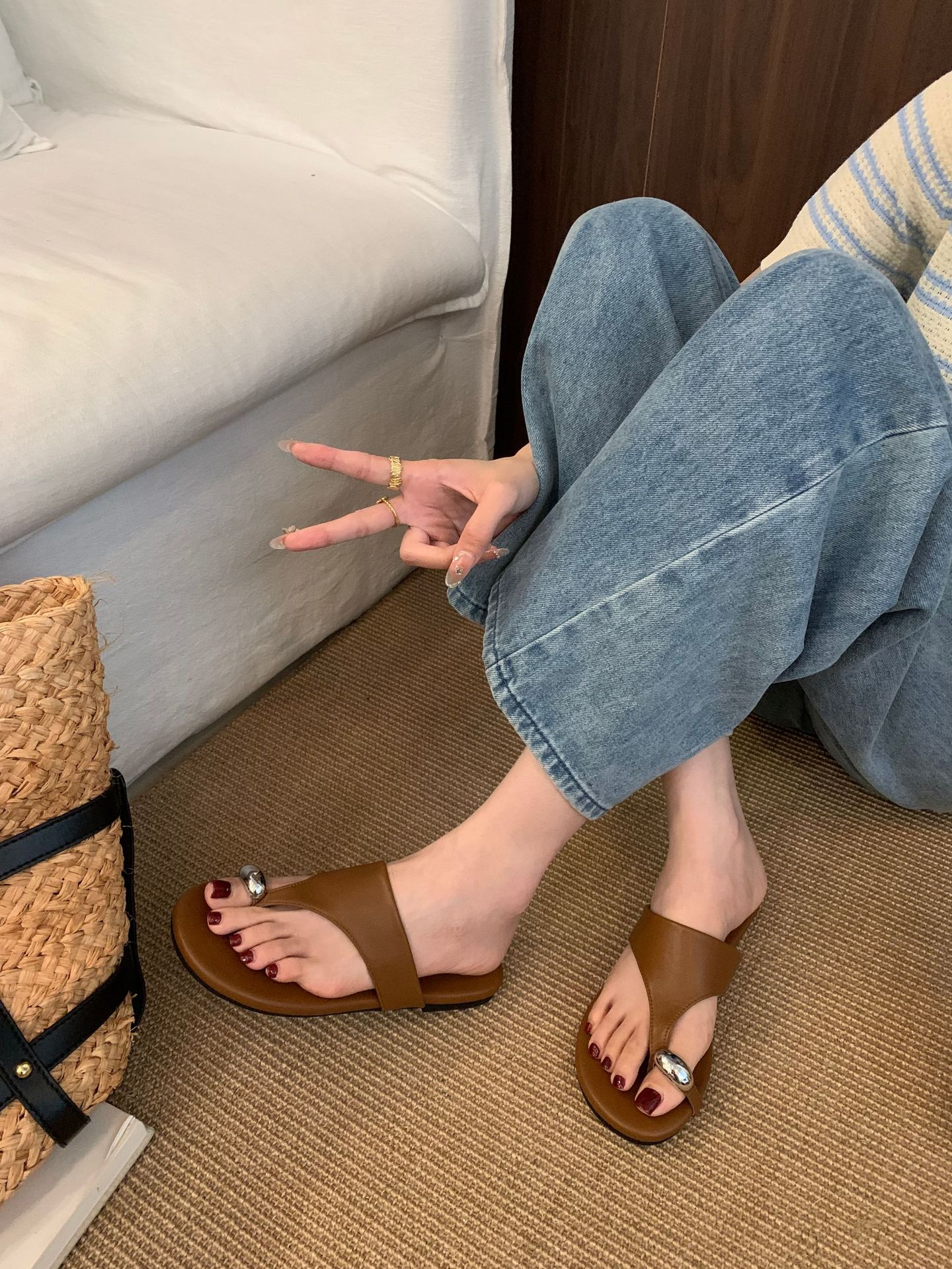 부드러운 가죽 버전 ~ 여성용 프렌치 슬리퍼 2025 뉴 레트로 다용도 플랫 메탈 슬리퍼 비치 슈즈 슬리퍼