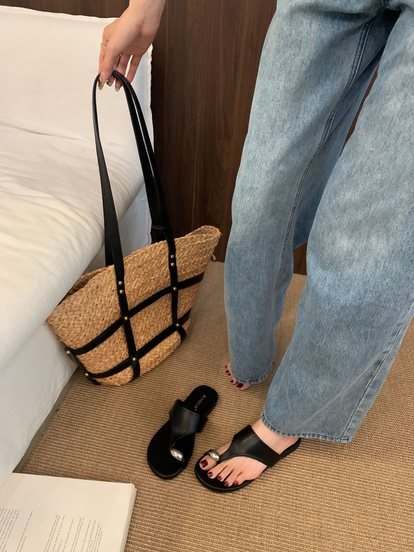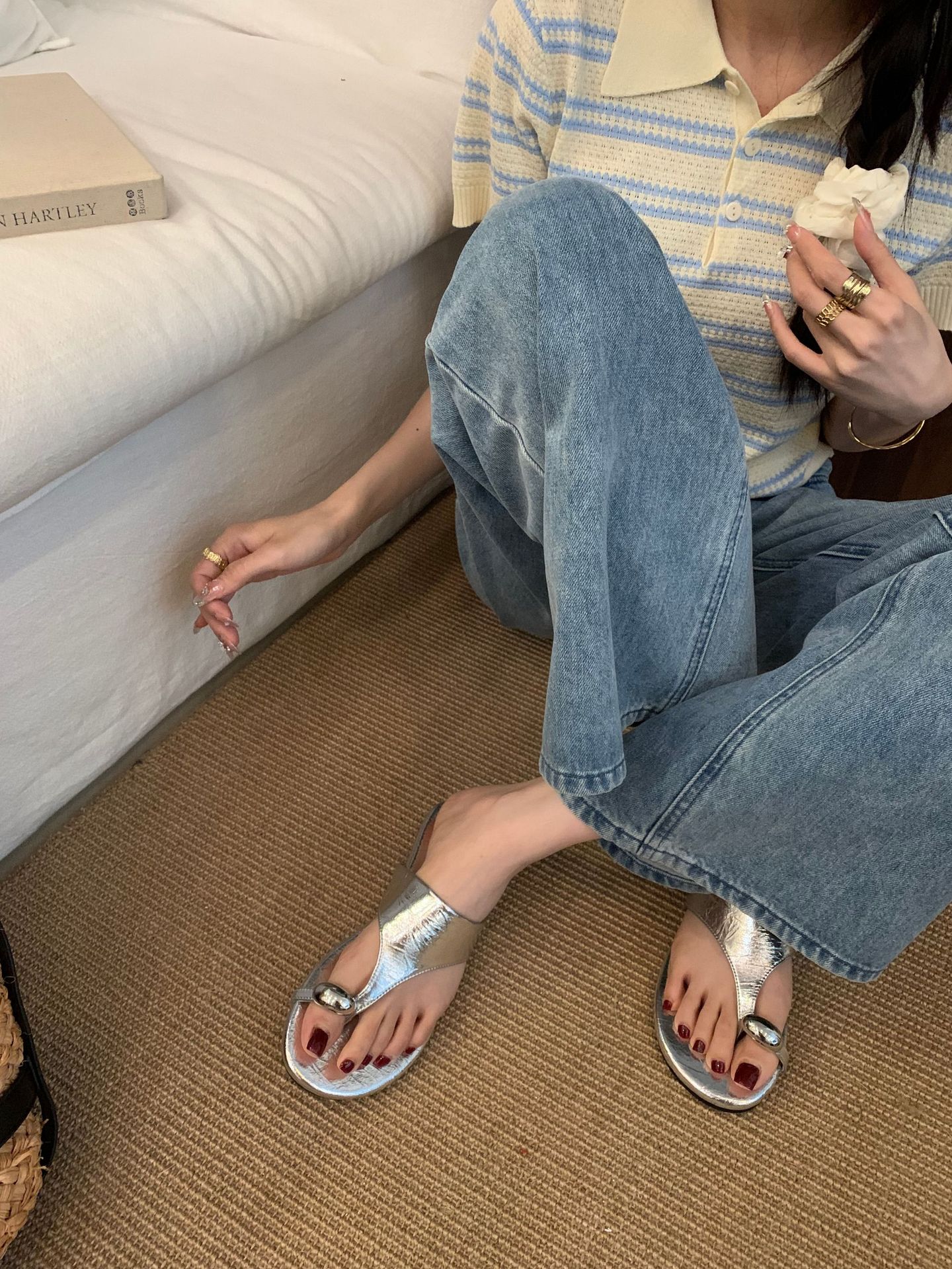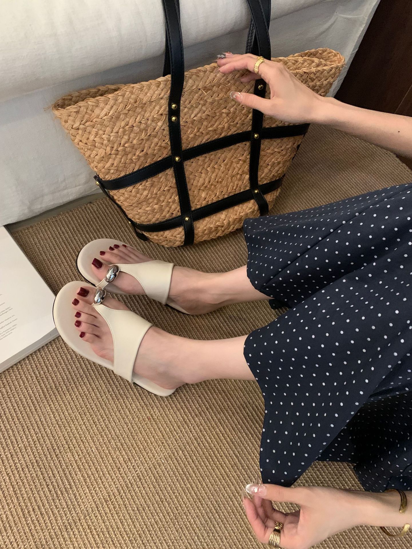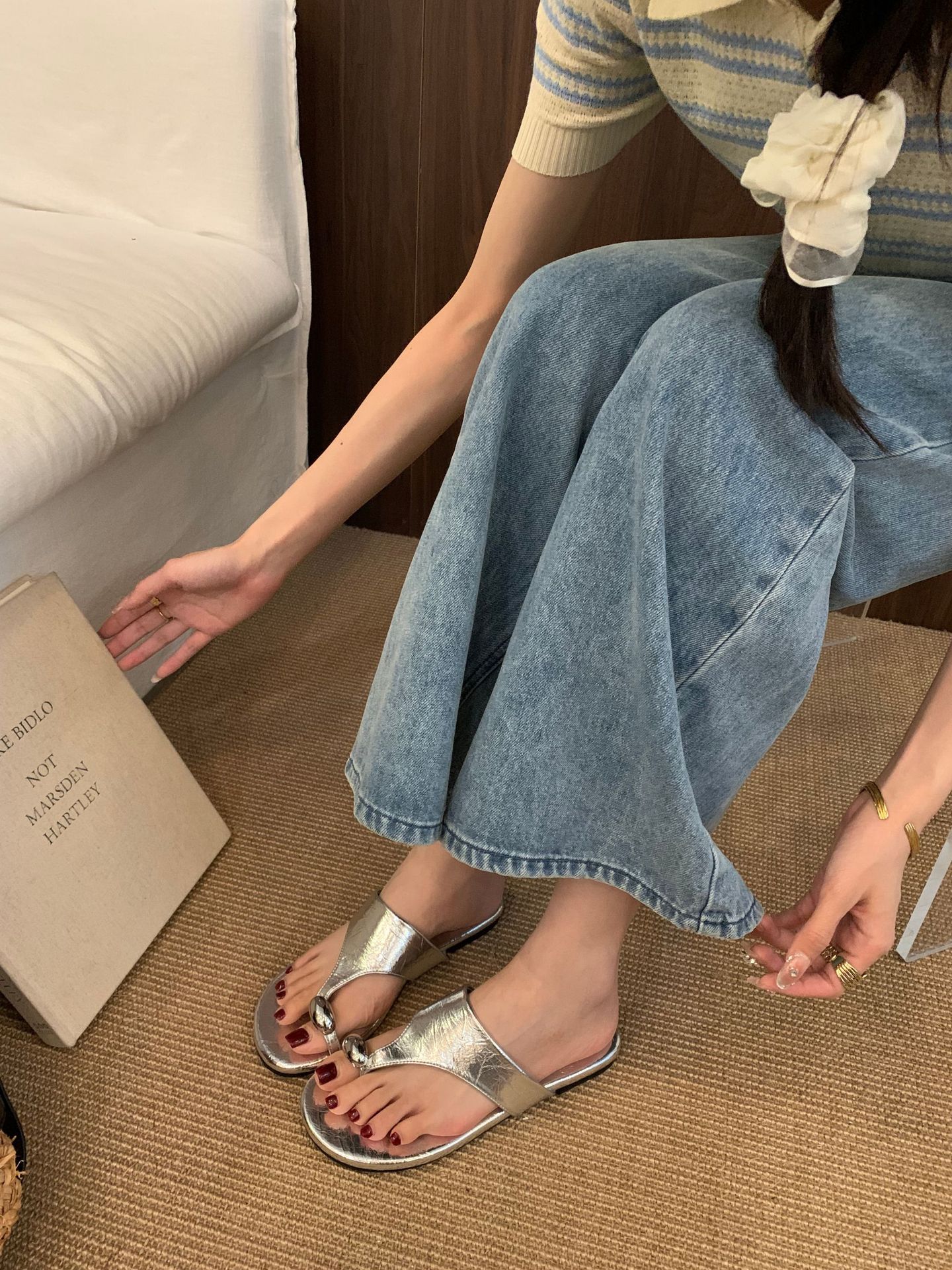 부드러운 가죽 버전 ~ 여성용 프렌치 슬리퍼 2025 뉴 레트로 다용도 플랫 메탈 슬리퍼 비치 슈즈 슬리퍼