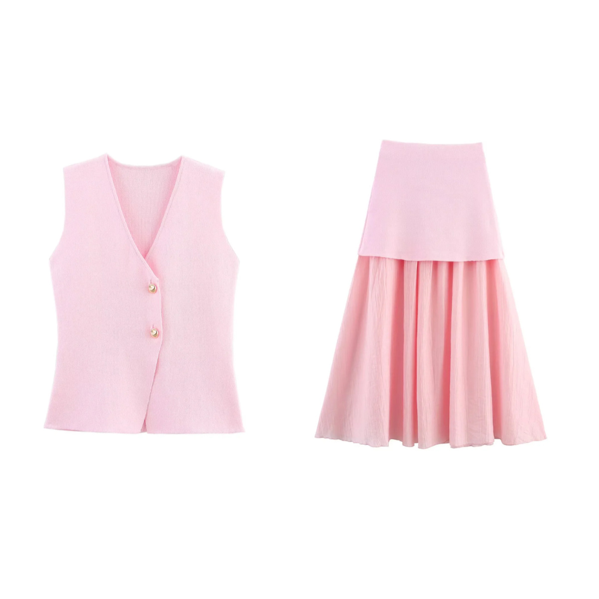 ZA 대외 무역 유럽과 미국 스타일의 크로스보더 여성 의류 새로운 골드 버튼 니트 조끼 + 작은 주름 스플 라이스 스커트스토어 가기