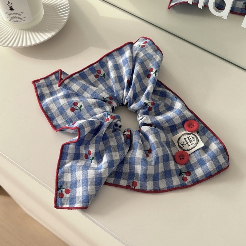 • 파란색과 흰색 체크무늬 체리 리본 레이스 머리끈