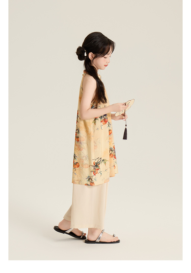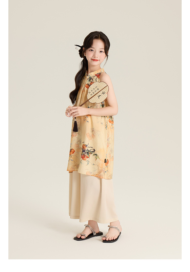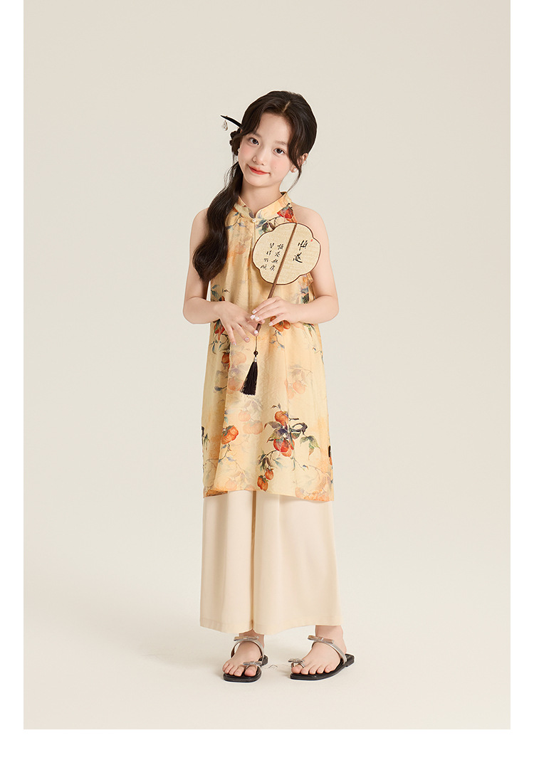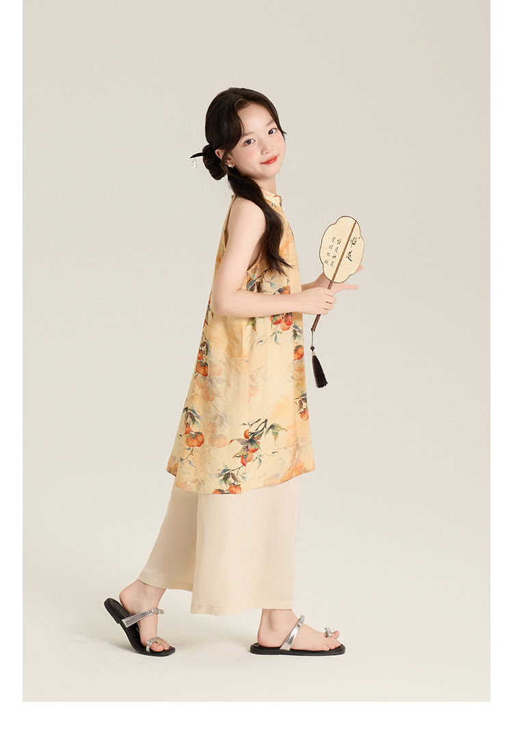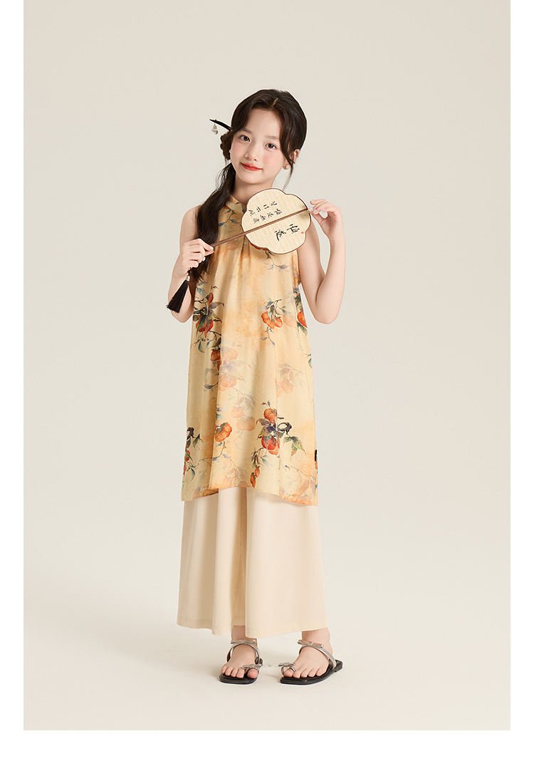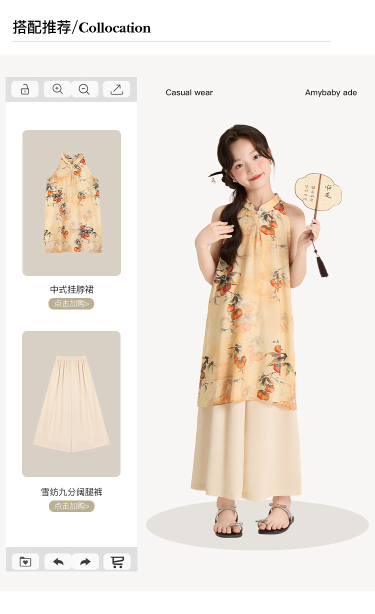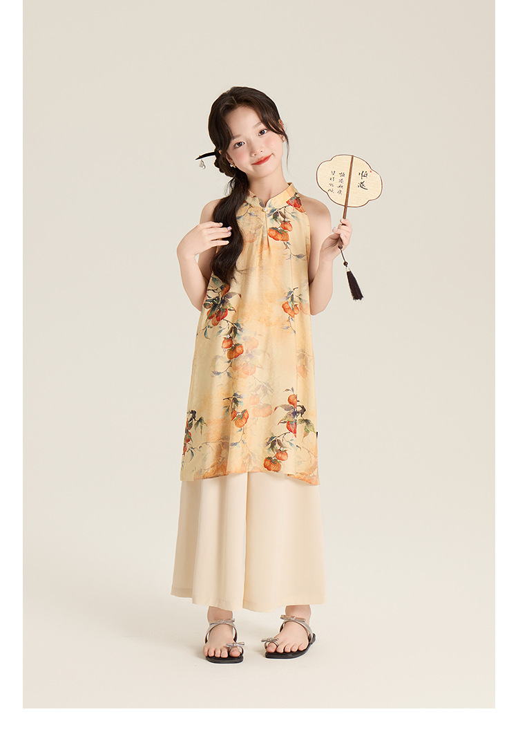 Amybaby 여아 정장 여름 2025 새로운 중국 스타일 복고풍 민소매 홀터넥 꽃무늬 스커트 9부 와이드 팬츠스토어 가기