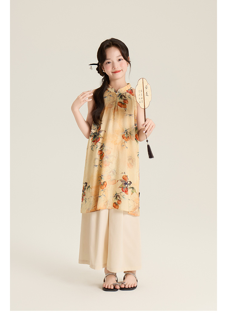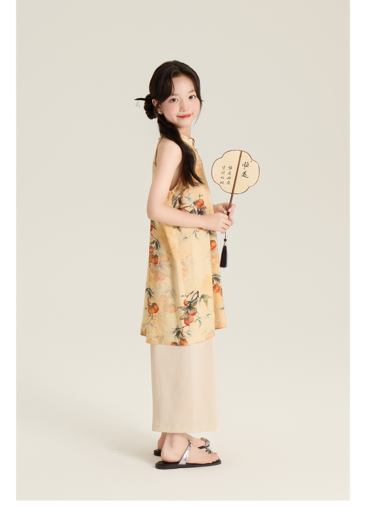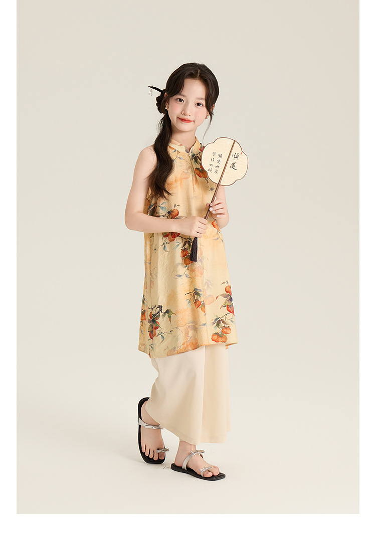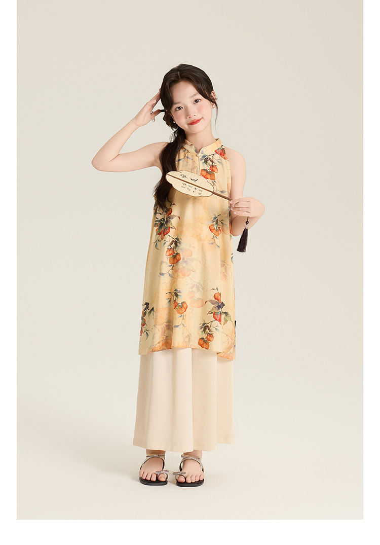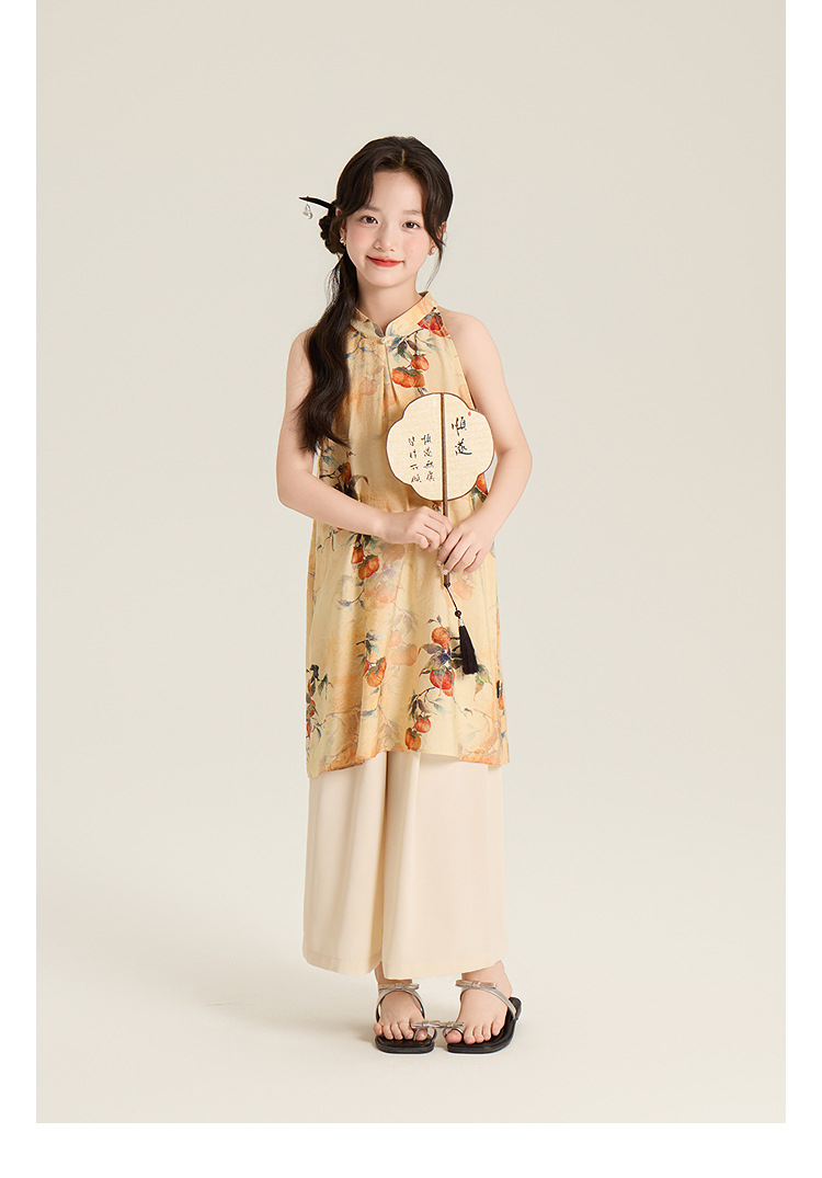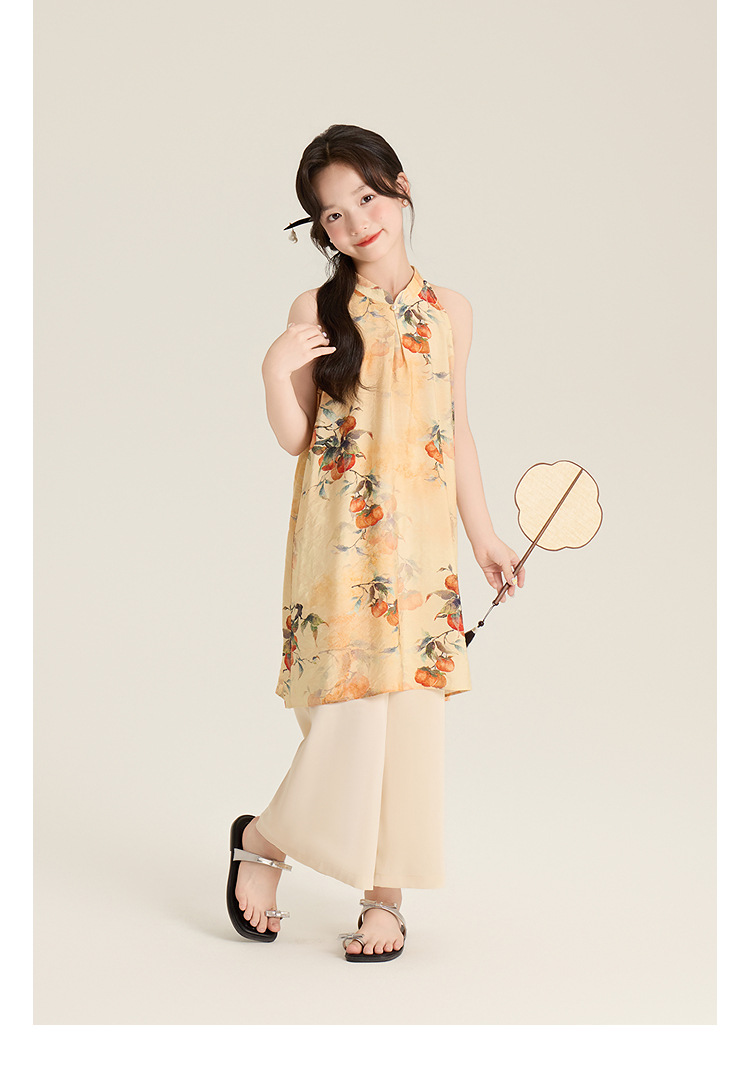 Amybaby 여아 정장 여름 2025 새로운 중국 스타일 복고풍 민소매 홀터넥 꽃무늬 스커트 9부 와이드 팬츠스토어 가기
