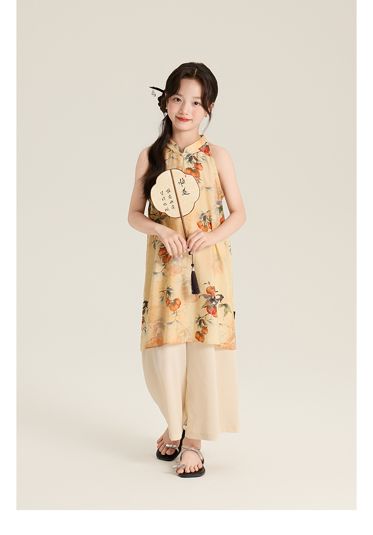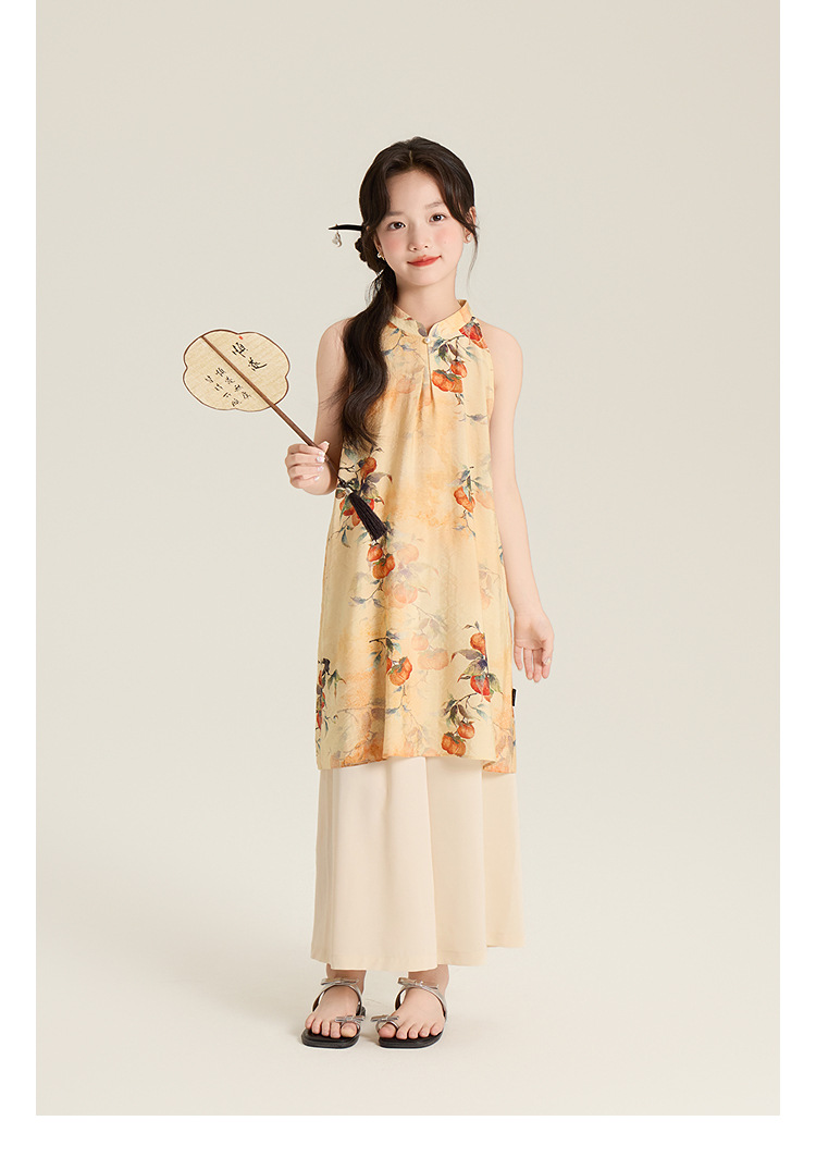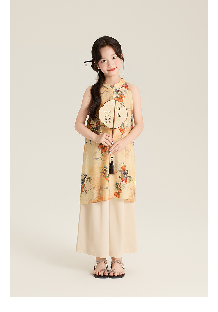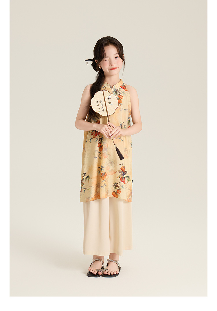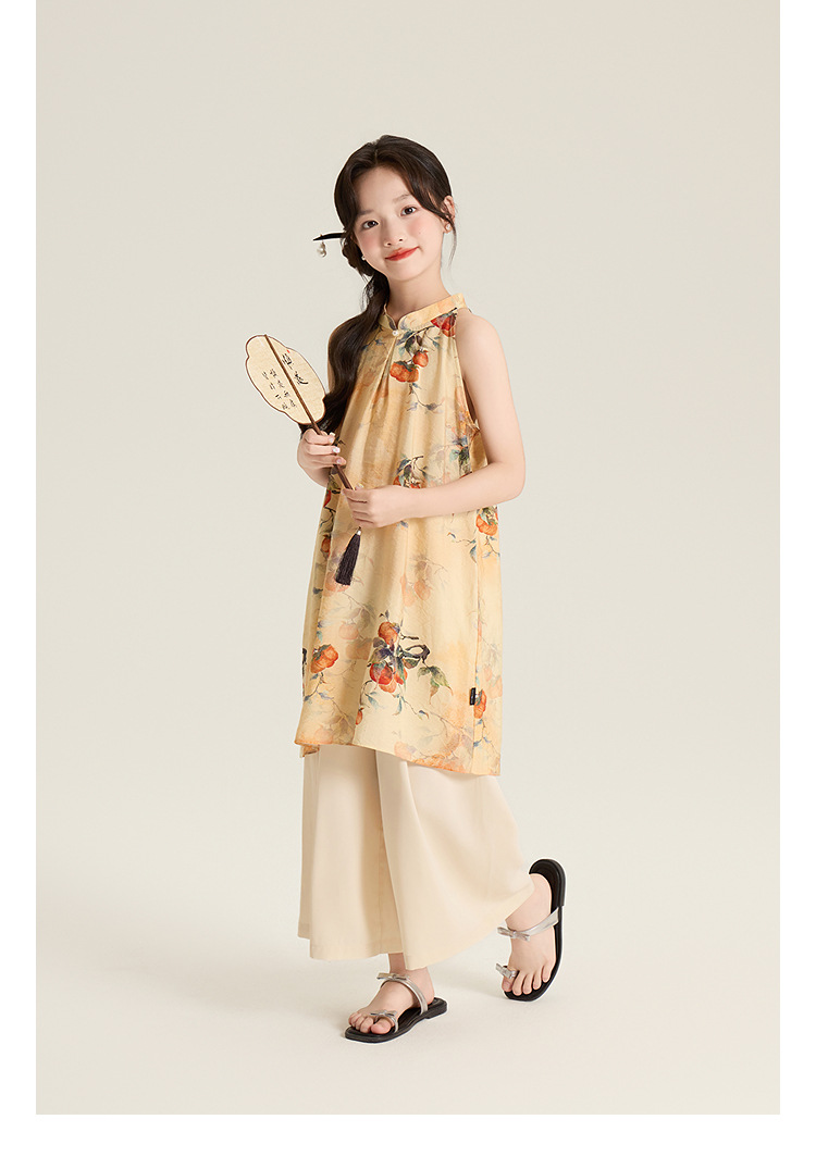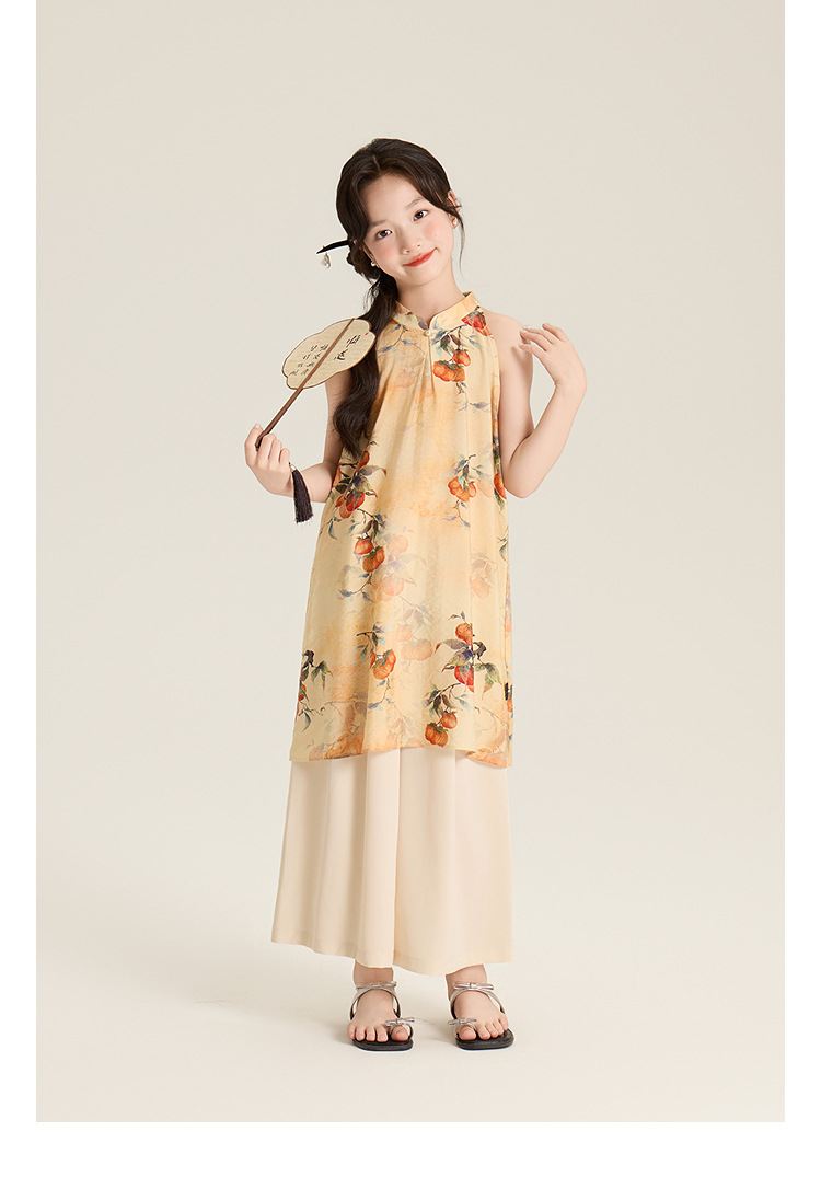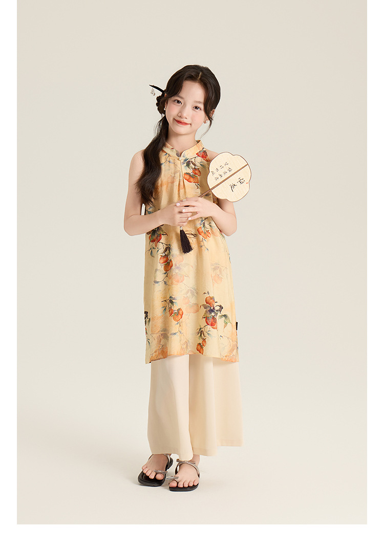 Amybaby 여아 정장 여름 2025 새로운 중국 스타일 복고풍 민소매 홀터넥 꽃무늬 스커트 9부 와이드 팬츠스토어 가기