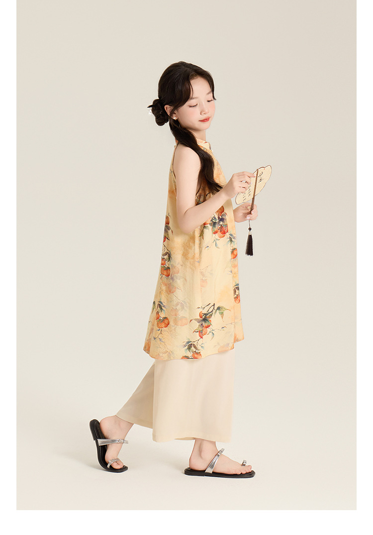 Amybaby 여아 정장 여름 2025 새로운 중국 스타일 복고풍 민소매 홀터넥 꽃무늬 스커트 9부 와이드 팬츠