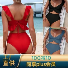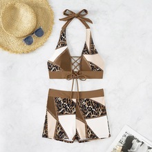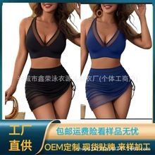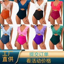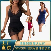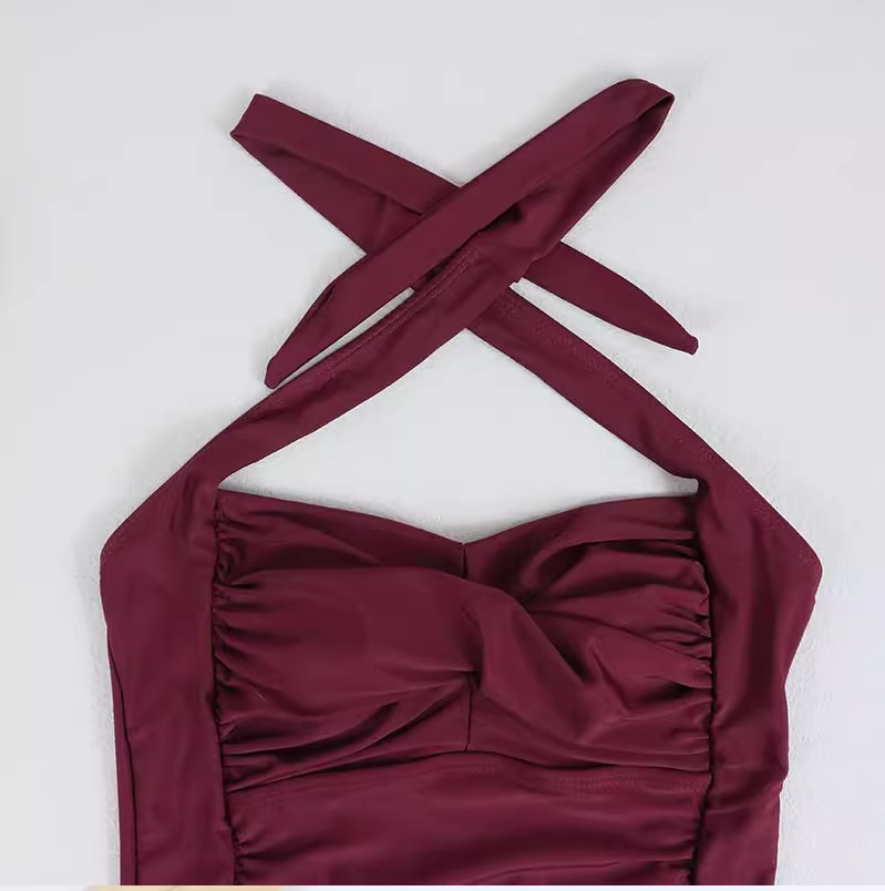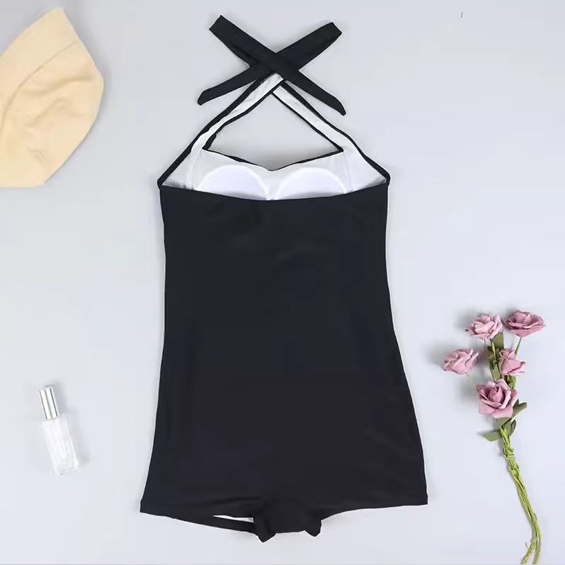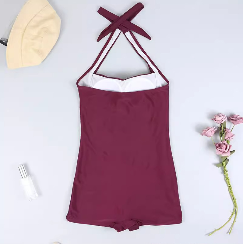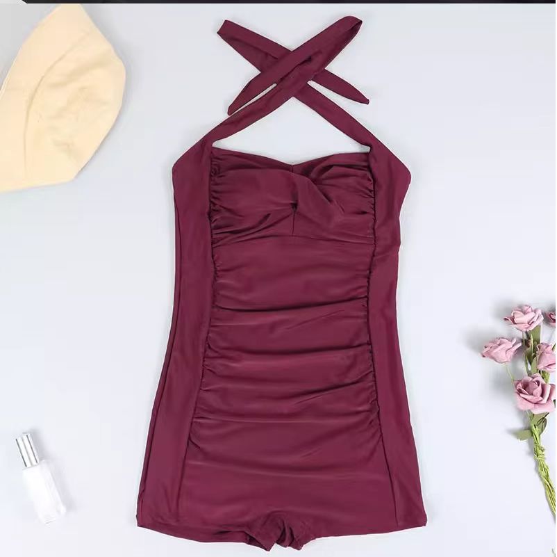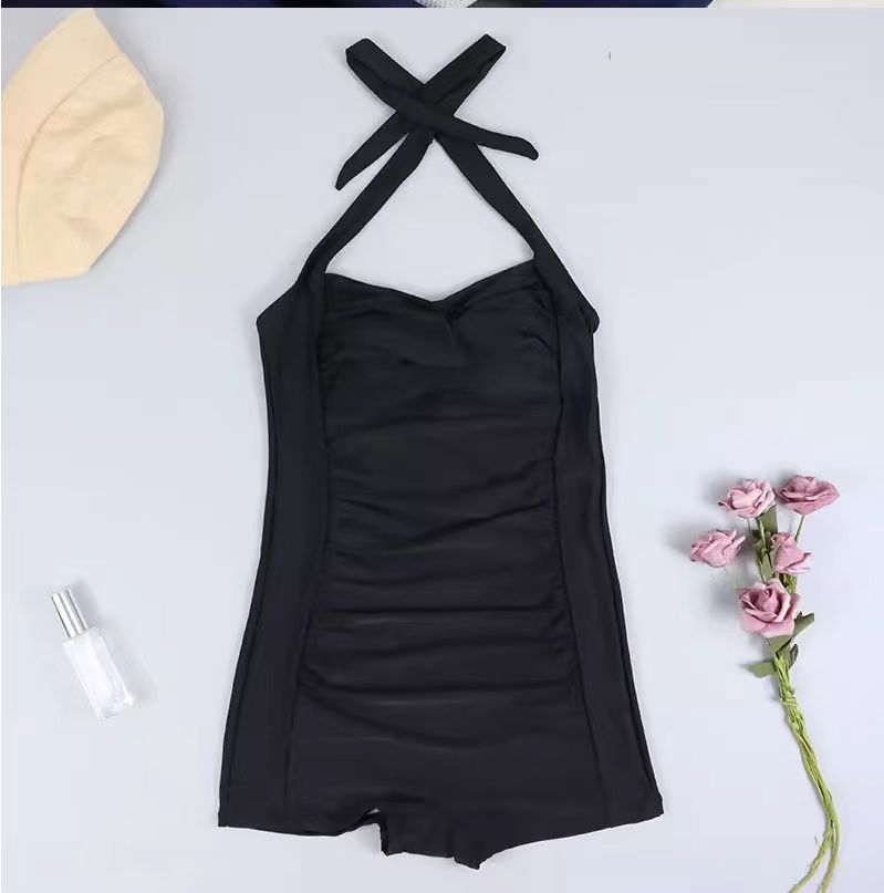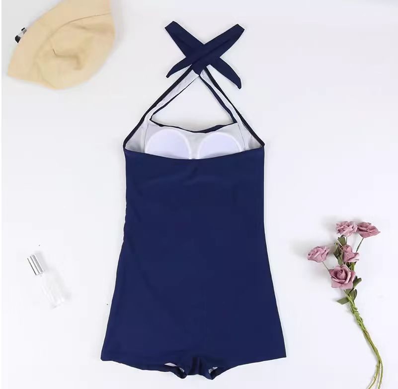 여성용 원피스 수영복, 작은 가슴용, 홀터넥, 플리츠 디자인, 사각팬츠, 온천용, 속건성, 네이비블루, 단색, 일체형