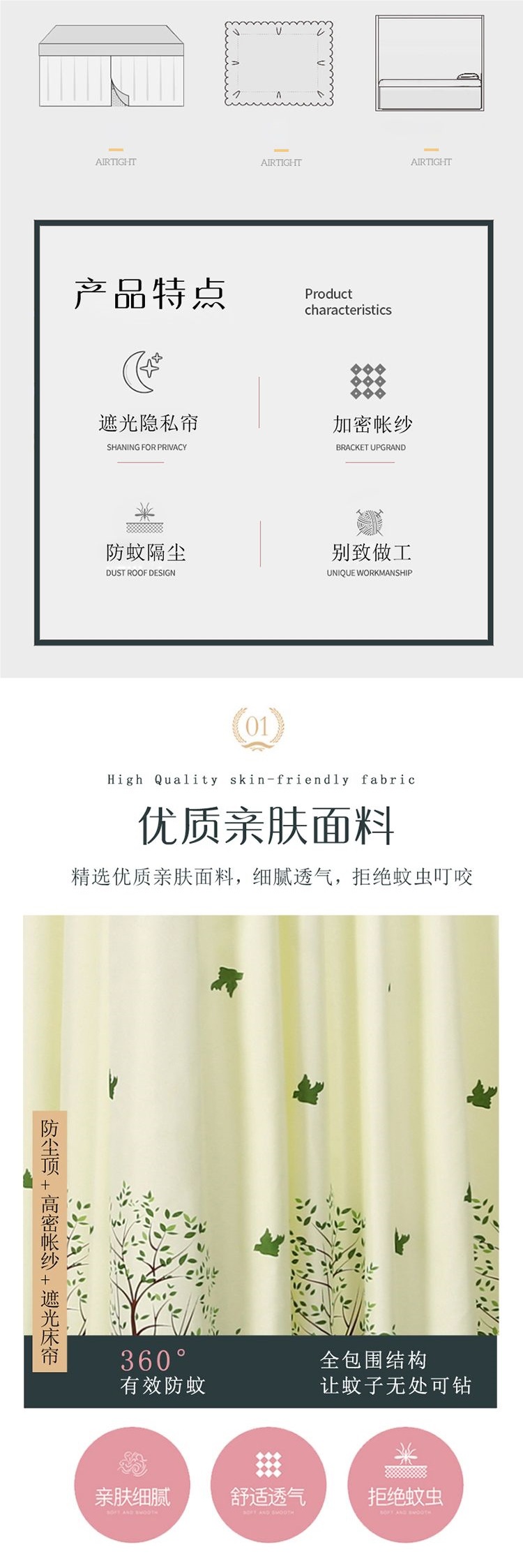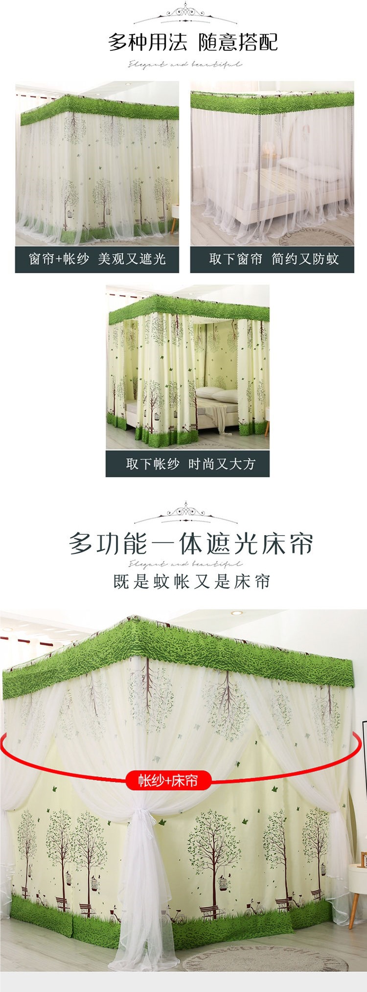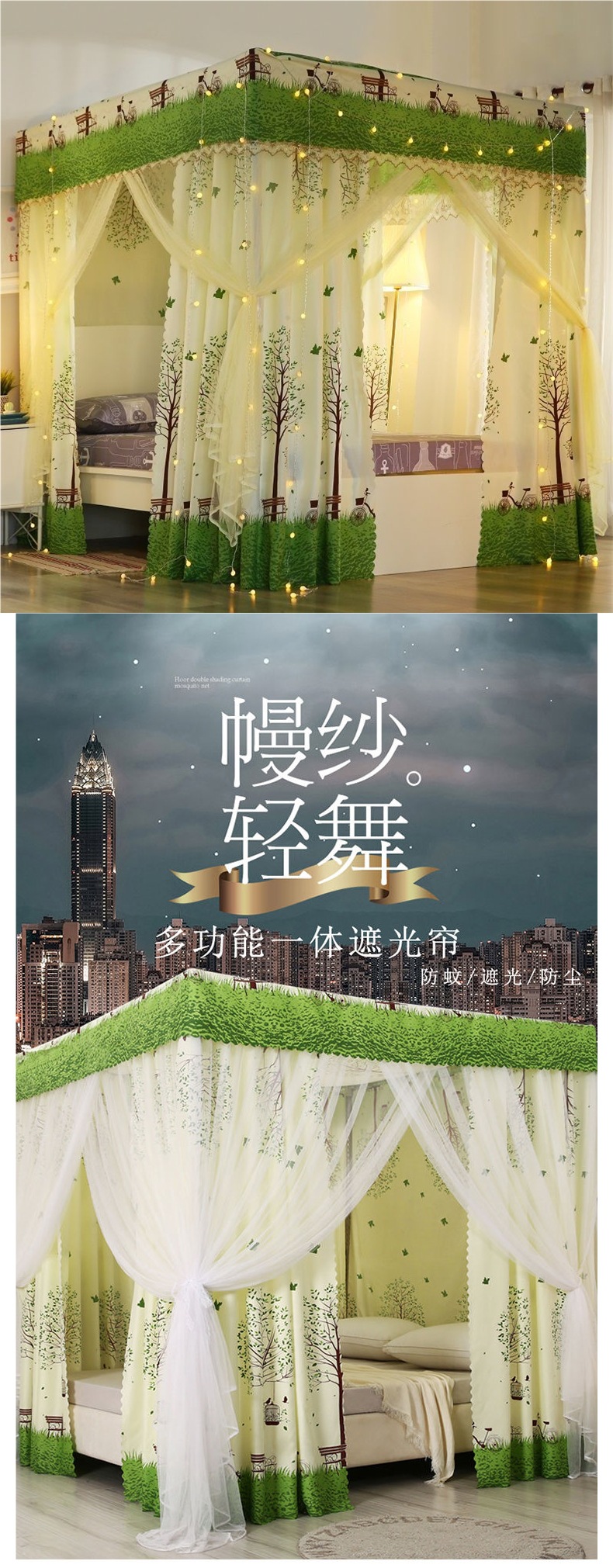 바닥부터 천장까지 차광 침대 커튼, 모기장, 일체형 침대 커튼, 기숙사 완전 밀폐형 3도어 방진 공주 소녀 스타일 3도어