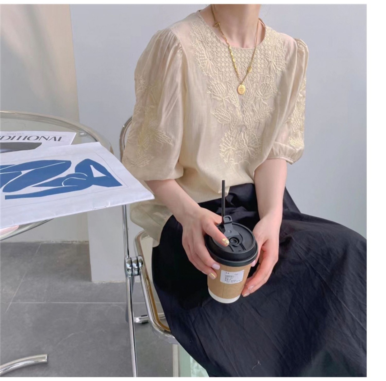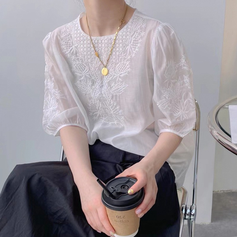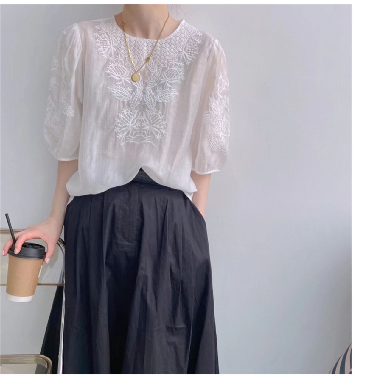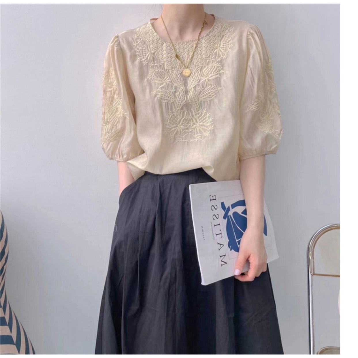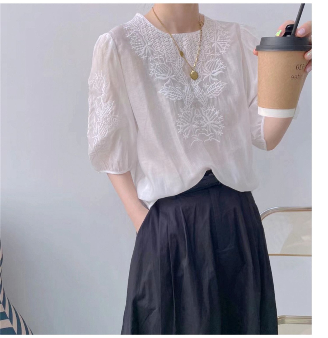 여성을위한 프랑스 복고풍 중공업 자수 셔츠 2025 여름 새로운 하이 엔드 디자인 반팔 퍼프 슬리브 탑 얇은스토어 가기