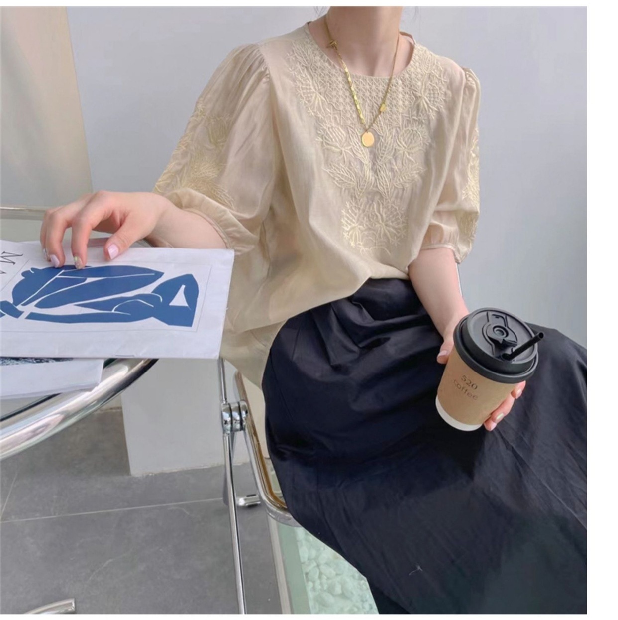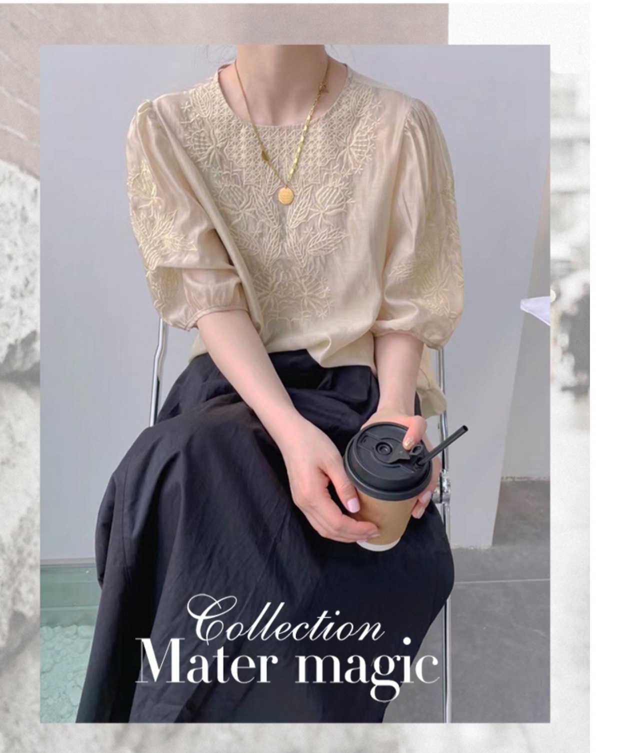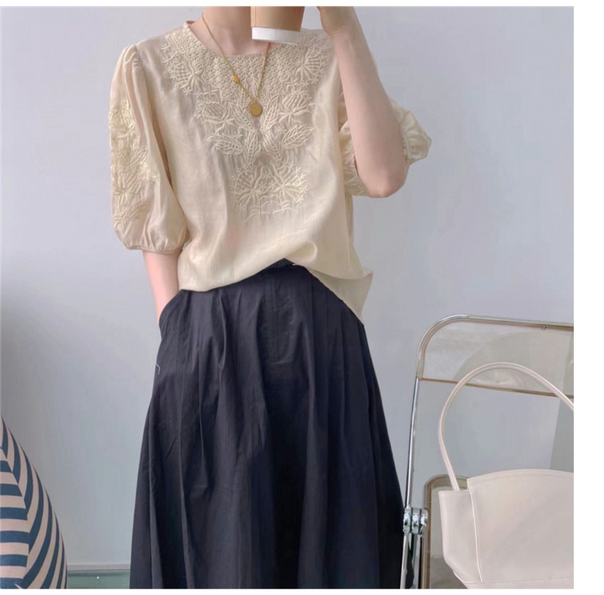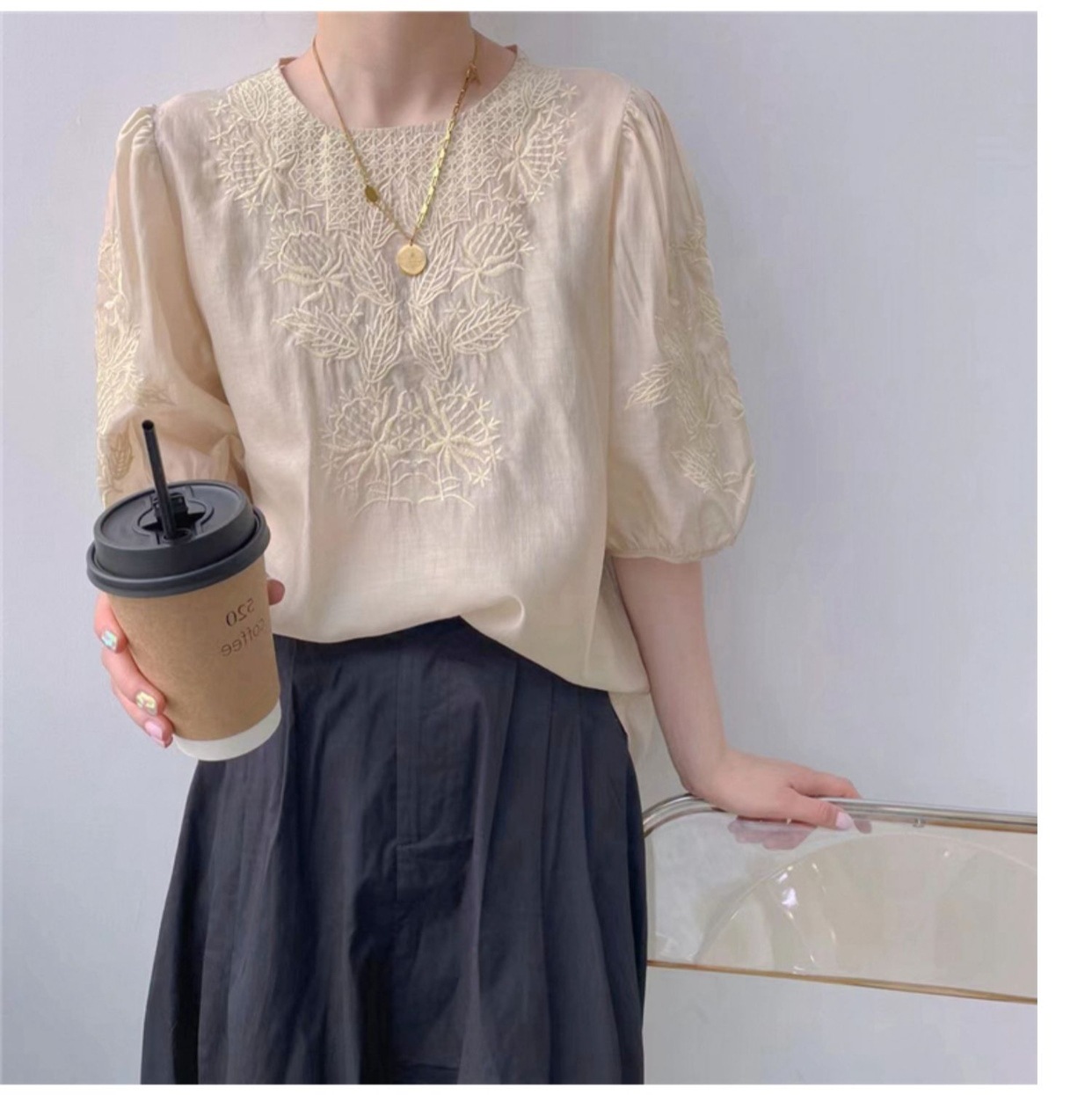여성을위한 프랑스 복고풍 중공업 자수 셔츠 2025 여름 새로운 하이 엔드 디자인 반팔 퍼프 슬리브 탑 얇은스토어 가기