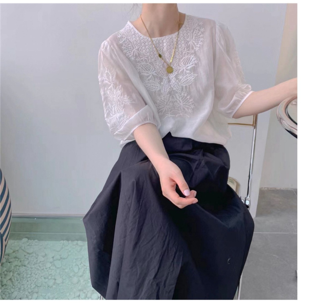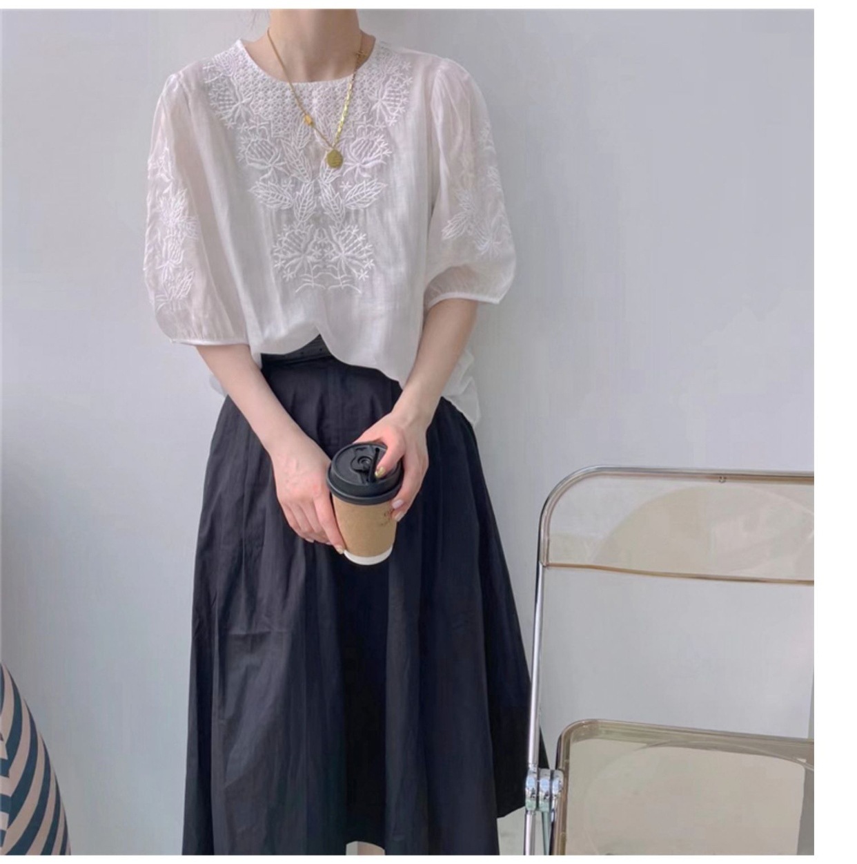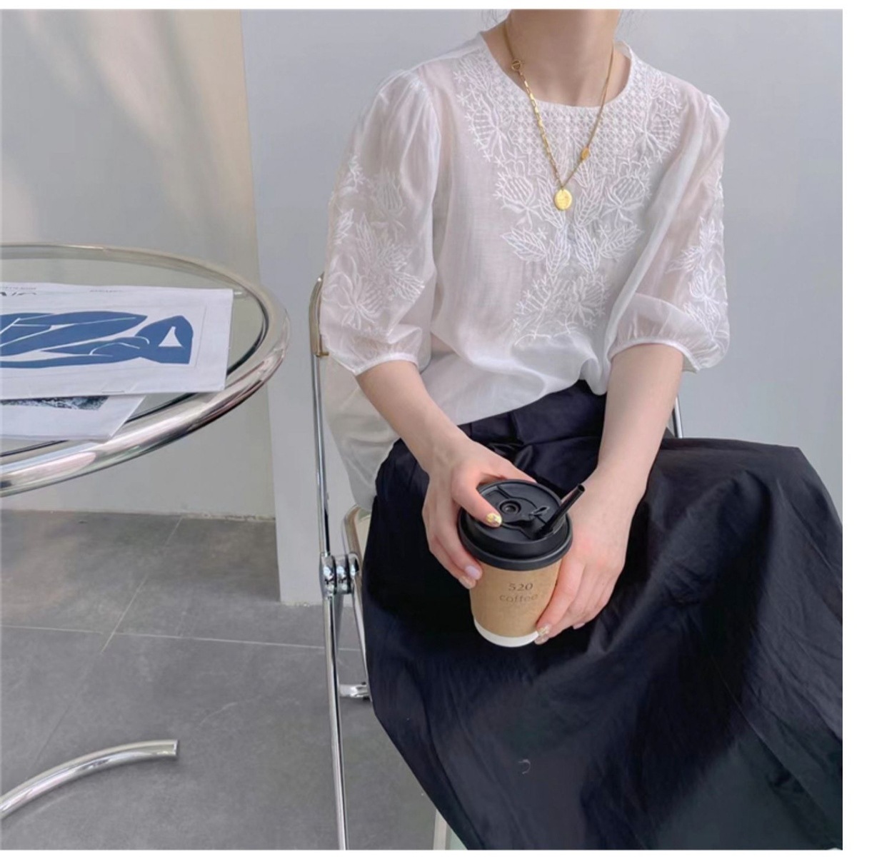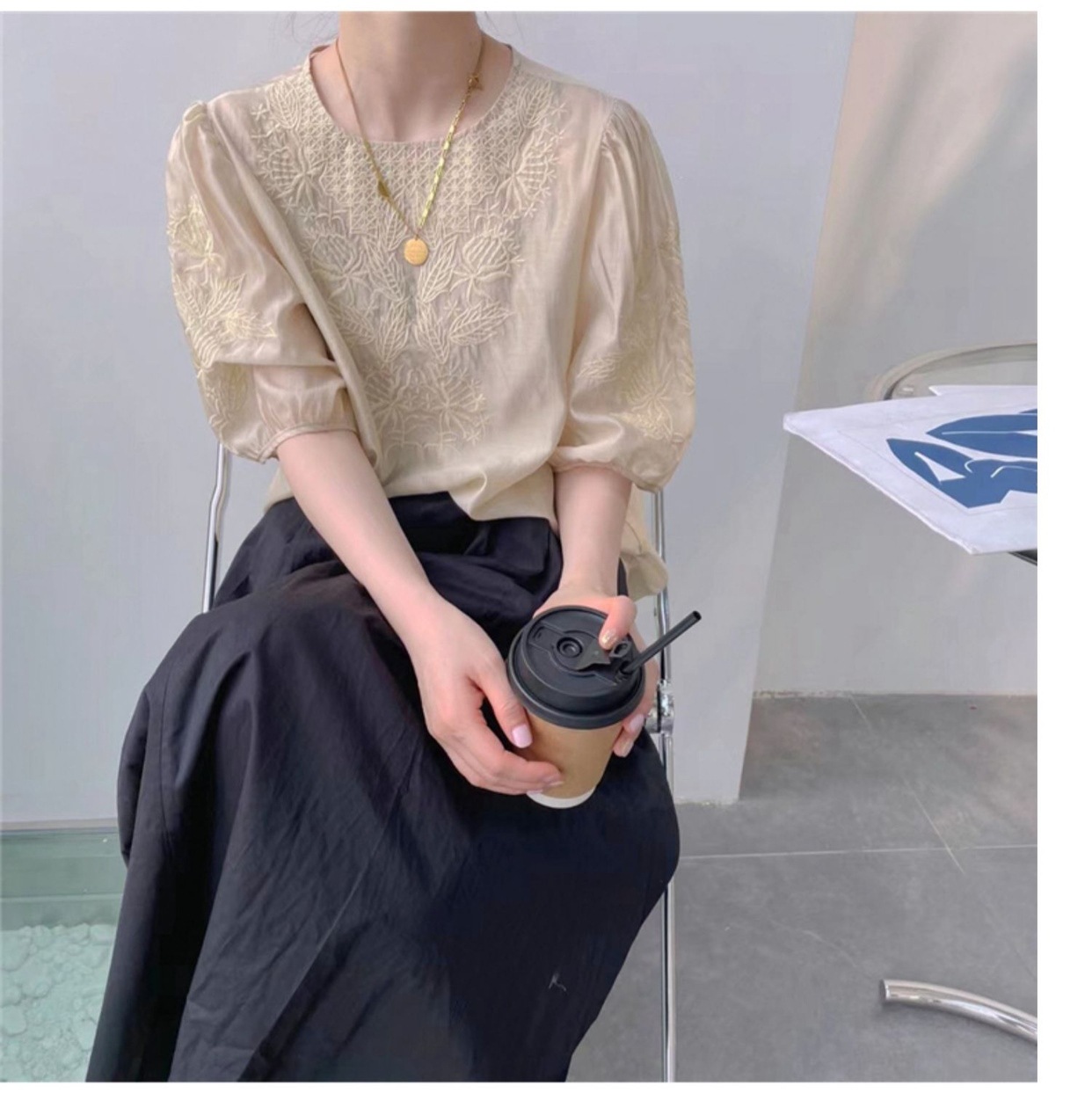 여성을위한 프랑스 복고풍 중공업 자수 셔츠 2025 여름 새로운 하이 엔드 디자인 반팔 퍼프 슬리브 탑 얇은스토어 가기