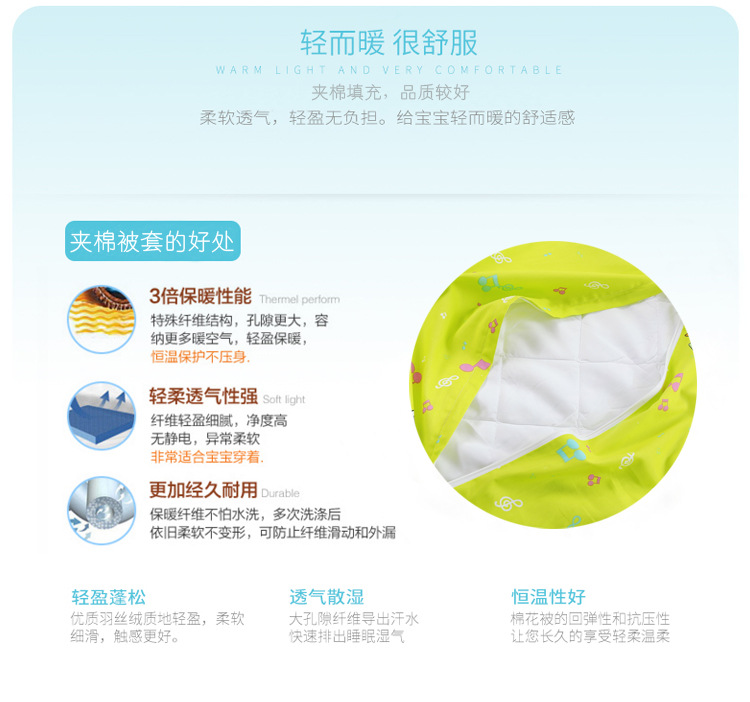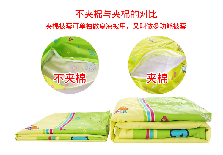 答:夹棉被套是在原被套的基础上,被套里面加了一张棉和一层布,夏天的时候可 直接做夏被 ,空调被给宝宝盖。到了冬天把被芯再放进去就可以了。