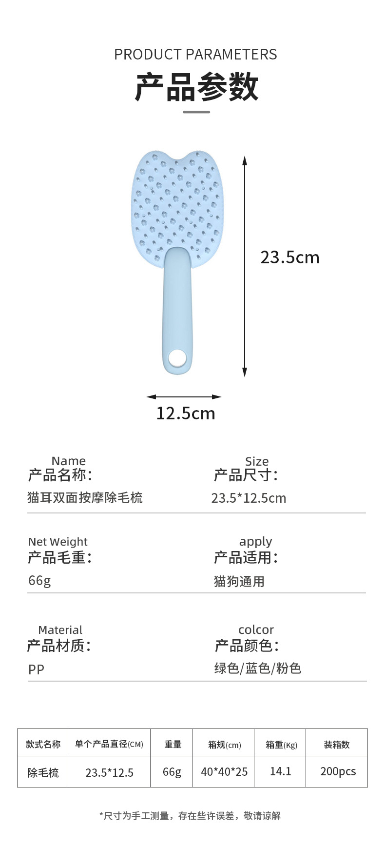 제조업체 도매 양면 마사지 플로팅 헤어 빗 제모 브러시는 피부를 보호하고 양면으로 사용할 수 있습니다. 애완 동물 목욕 마사지 빗