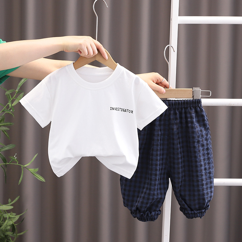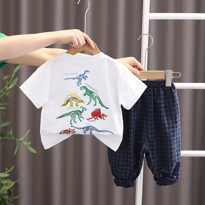 아기 유행 투피스 여름 새 스타일 한국어 스타일 편지 반팔 공룡 와이드 레그 팬츠 소녀, 소년 및 어린이를위한 캐주얼 슈트스토어 가기