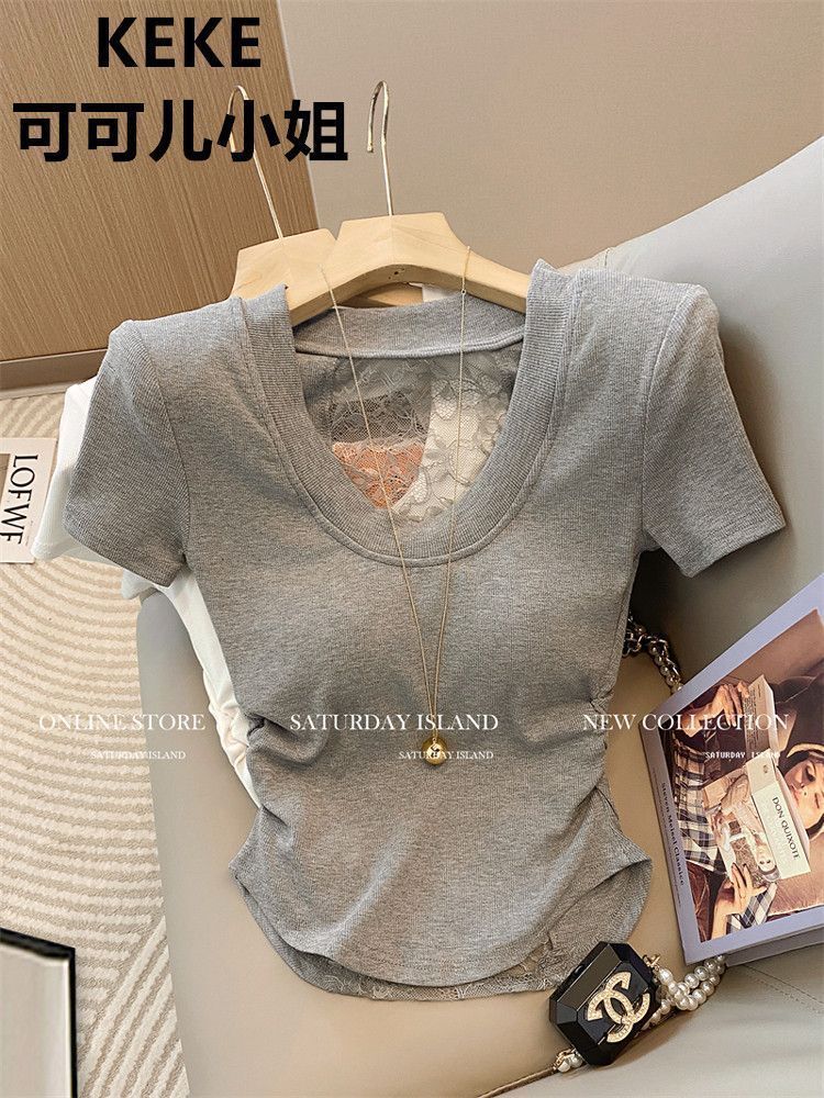 슈퍼 터치 모달 코튼 ~ 프렌치 디자인 레이스 스플리싱 U 넥 반팔 티셔츠 여성 여름 신작 플리츠 탑
