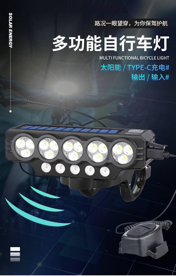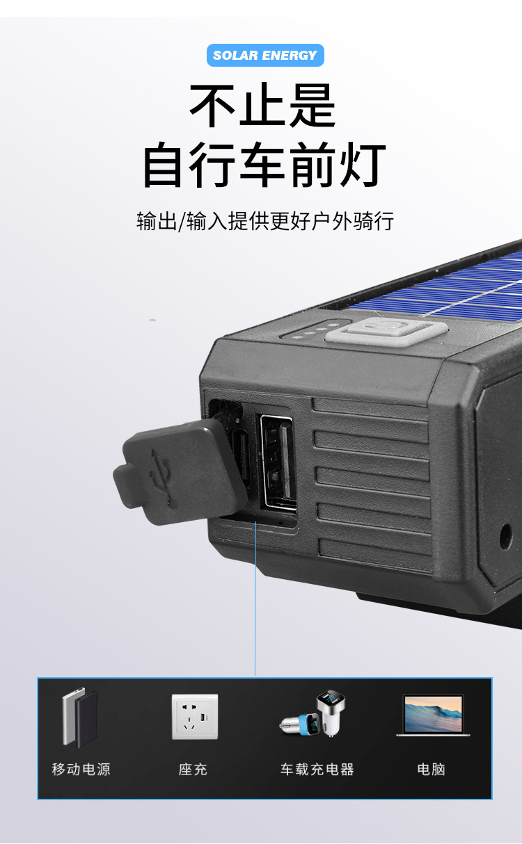 태양광 자전거 하이빔 및 로우빔 헤드라이트 USB 충전식 경적 사이클링 라이트 900 루멘 긴 배터리 수명 야간 사이클링 슈트