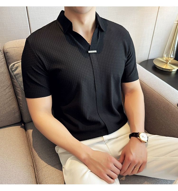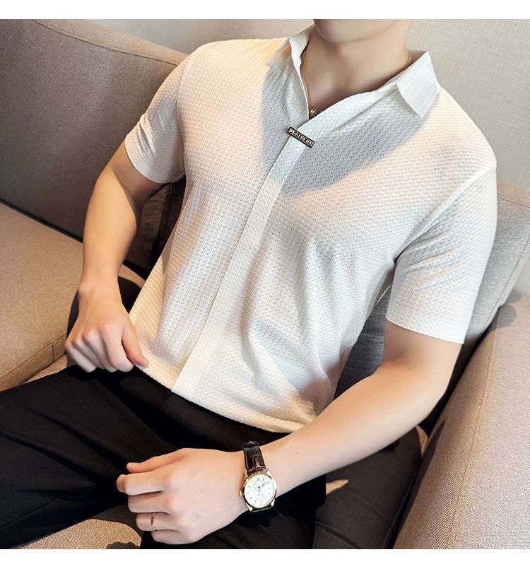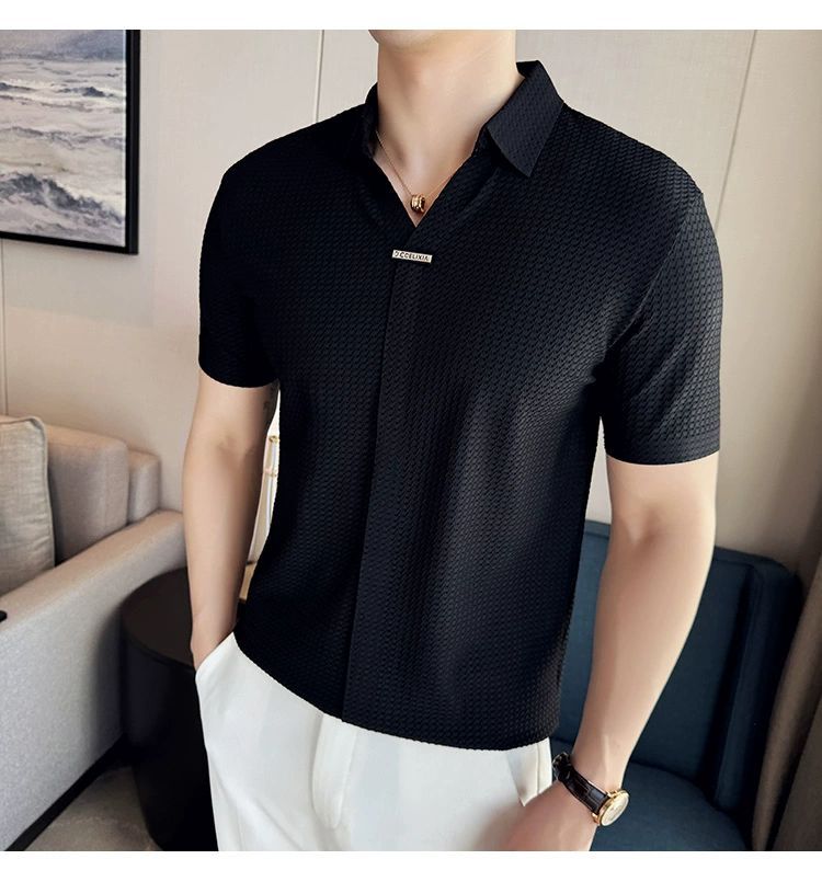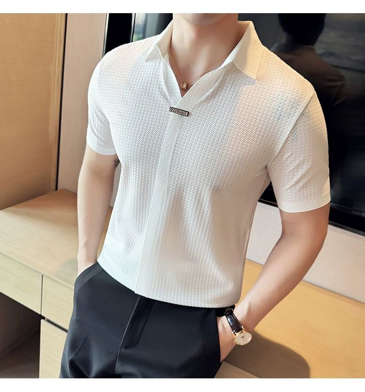 남성용 V 넥 반팔 폴로 셔츠 여름 새로운 고품질 패션 슬림 한국 스타일 영국 스타일 아이스 실크 심리스 티셔츠스토어 가기