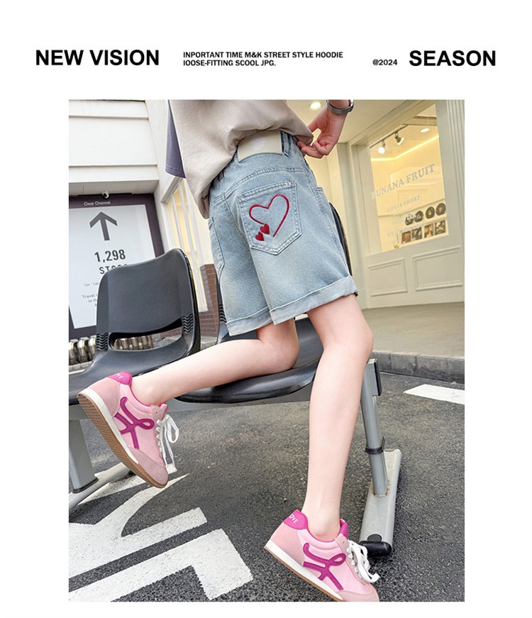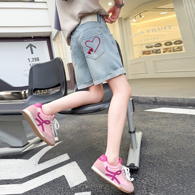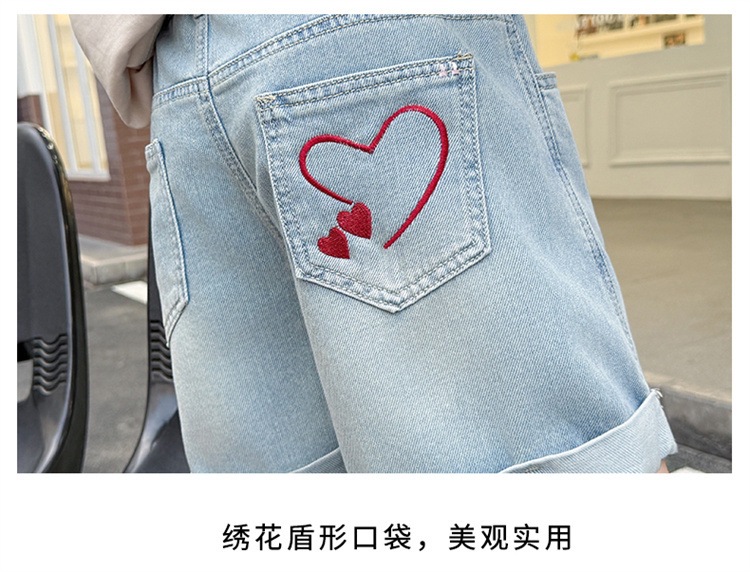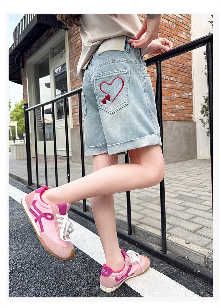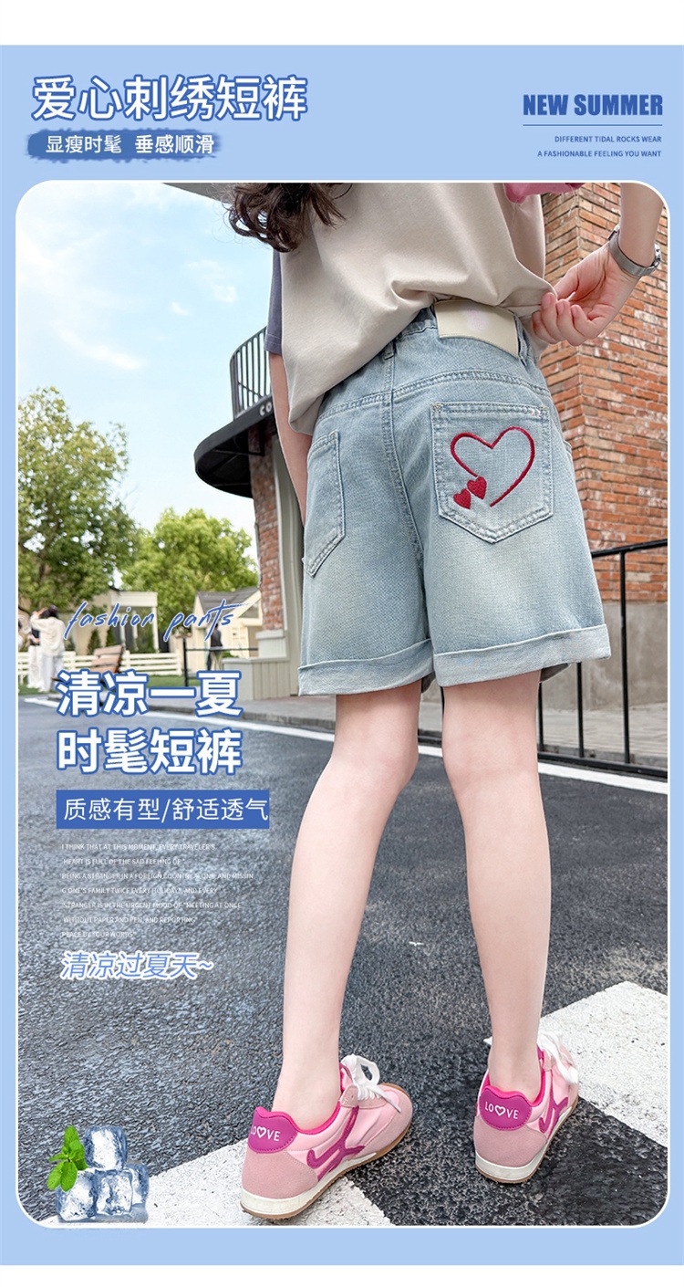 여자 데님 반바지 2025 새로운 여름 스타일 어린 소녀 유행 뒷주머니 사랑 자수 얇은 핫 팬츠 유행스토어 가기