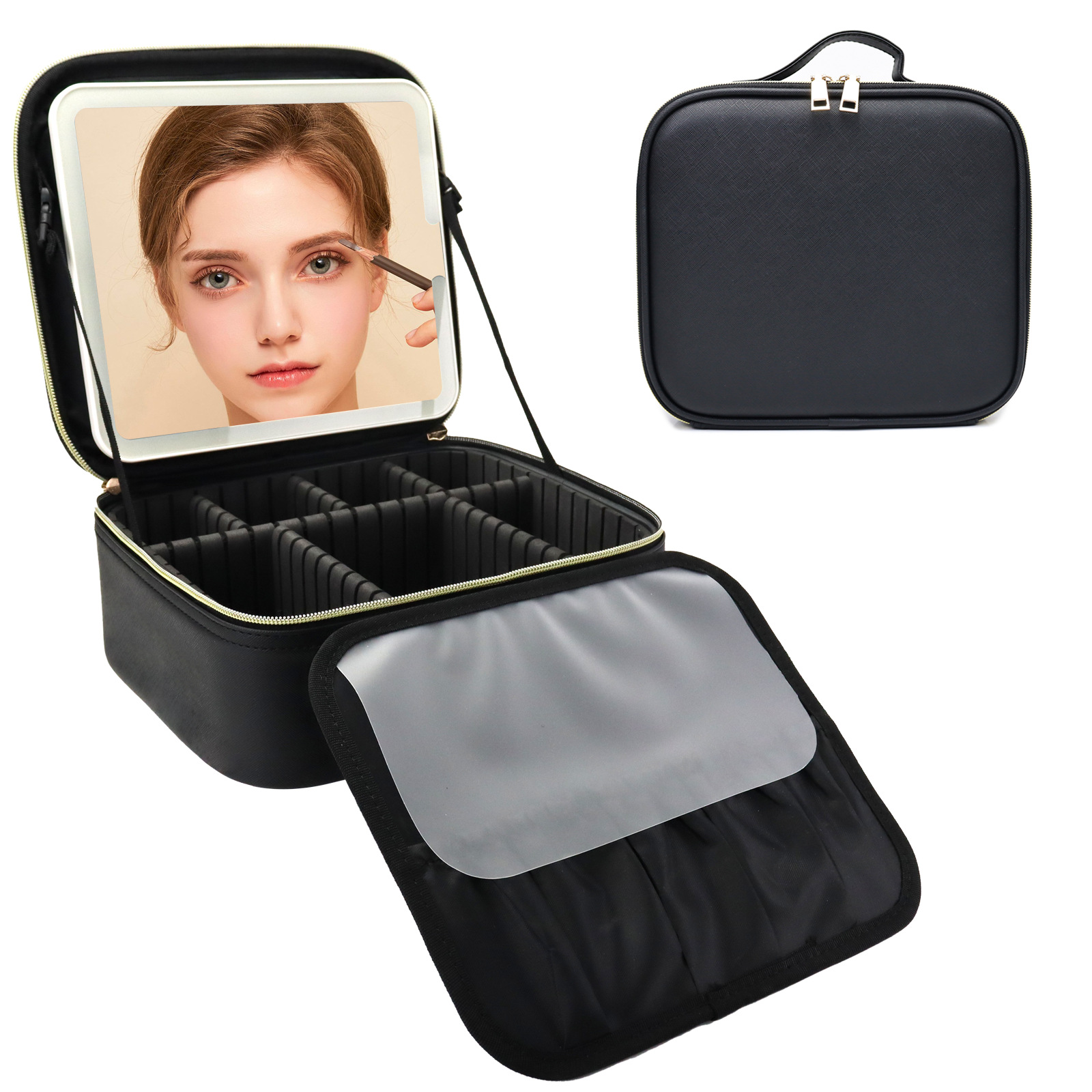 여성을위한 고급 LED 거울 여행 화장품 가방 휴대용 대용량 메이크업 브러쉬 케이스 휴대용 파티션 뷰티 가방