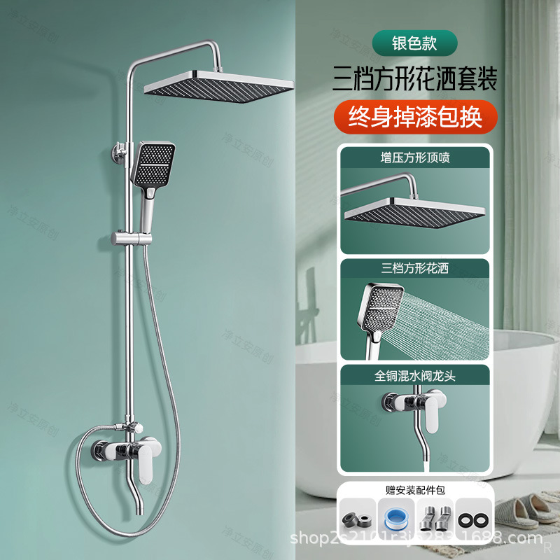 • 심플 실버[모두 구리●3단계 물 배출구】사각 샤워 세트●10년 보증