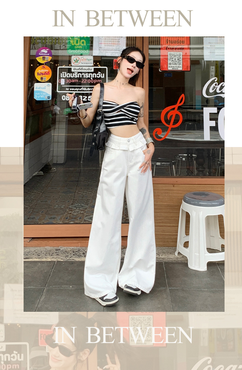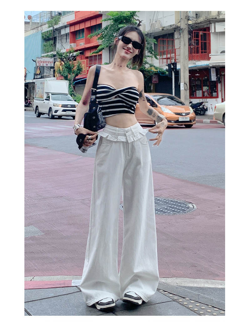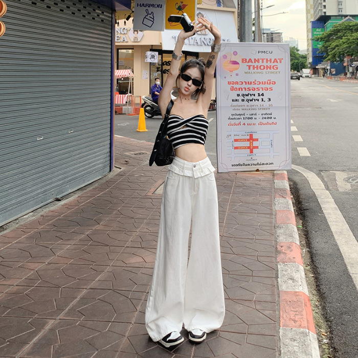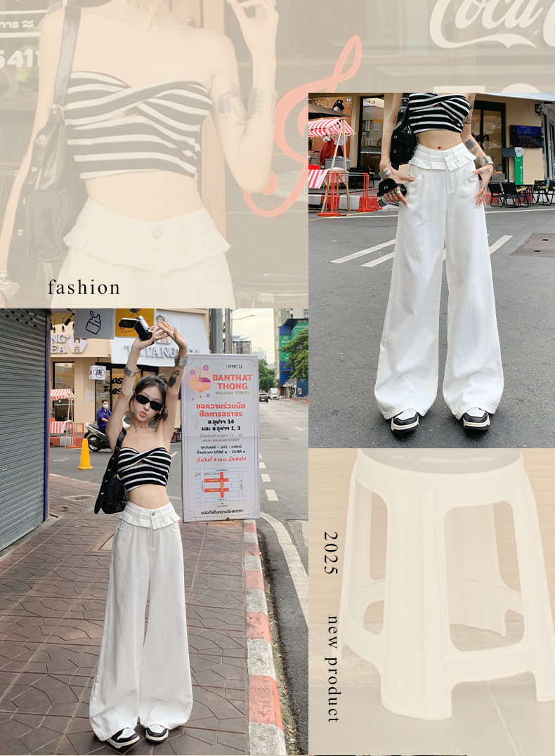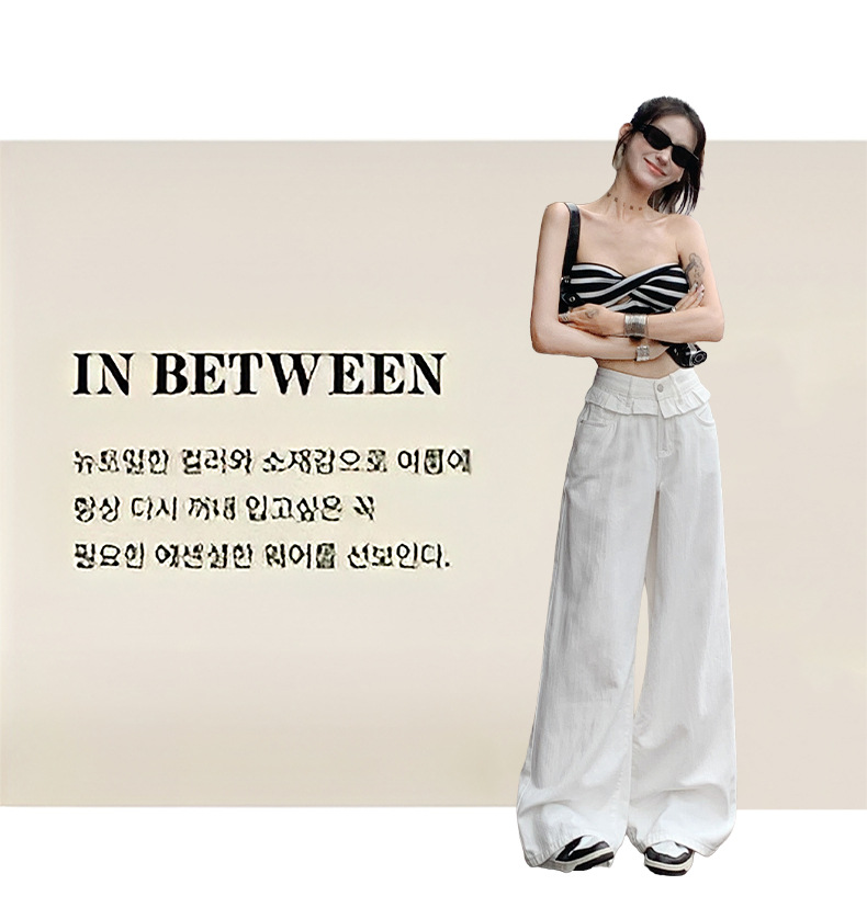 여름 여성용 화이트 레이스 스트레이트 청바지, 플리츠 디자인, 아메리칸 핫걸 루즈하고 드레이프한 와이드 팬츠스토어 가기