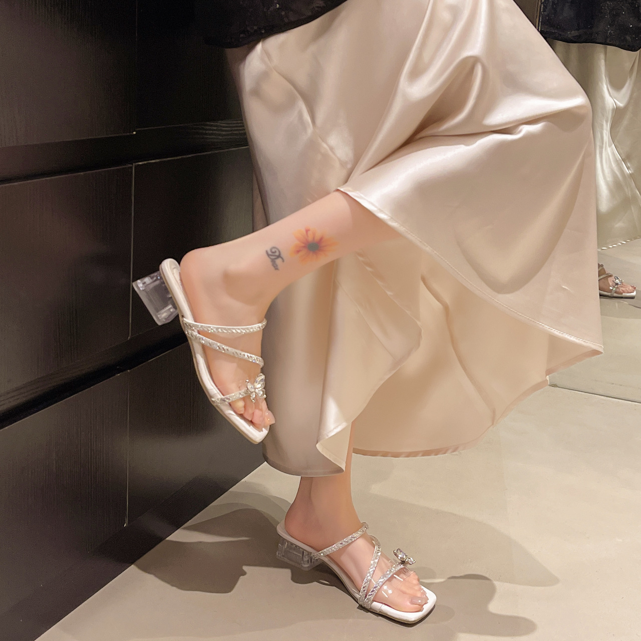 여성을위한 프랑스 크리스탈 두꺼운 굽 슬리퍼 2025 여름 새로운 스타일 라인 석 나비 요정 겉옷 기질 하이힐 샌들