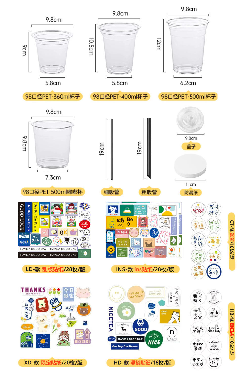 • 400ml에는 평면 뚜껑, 누수 방지 종이 스티커 및 빨대가 함께 제공됩니다.
