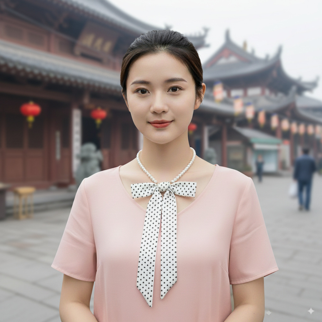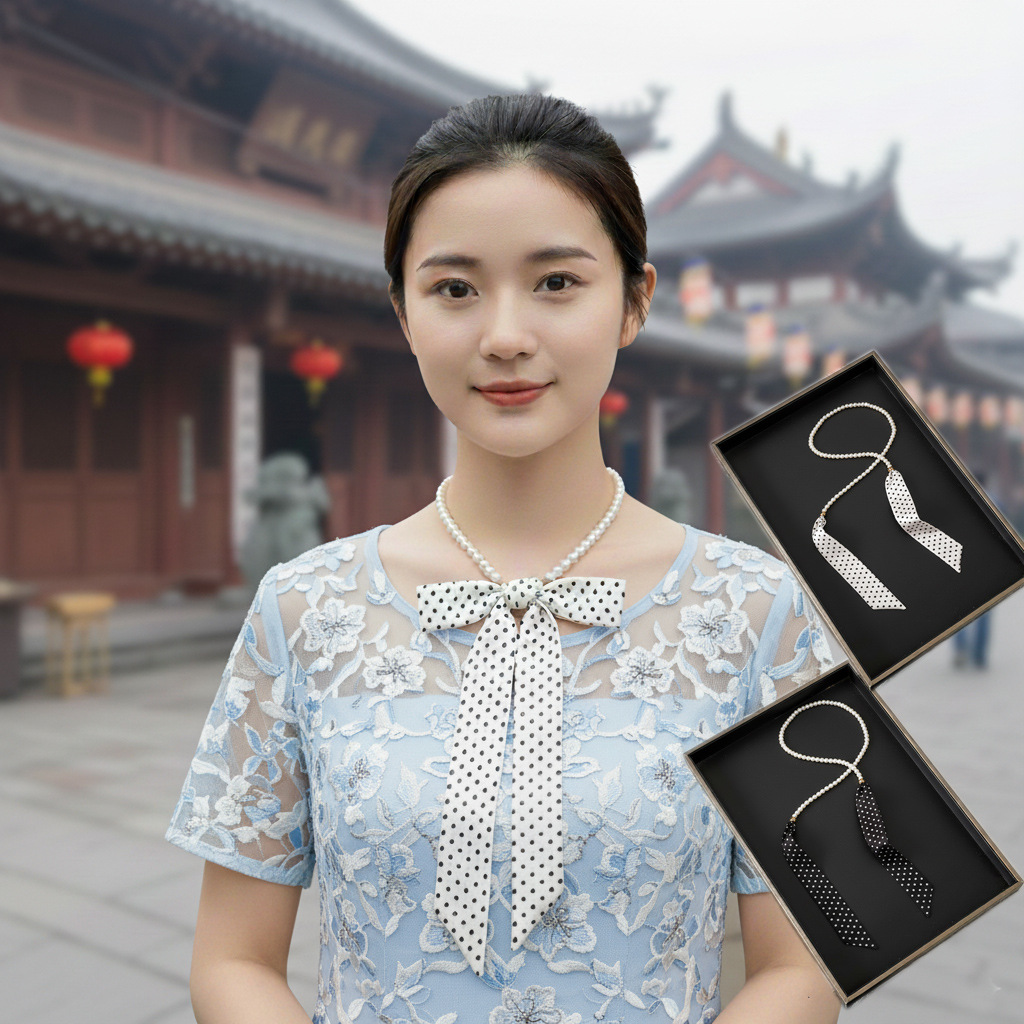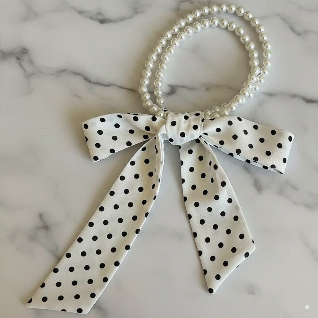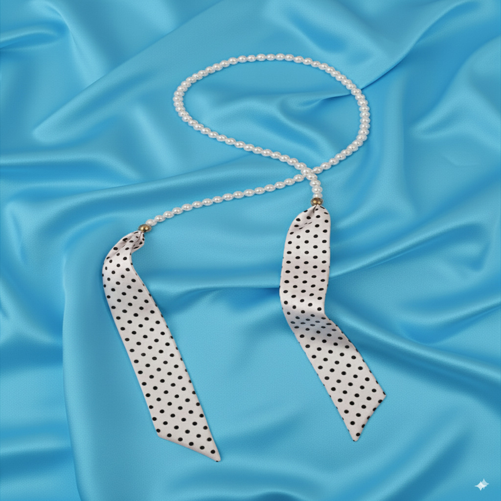 여름 실크 스카프 레트로 진주 목걸이 물방울 무늬 롱 스카프 리본 장식 스카프 2025 봄 여름 여성용 헤어밴드