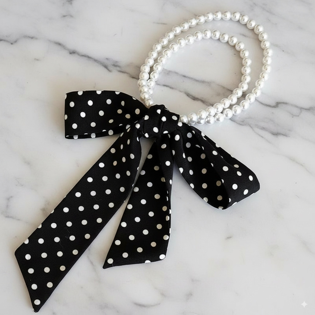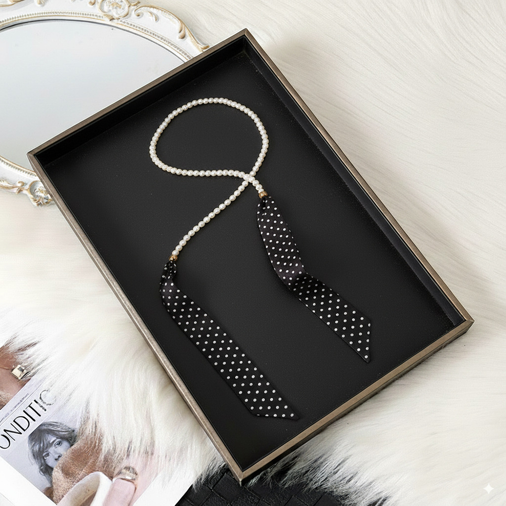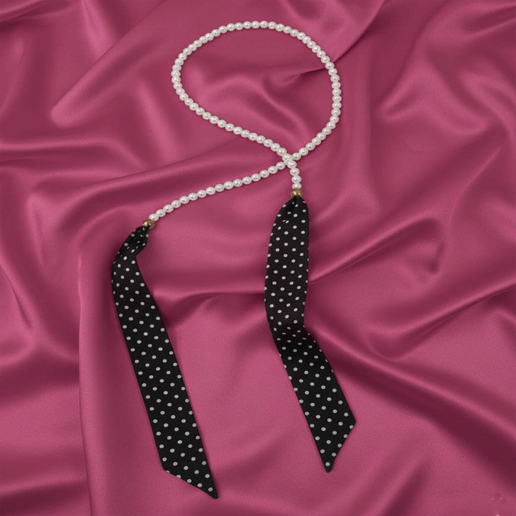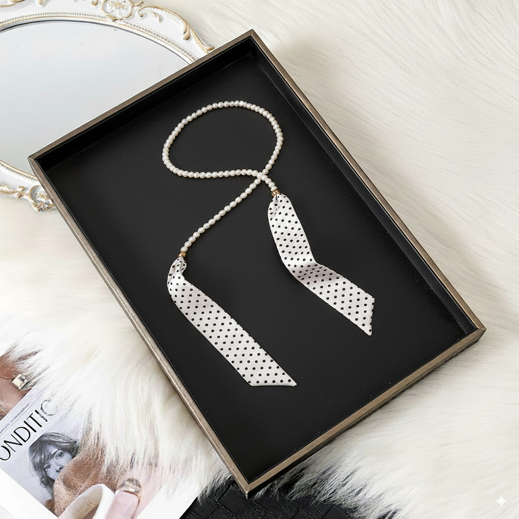• 진주 목걸이 실크 스카프 블랙 폴카 도트