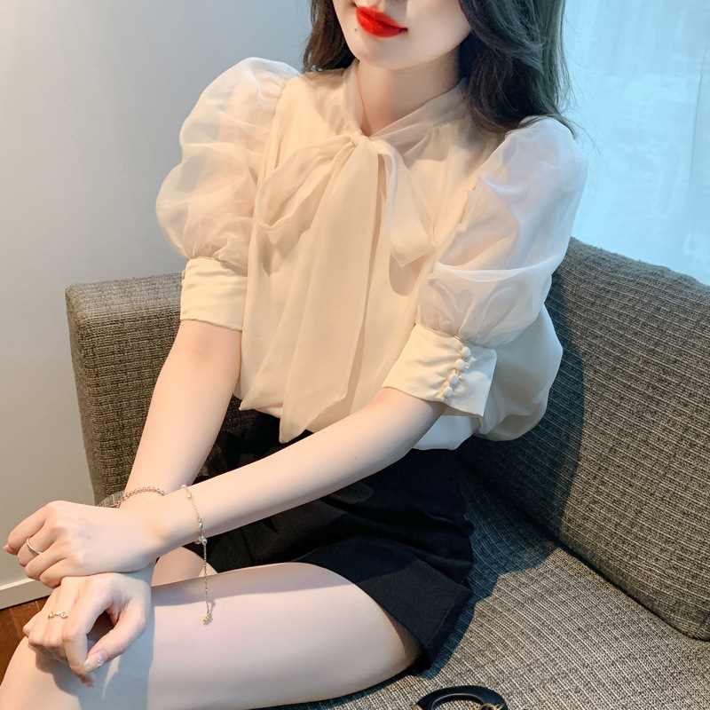 여성을위한 퍼프 슬리브 반팔 셔츠 여름 2025 새로운 보우 쉬폰 탑 틈새 시크하고 아름다운 셔츠스토어 가기