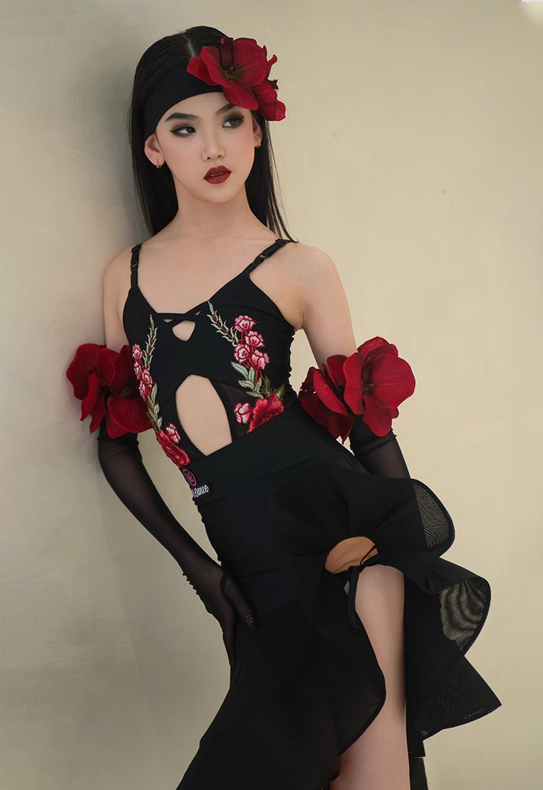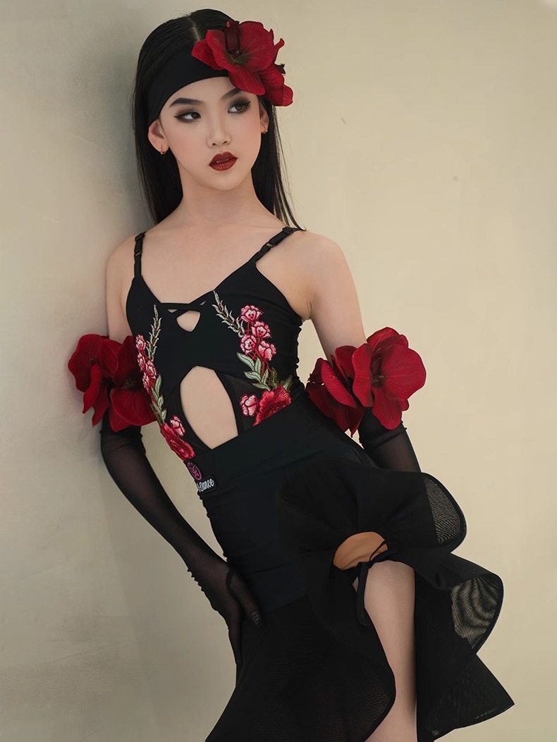 새로운 스타일의 여자 라틴 댄스 시험 정장, 우아한 검정색과 빨간색 꽃무늬 퍼포먼스 슈트, 신비한 몸매를 보여주는 남자