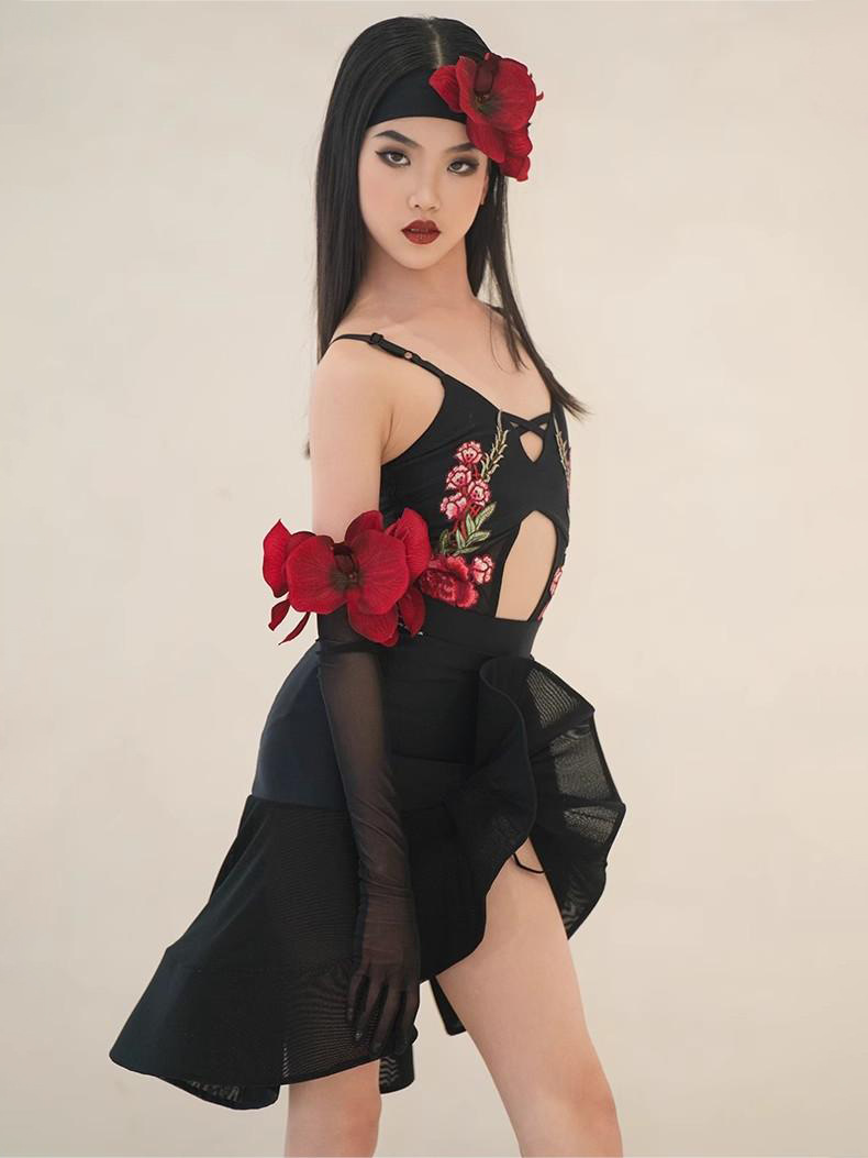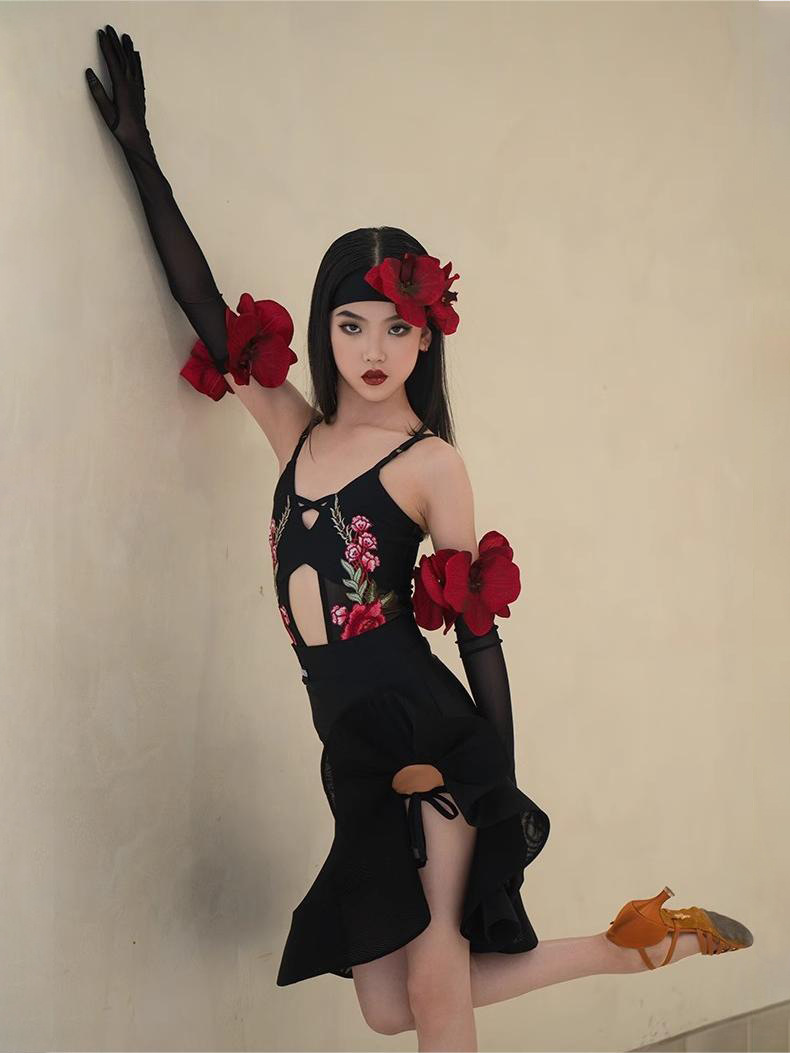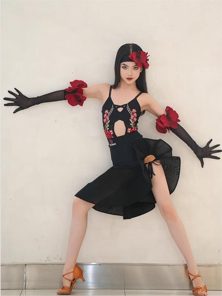 새로운 스타일의 여자 라틴 댄스 시험 정장, 우아한 검정색과 빨간색 꽃무늬 퍼포먼스 슈트, 신비한 몸매를 보여주는 남자스토어 가기