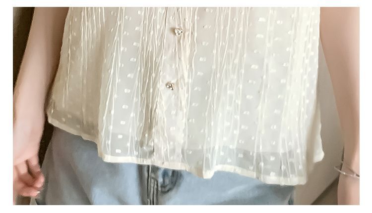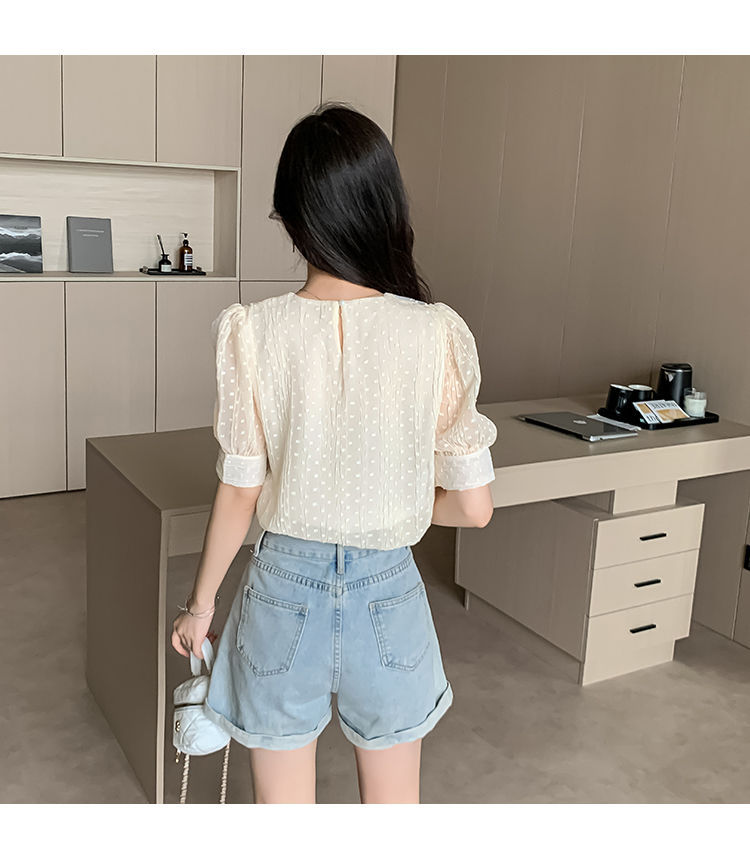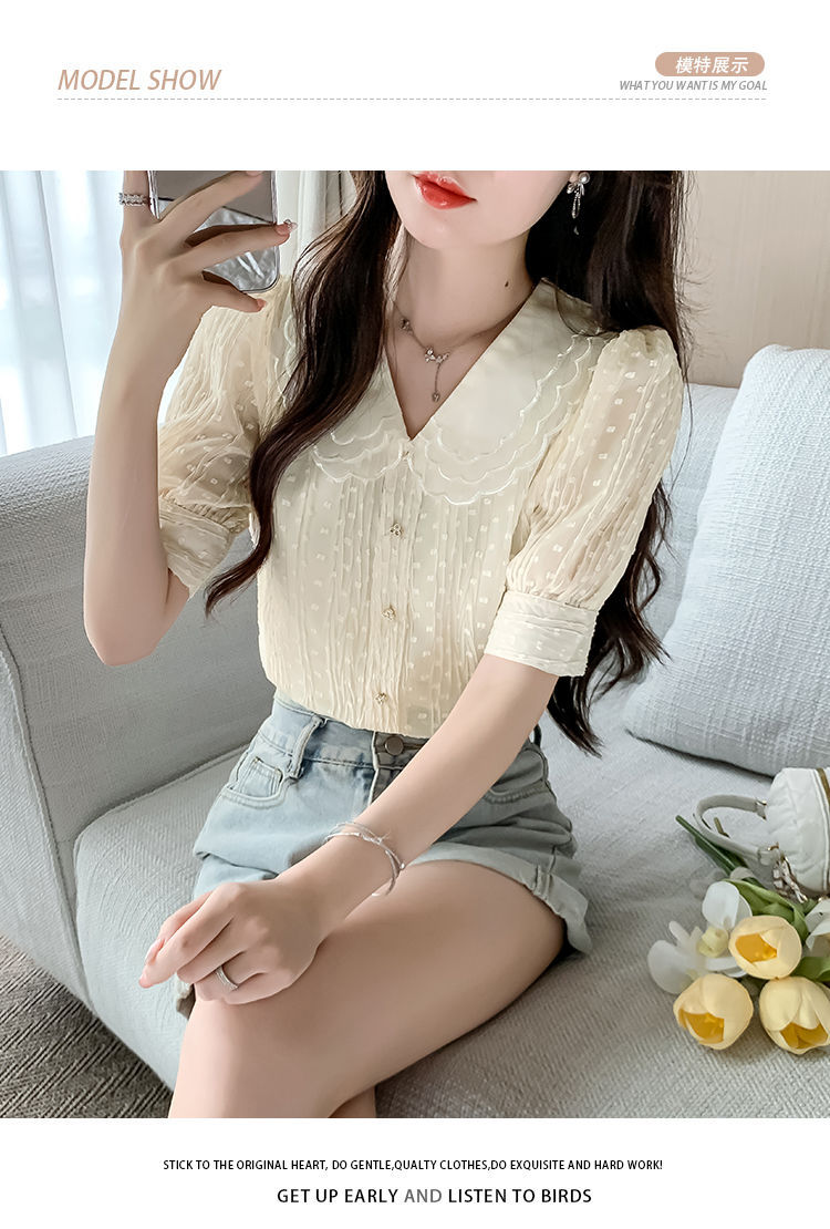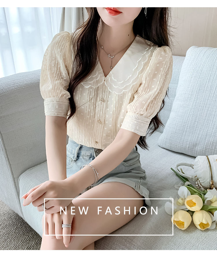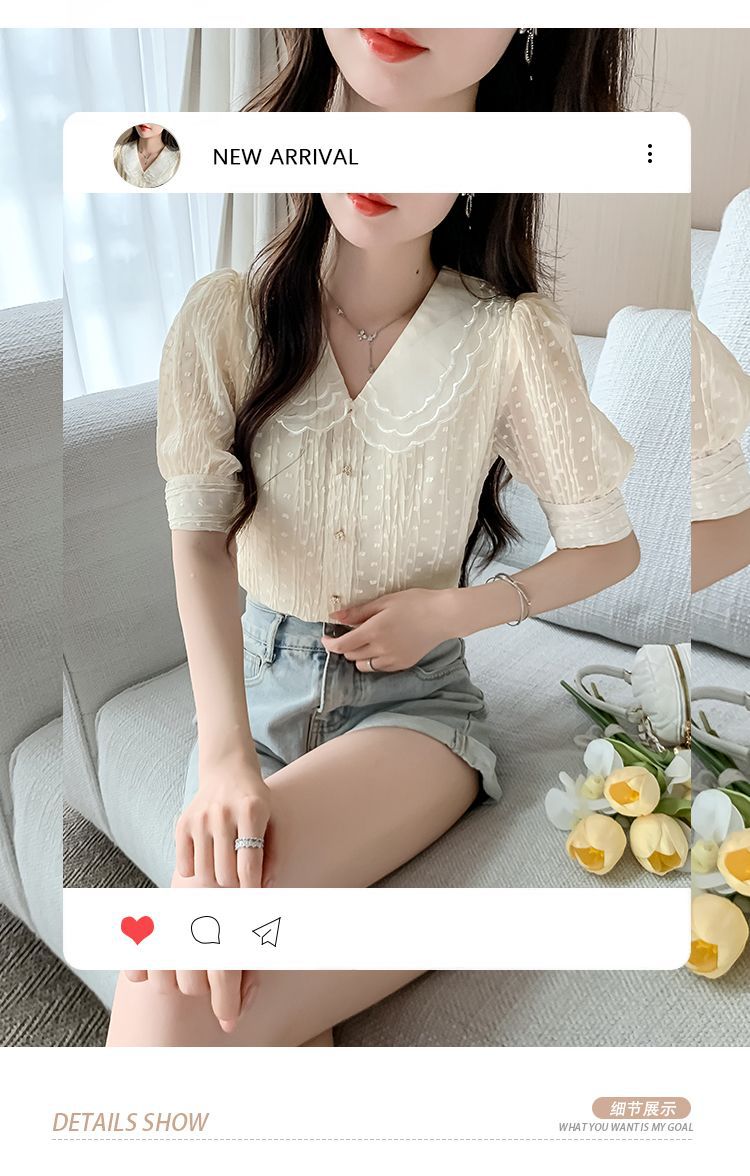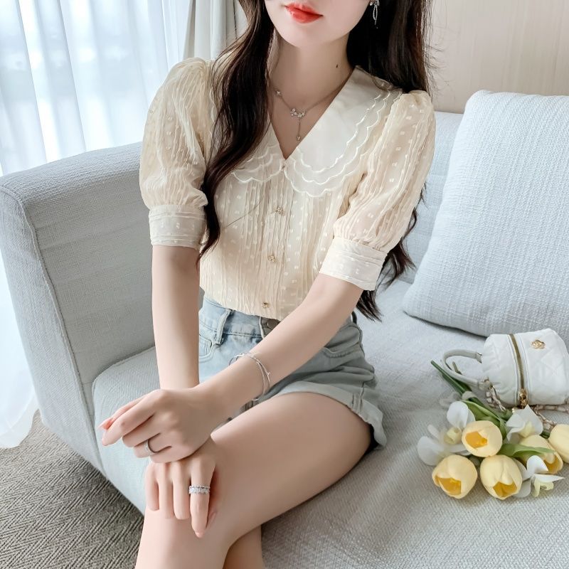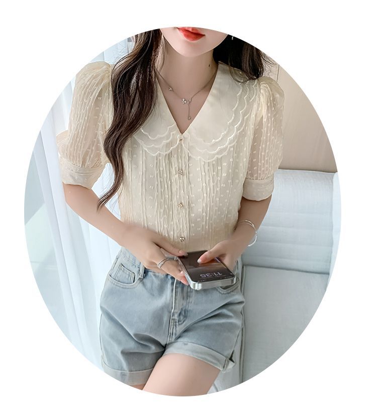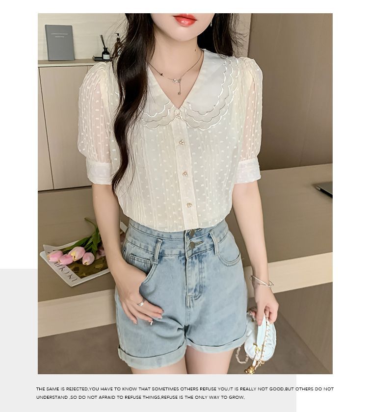 2025년 여름 여성을 위한 새로운 반팔 인형 칼라 쉬폰 셔츠, 달콤한 기질, 연령 감소, 부드러운 퍼프 슬리브 틈새 시장