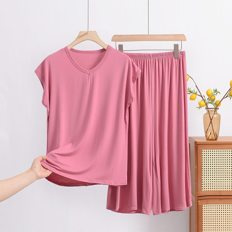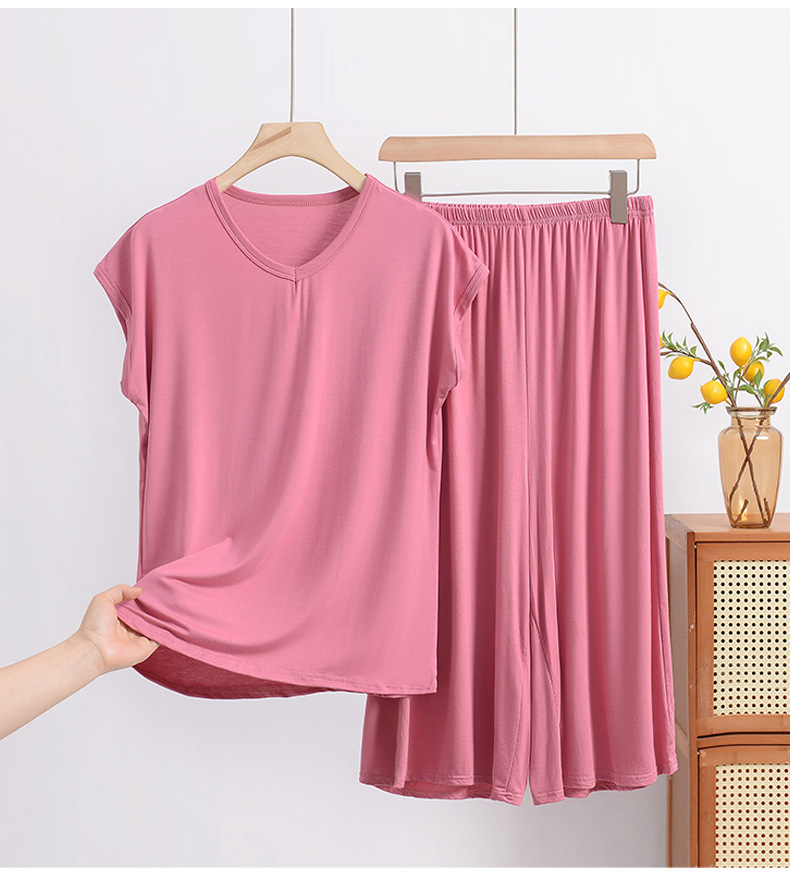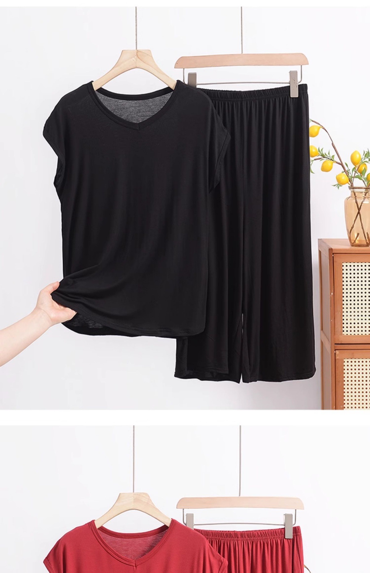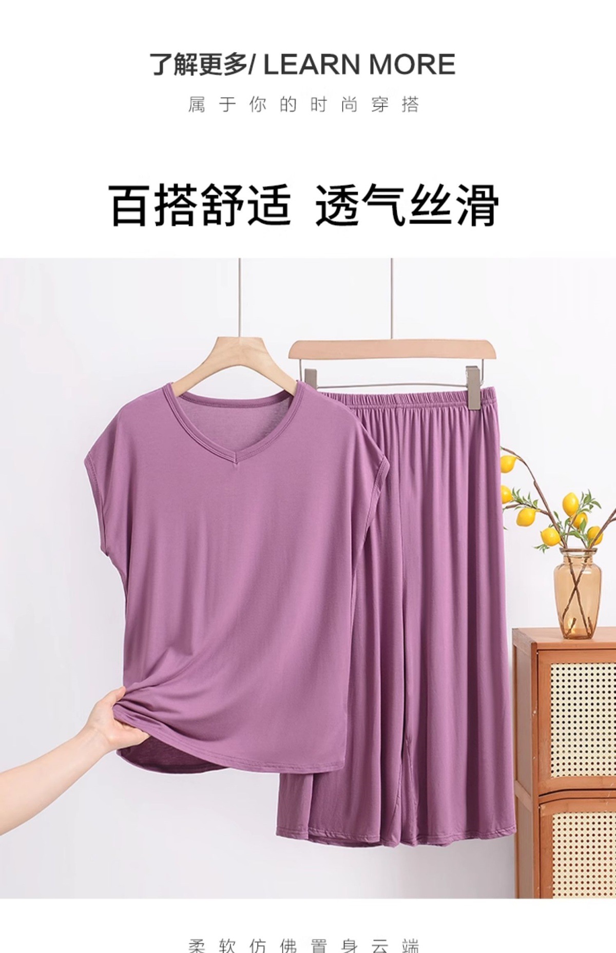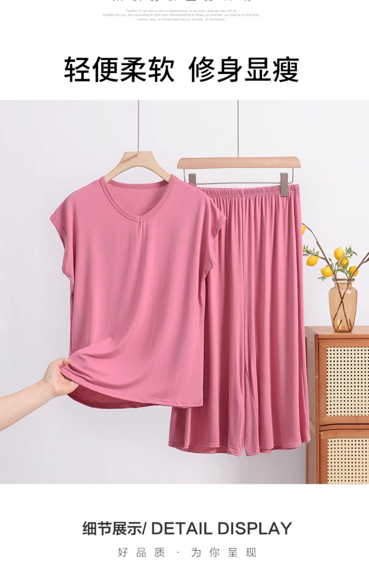 여름 얇은 모달 v 넥 조끼 크롭 바지 투피스 세트 여성용 대형 잠옷 파자마 바지 루즈 아우터 슈트