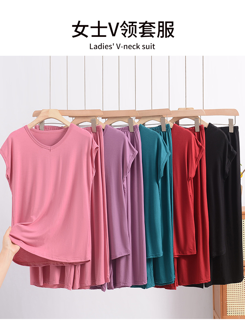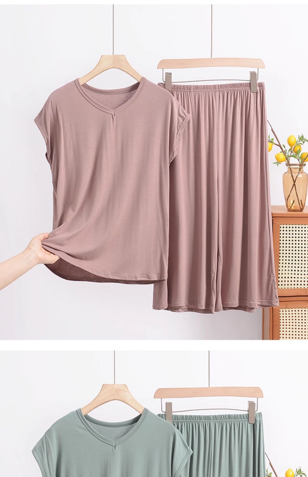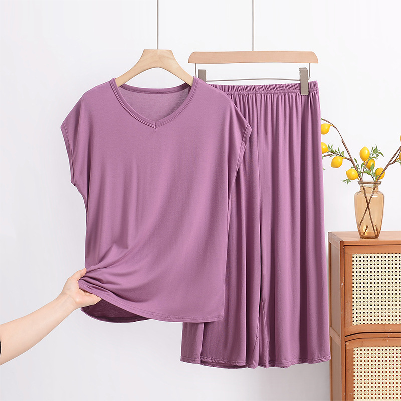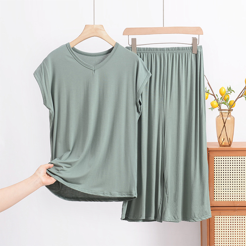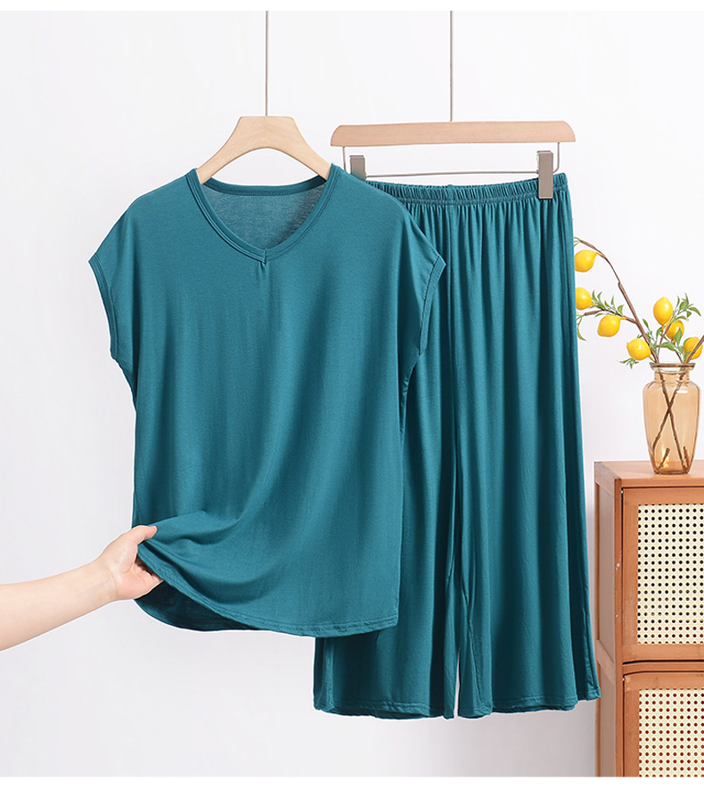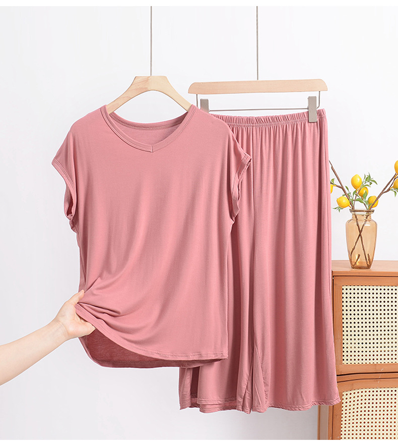여름 얇은 모달 v 넥 조끼 크롭 바지 투피스 세트 여성용 대형 잠옷 파자마 바지 루즈 아우터 슈트