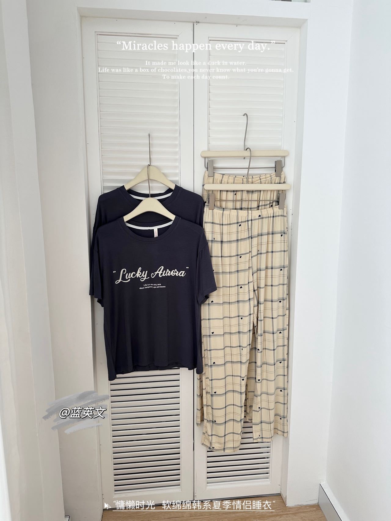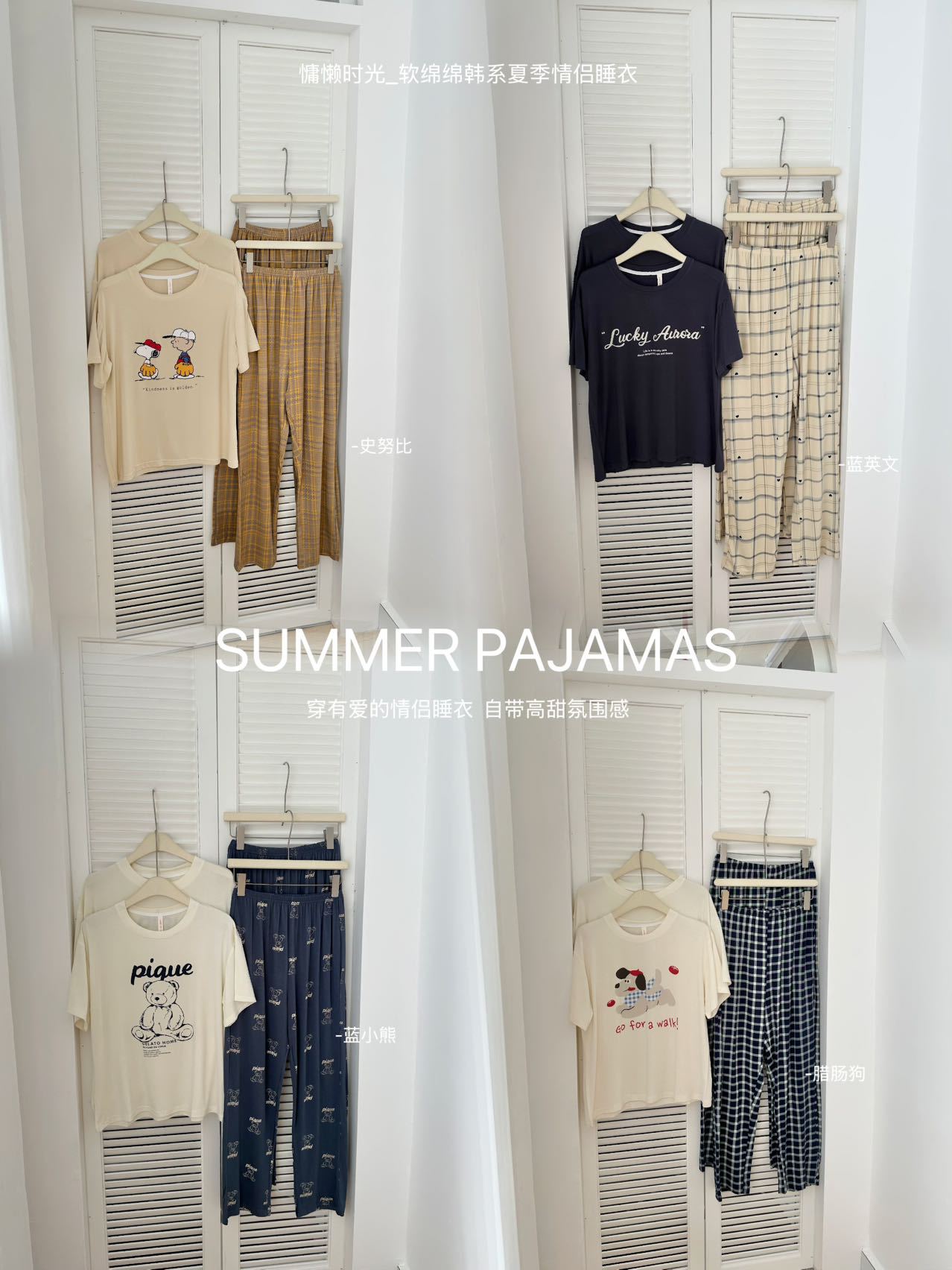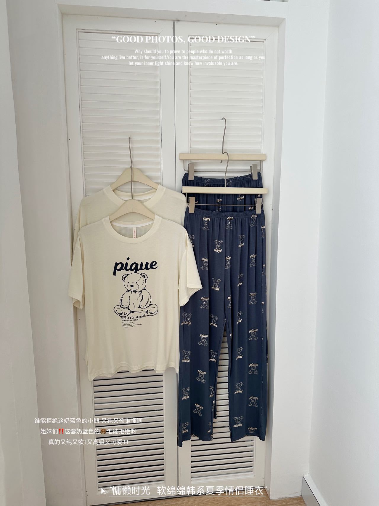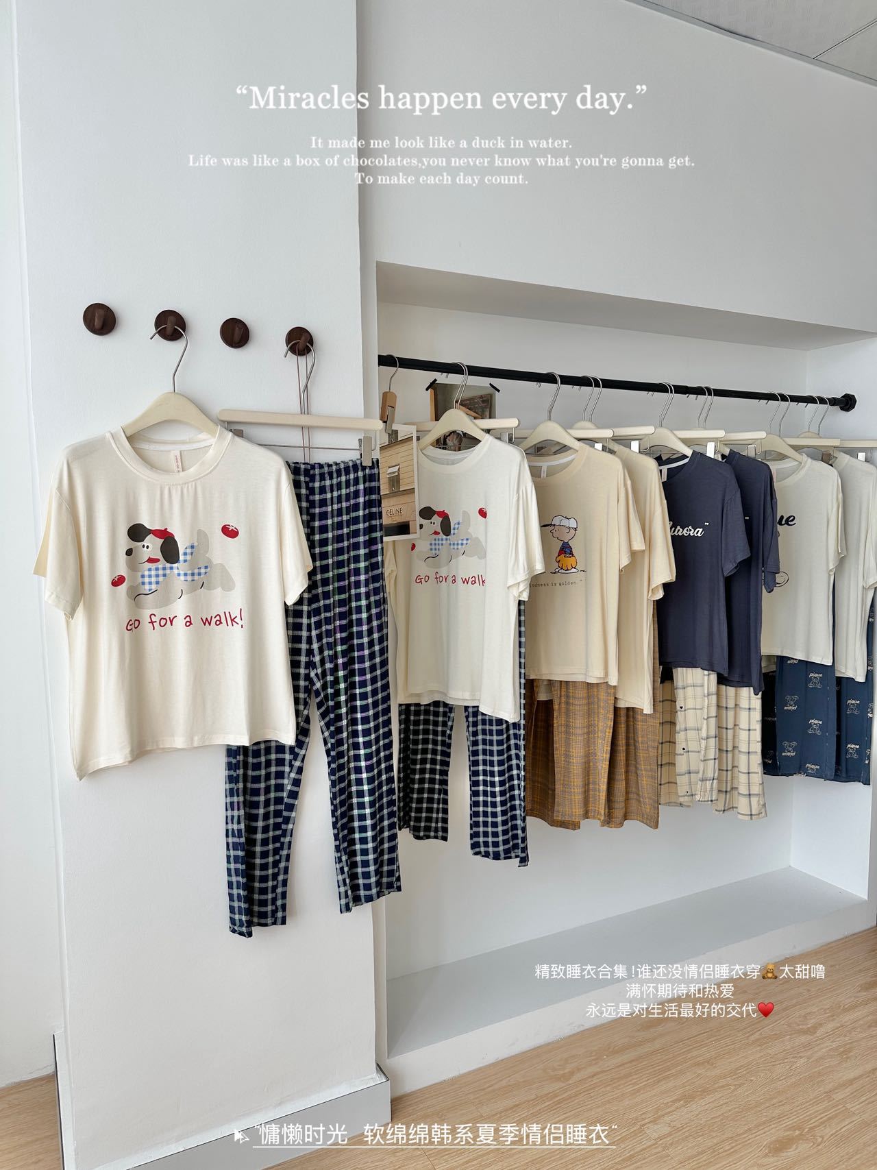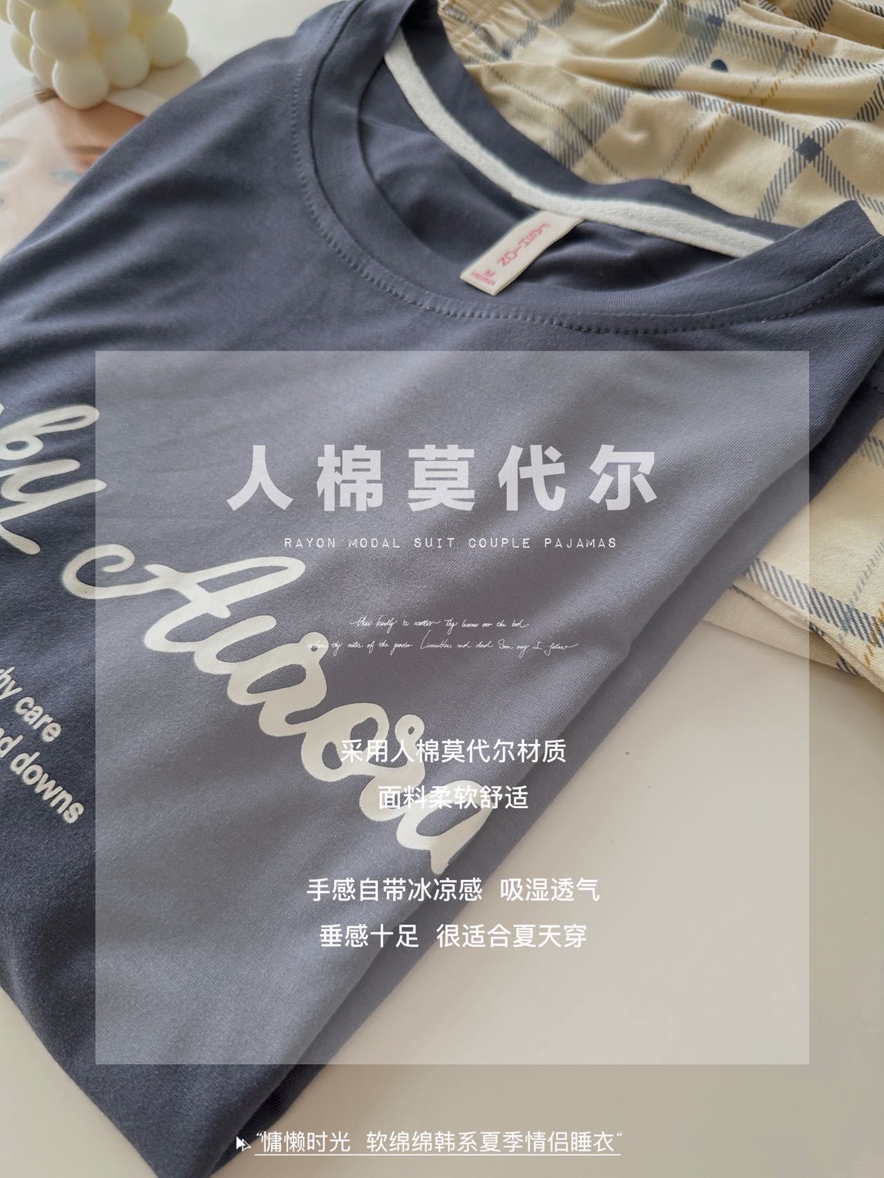 커플 잠옷 봄과 여름 모달 얇은 반팔 바지 2025 새로운 남성과 여성의 만화 가정 의류 세트스토어 가기