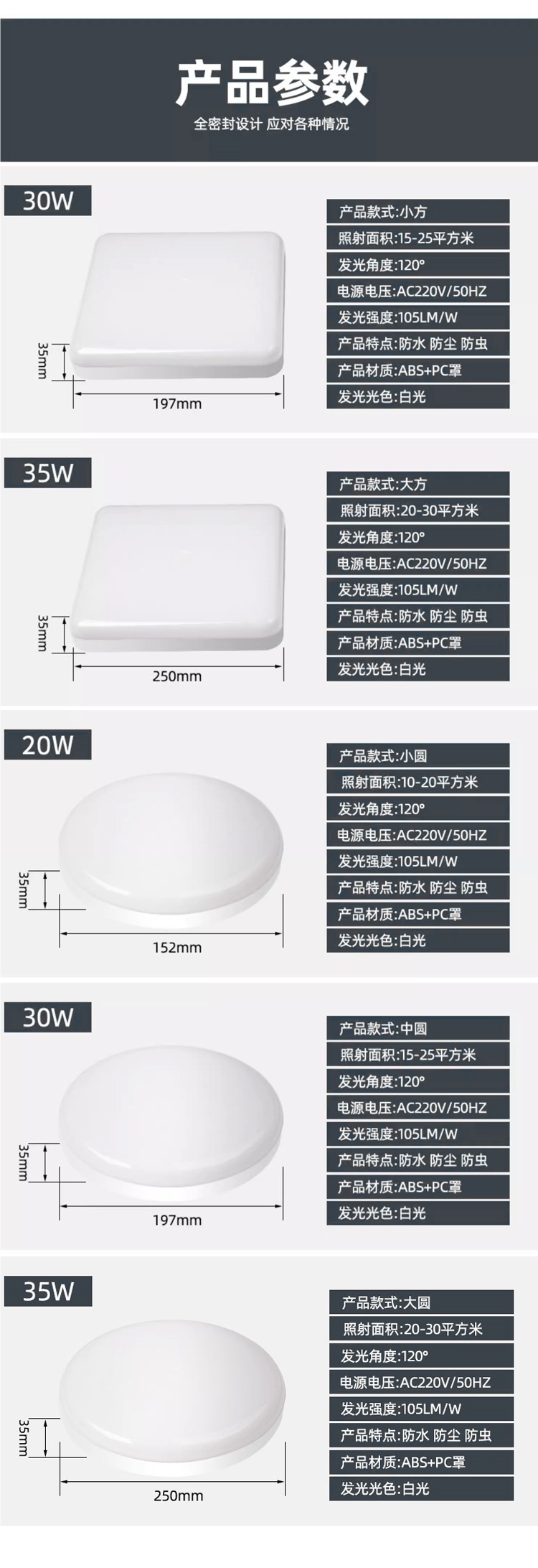 IP56 밀봉 LED 방수 및 방충 주방 및 욕실 천장 조명 욕실 화장실 방습 조명 야외 통합 3방지 조명