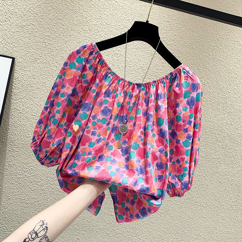 여름 여성을 위한 순수한 욕망 스타일 꽃무늬 원라인 칼라 탑, 루즈하고 슬림한 쉬폰 셔츠, 퍼프 반팔 시크하고 스타일리시한 셔츠