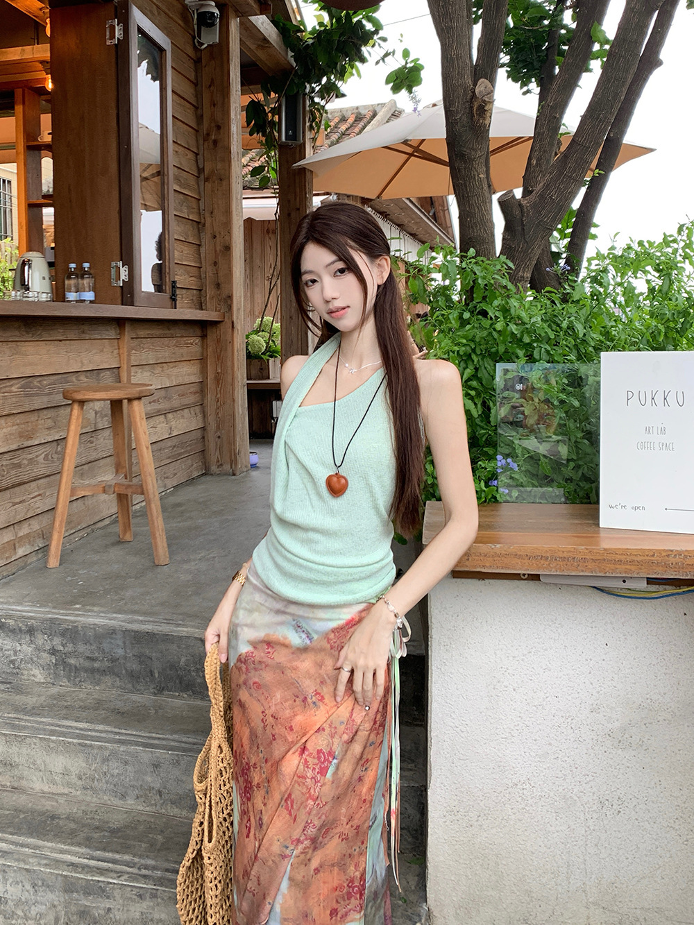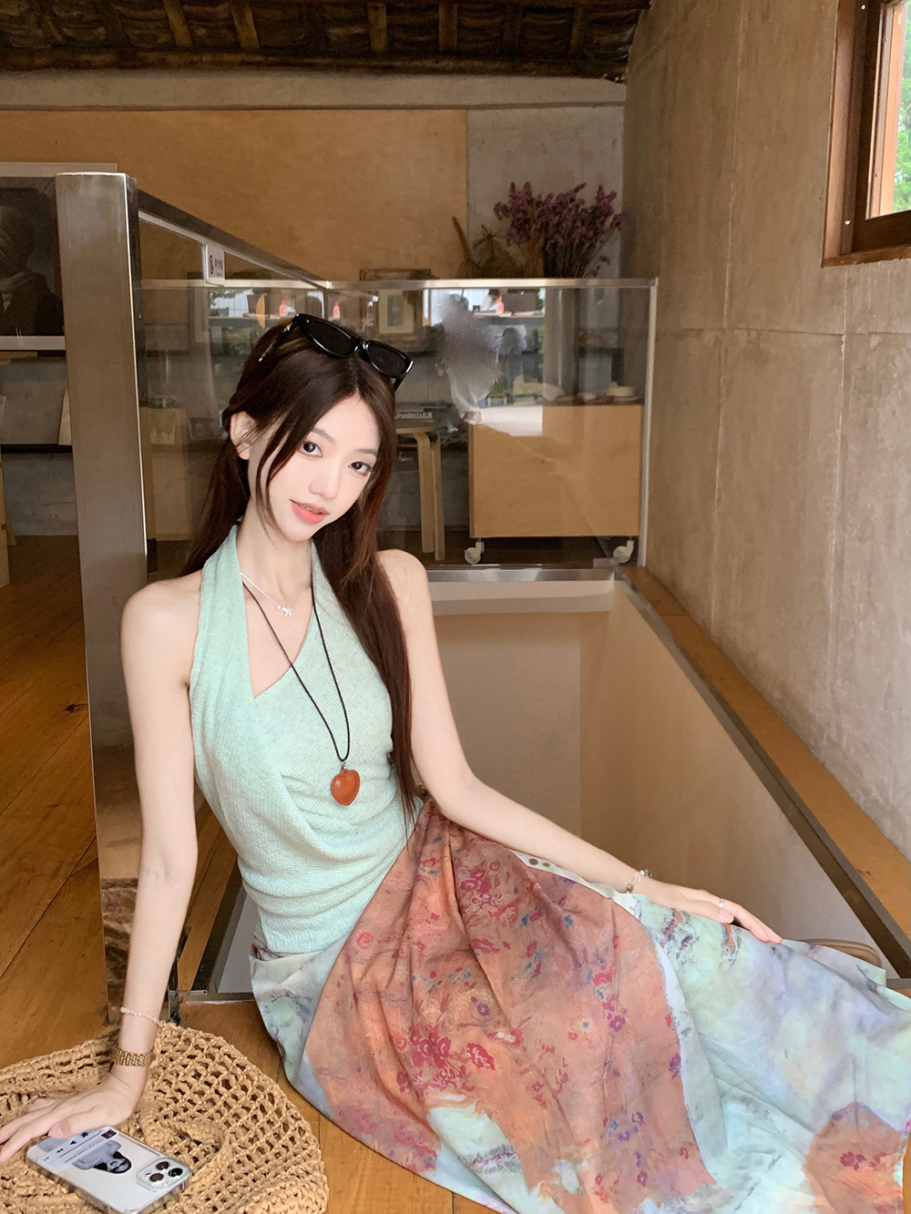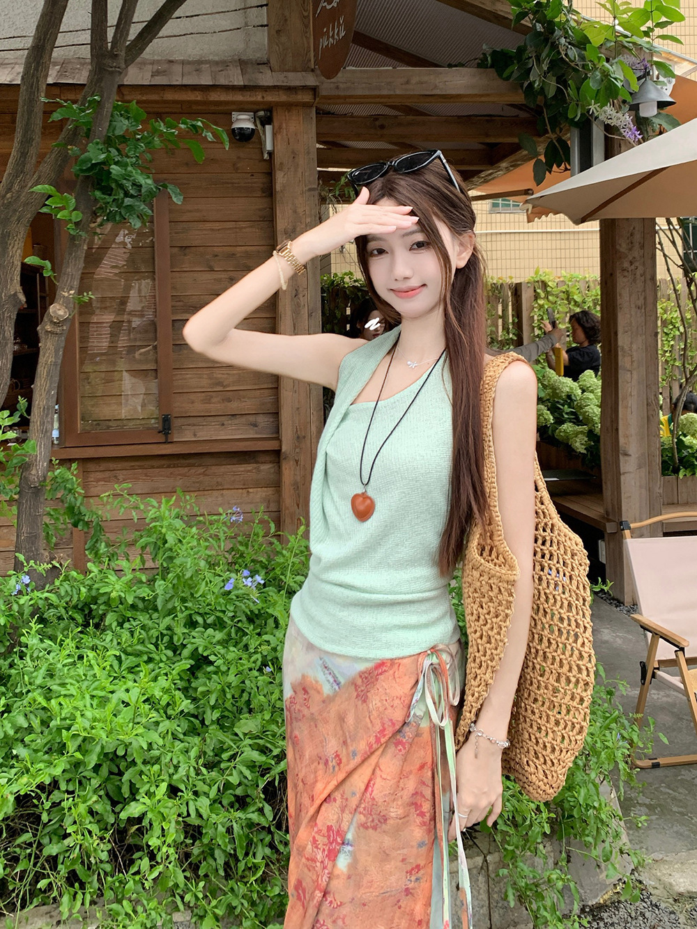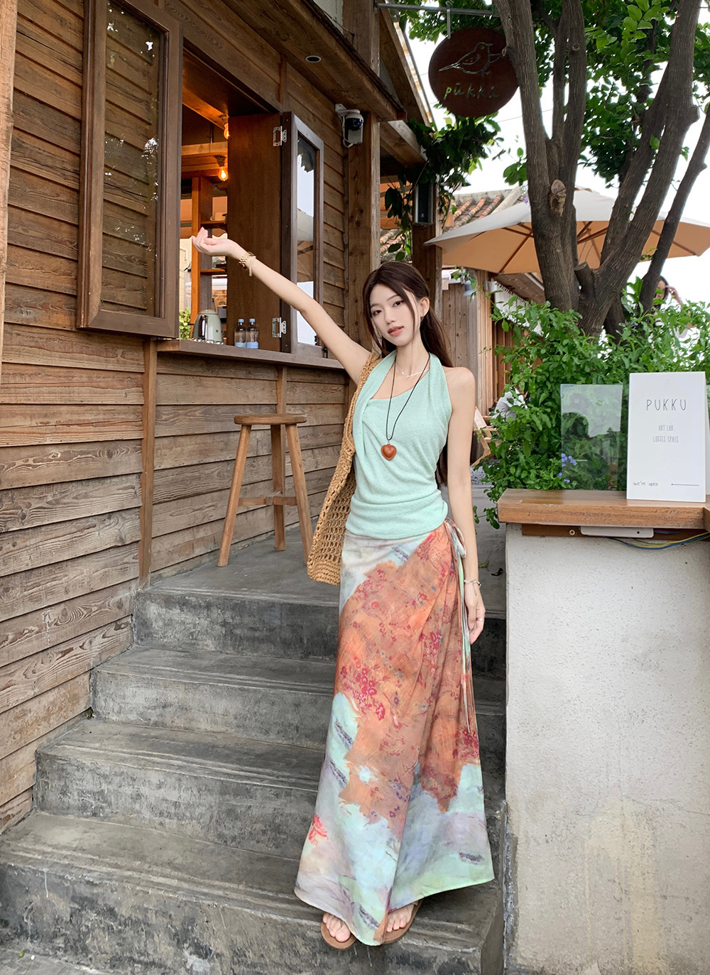 실제 사진 ~ 민트 맘보 여름 홀터넥 탱크탑 + 우아한 복고풍 타이 염색 하이웨이스트 스커트 여성복스토어 가기