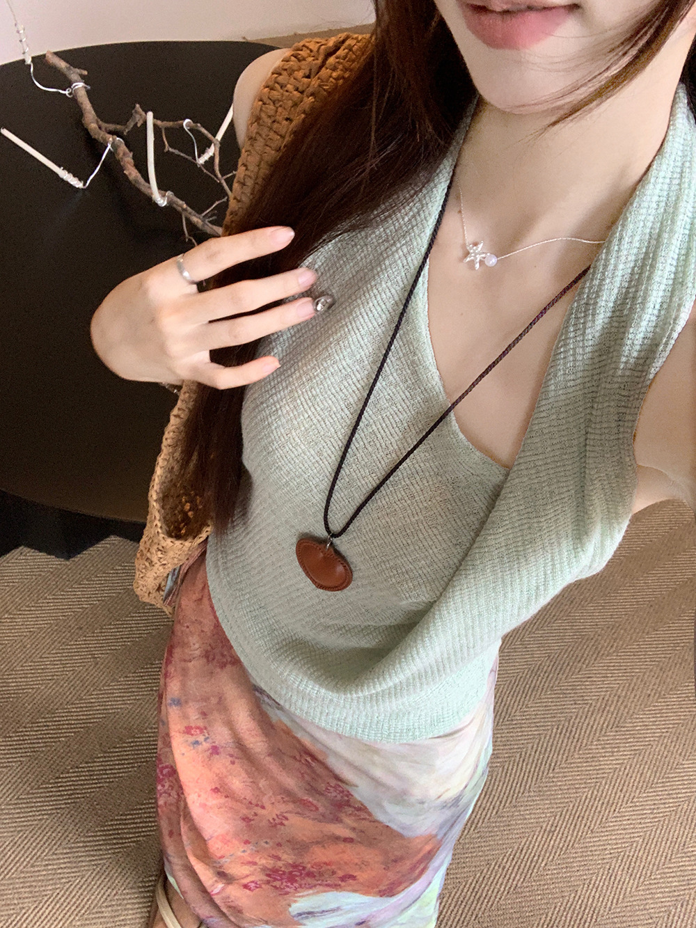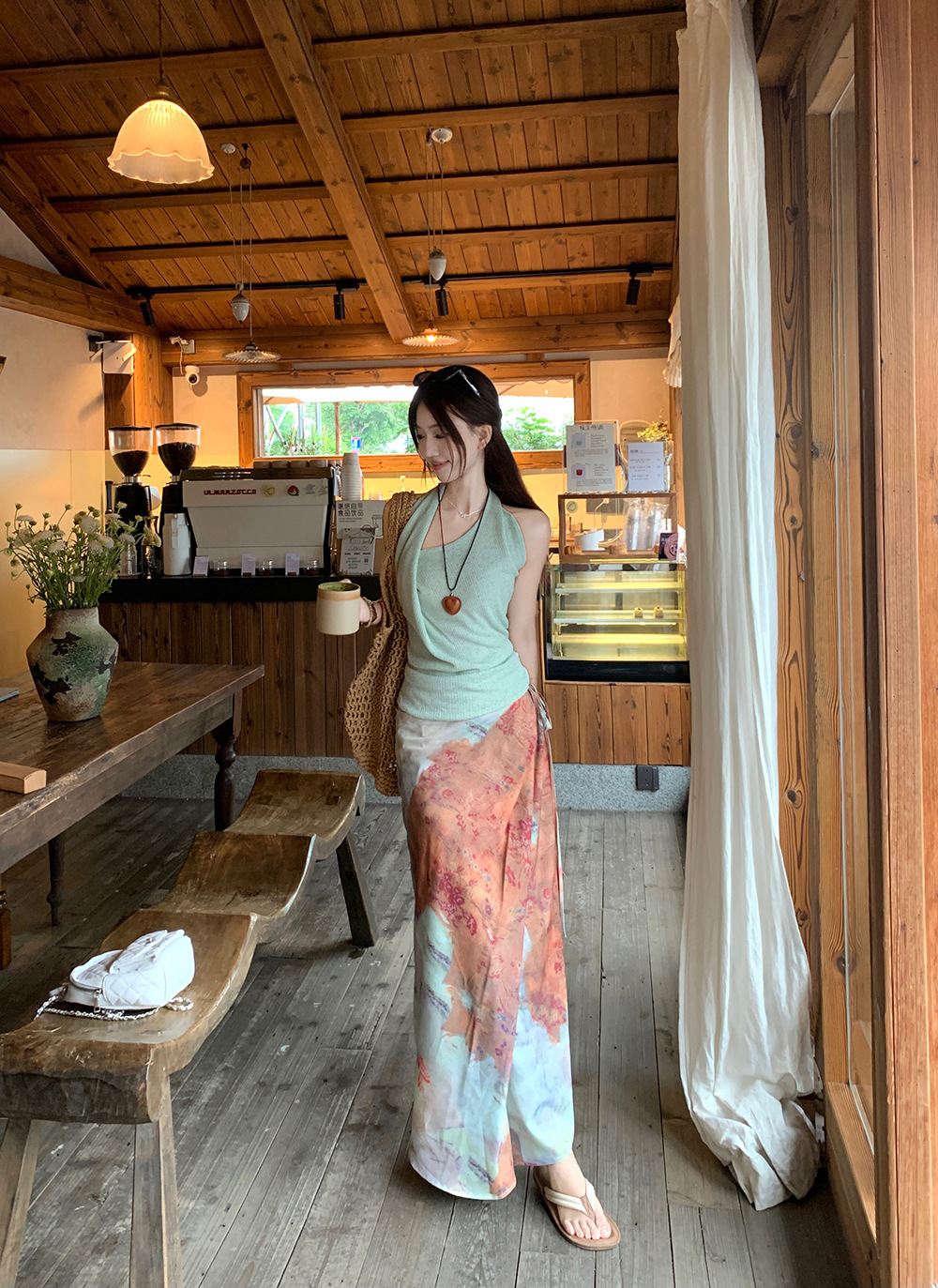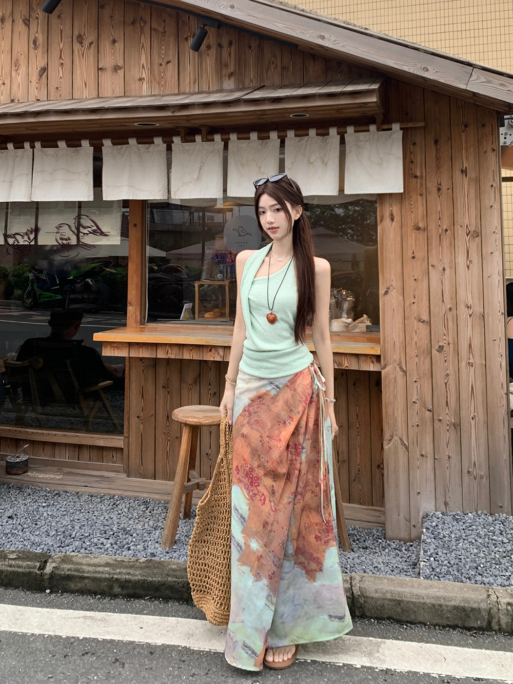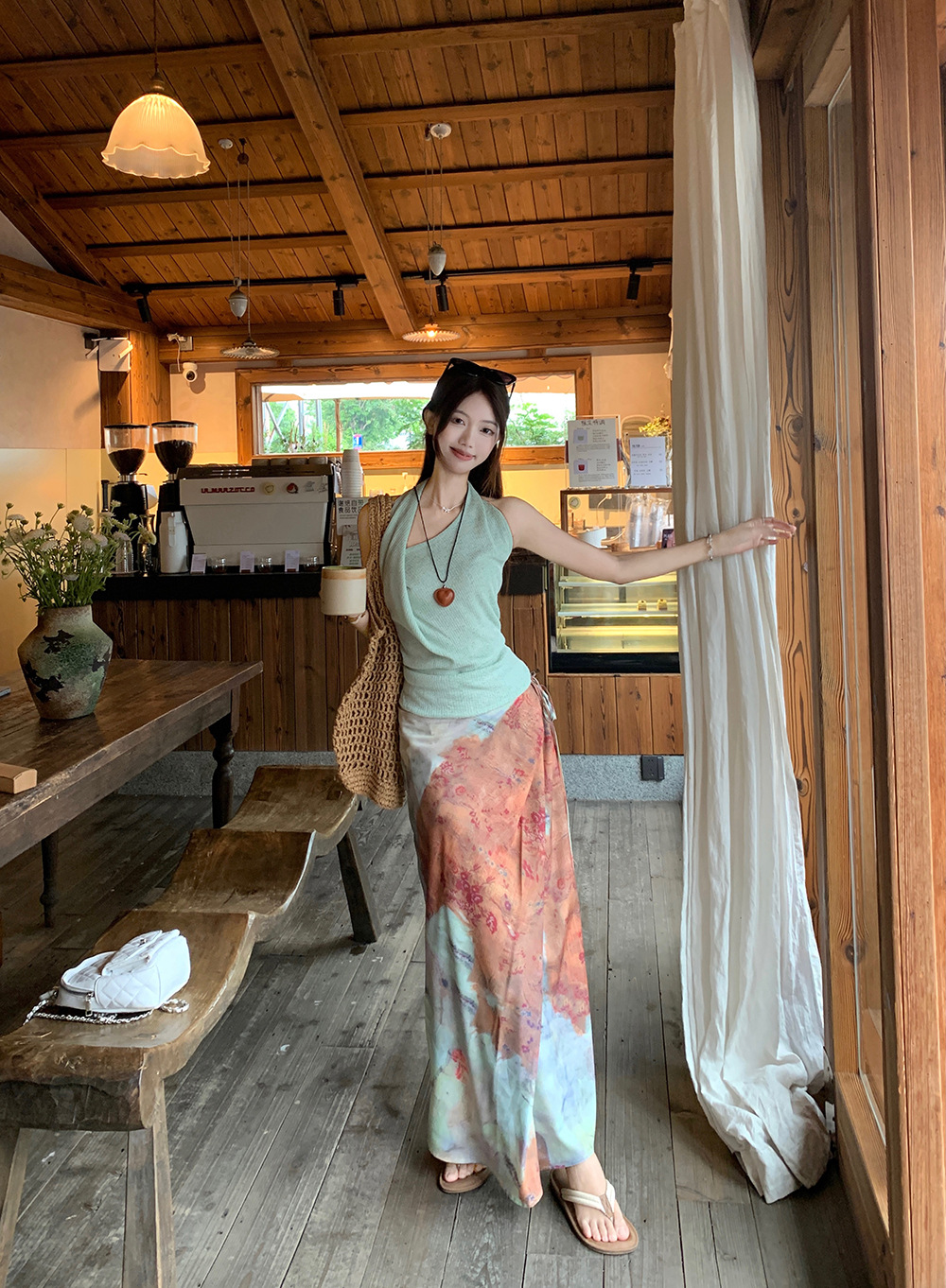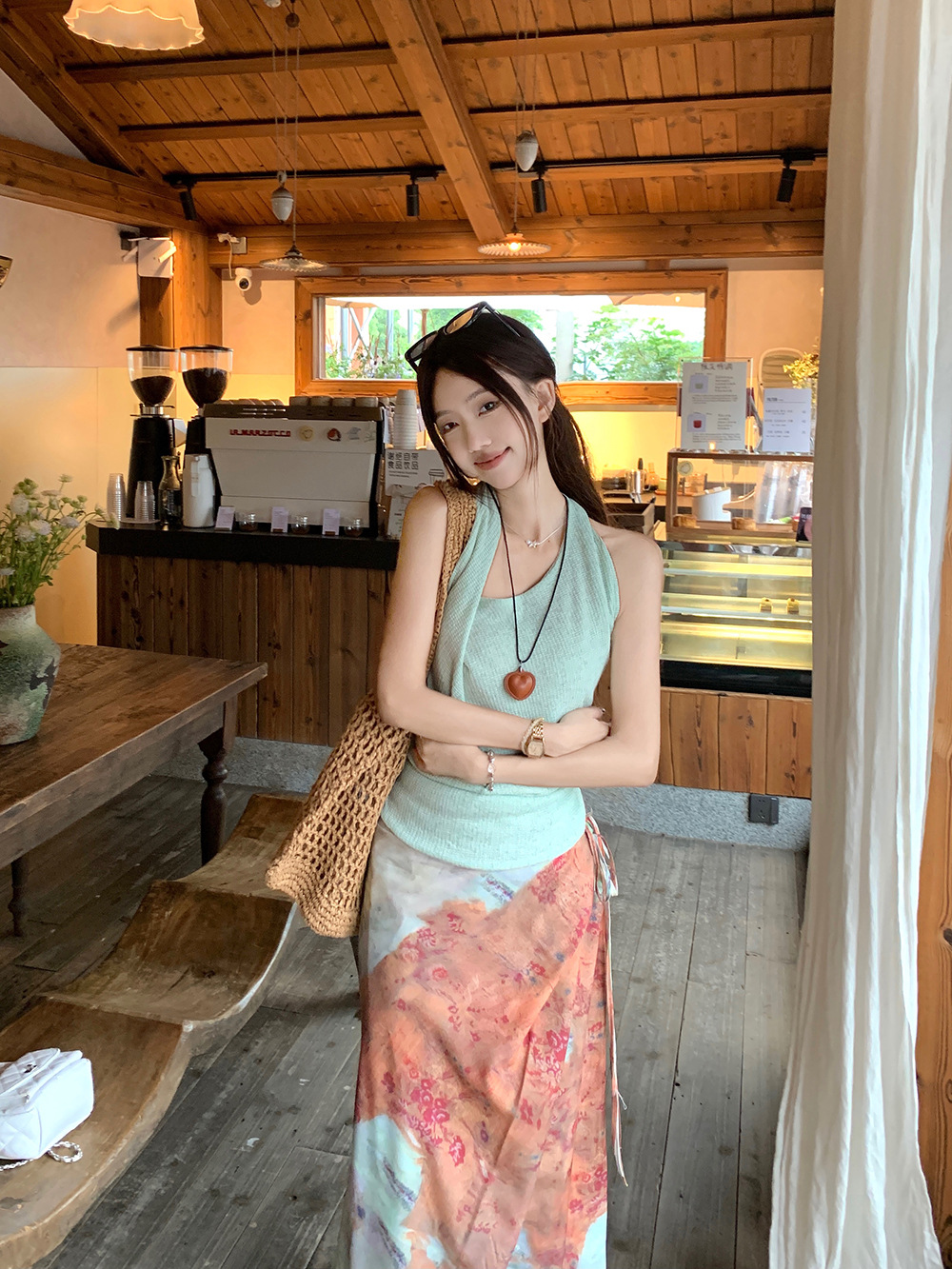 실제 사진 ~ 민트 맘보 여름 홀터넥 탱크탑 + 우아한 복고풍 타이 염색 하이웨이스트 스커트 여성복스토어 가기