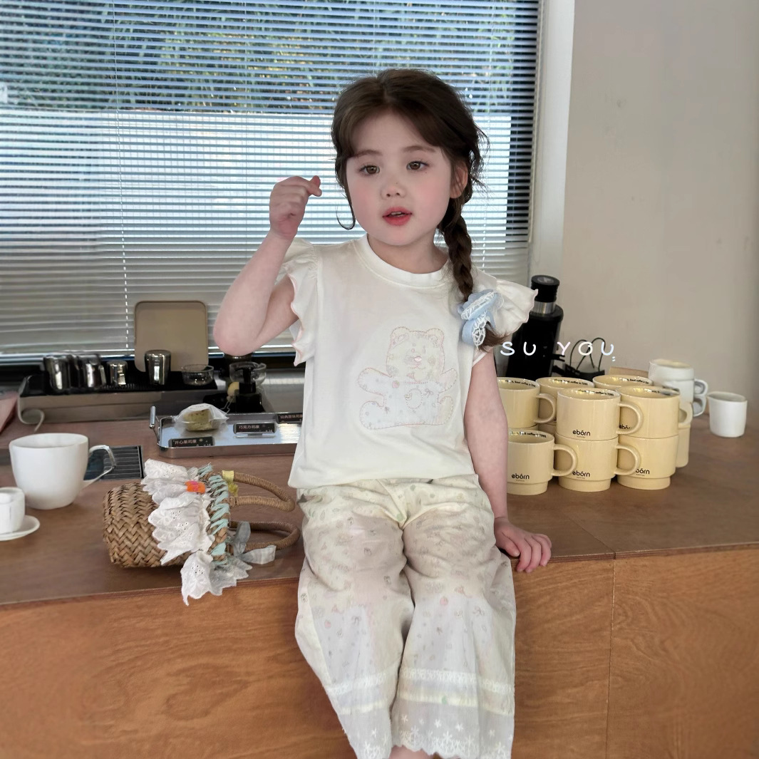 재고 있음 25 새로운 여름 스타일 소녀 패치 곰 작은 플라잉 슬리브 조끼 탑 모기 방지 다리 바지 정장 달콤하고 귀여운스토어 가기