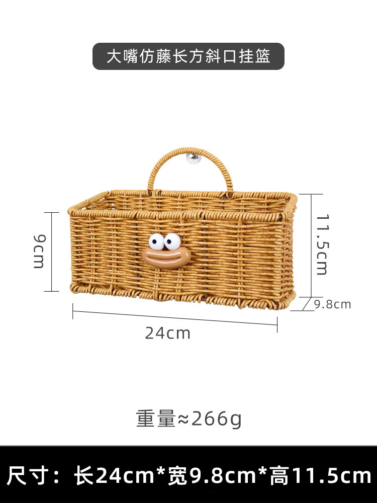 • 모조 등나무 직사각형 경사 입 걸이 바구니에는 끈끈한 고리 1개가 함께 제공됩니다.