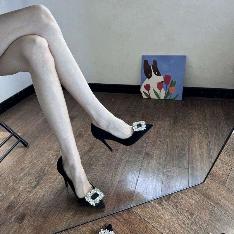 여성을위한 블랙 순수한 욕망 하이힐 스틸레토 힐 2025 새로운 통근 여성 신발 라인 석 뾰족한 프랑스 스타일 신발스토어 가기