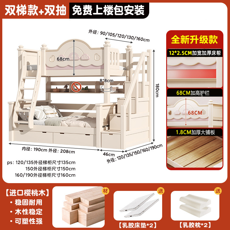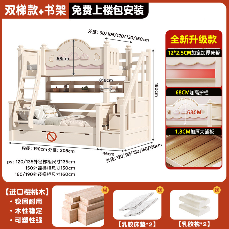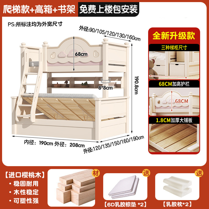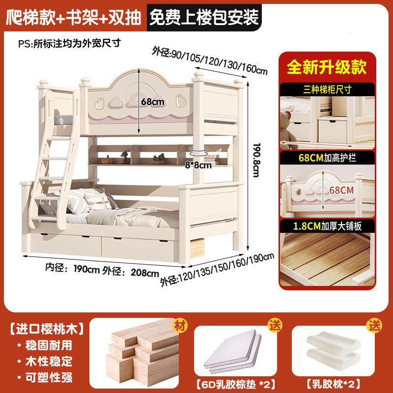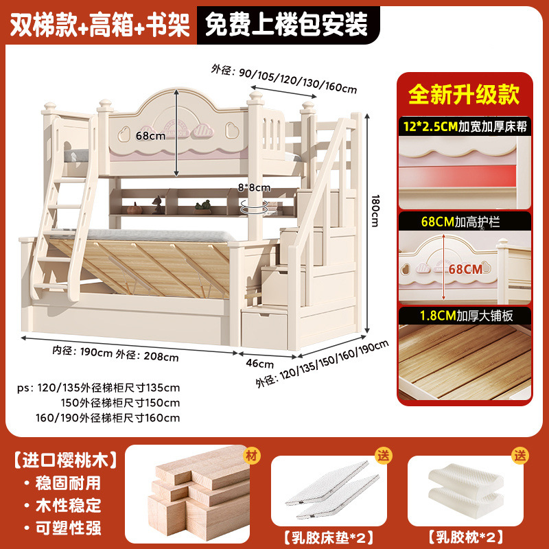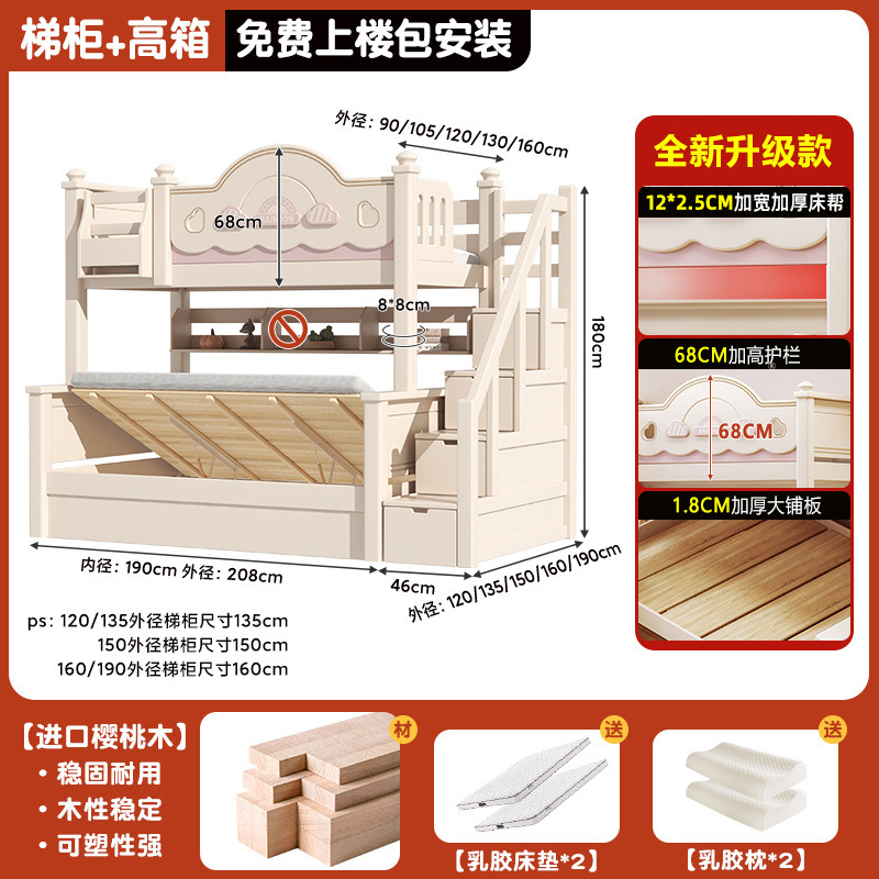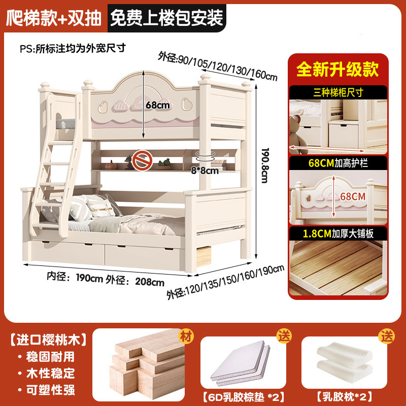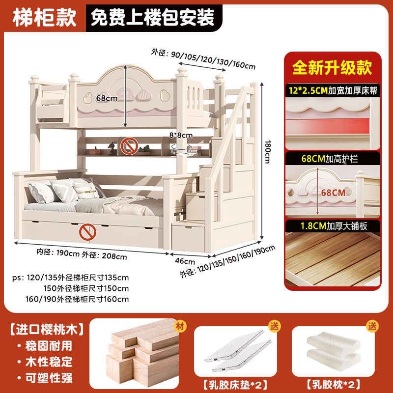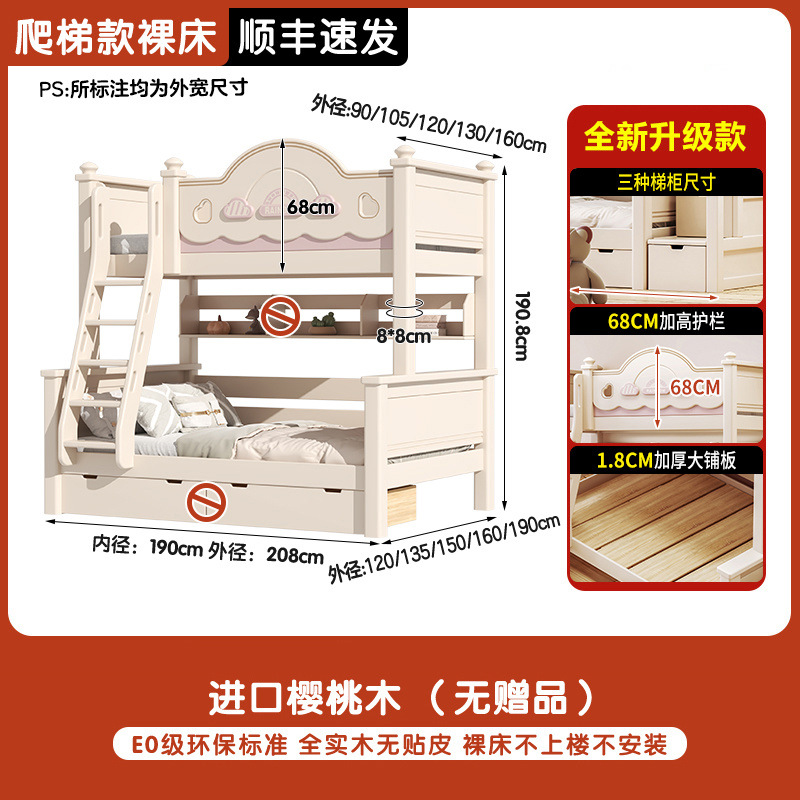 2층 침대, 원목 이층 침대, 소년 소녀용 체리나무 높낮이 침대, 소형 아파트 어린이 침대