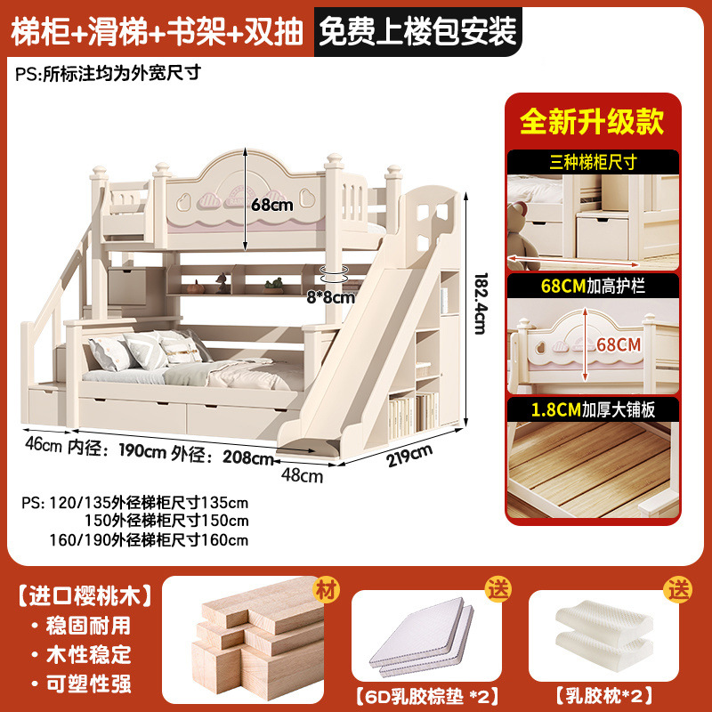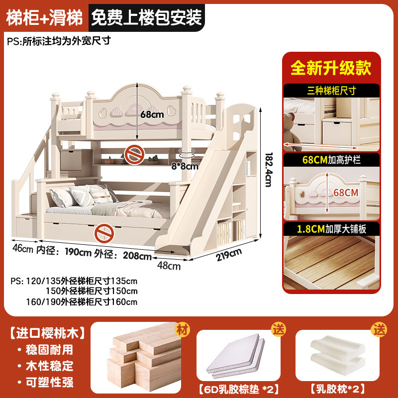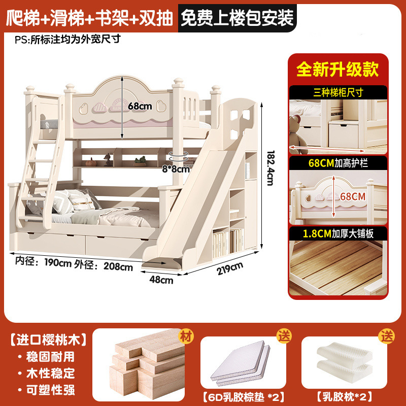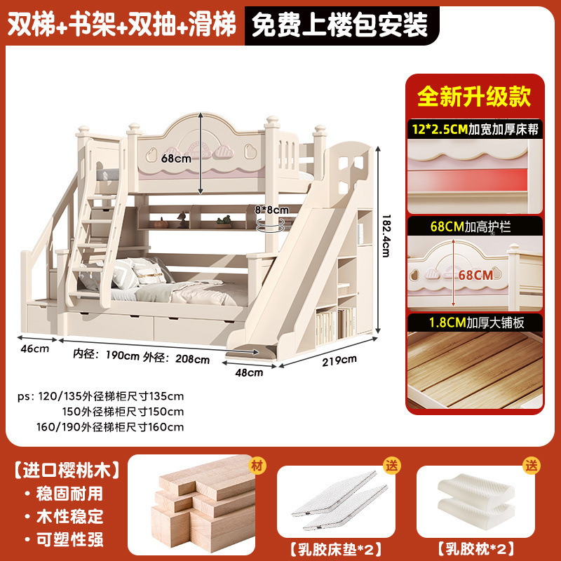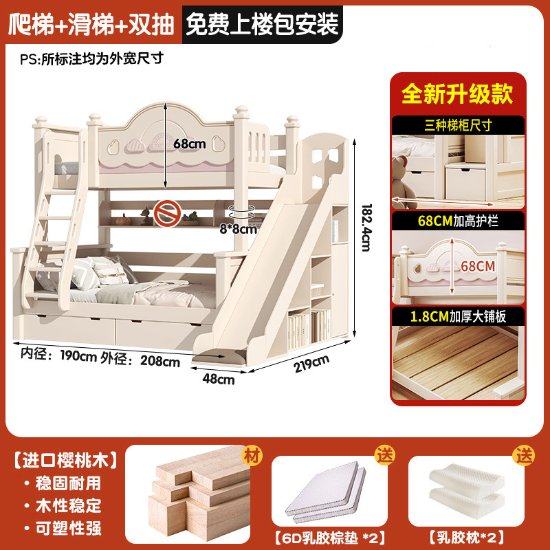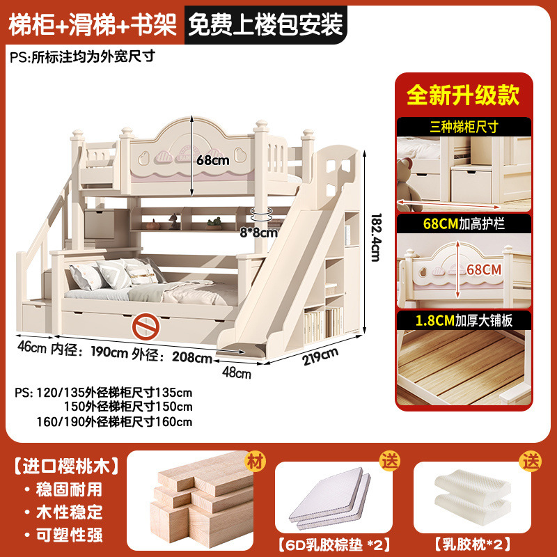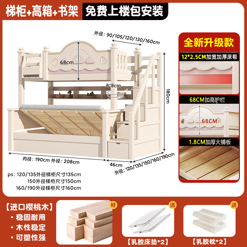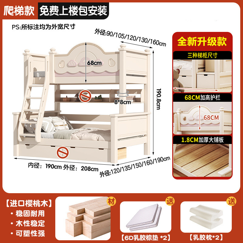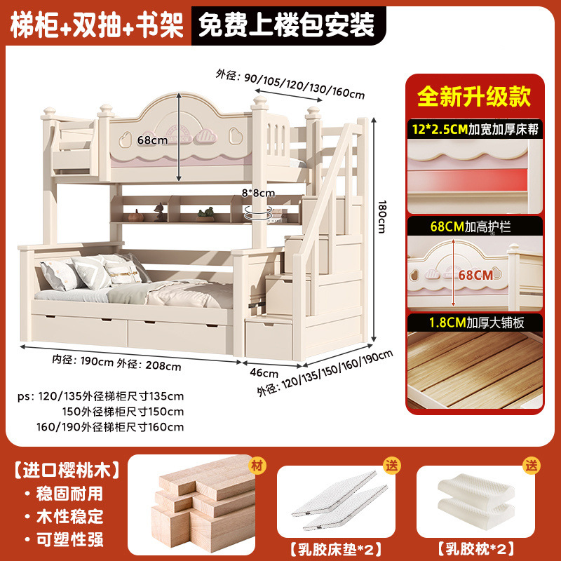 2층 침대, 원목 이층 침대, 소년 소녀용 체리나무 높낮이 침대, 소형 아파트 어린이 침대