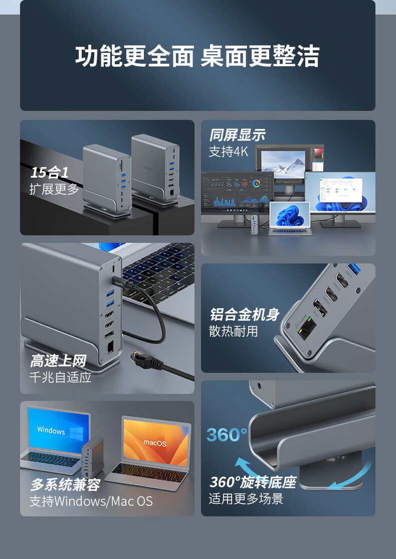 • 15-in-1 데스크탑 도킹 스테이션[4개의 화면 독립 디스플레이 + 4K@60Hz + 기가비트 이더넷 포트 + USB]는 모든 기능을 갖춘 C 포트/Thunderbolt 인터페이스에 연결됩니다.