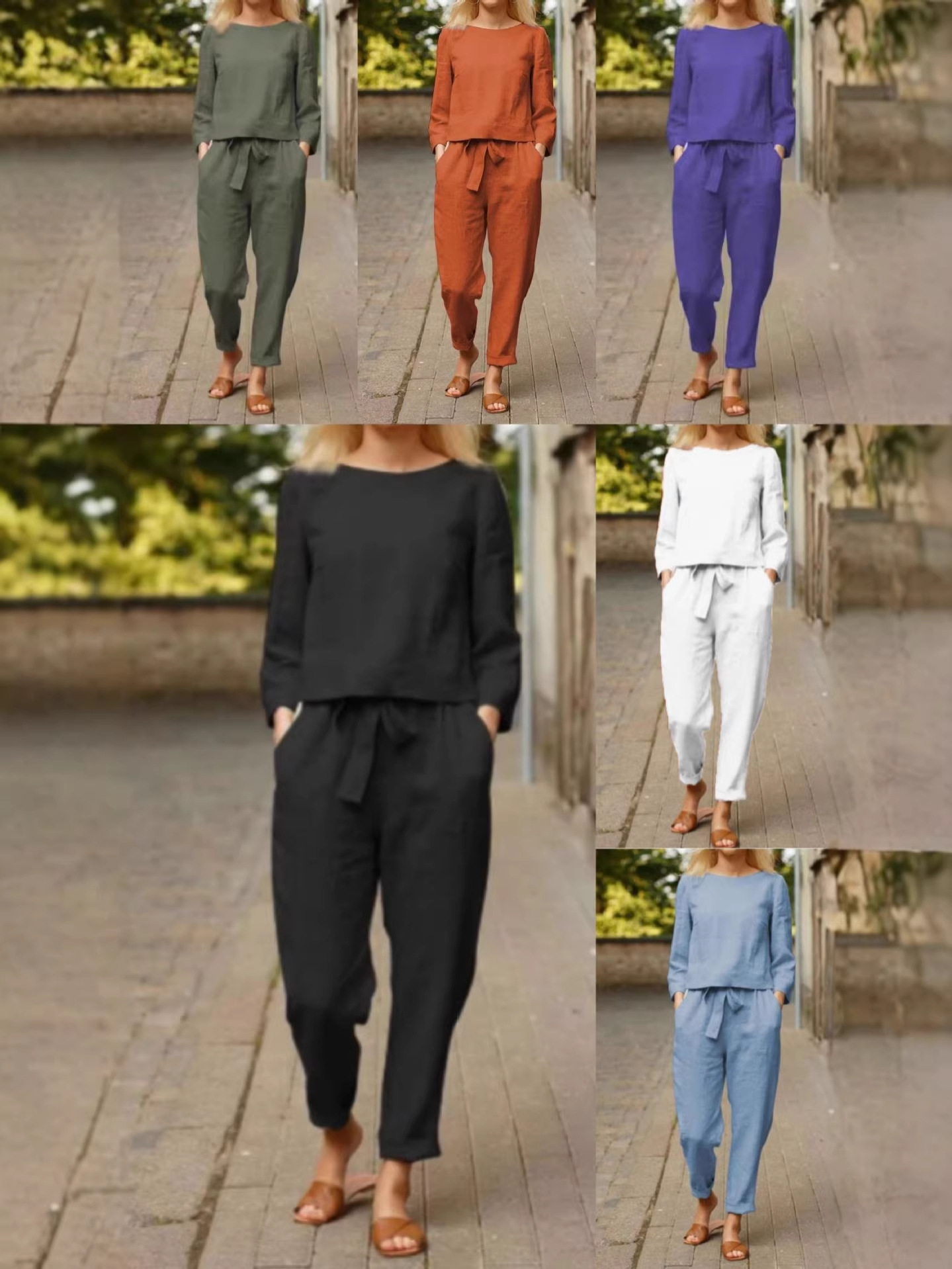 린넨 정장 여성 패션 솔리드 컬러 캐주얼 투피스 세트 대외 무역 봄 여름 단순 복고풍 탄성 허리 레이스 업스토어 가기