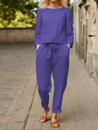 린넨 정장 여성 패션 솔리드 컬러 캐주얼 투피스 세트 대외 무역 봄 여름 단순 복고풍 탄성 허리 레이스 업
