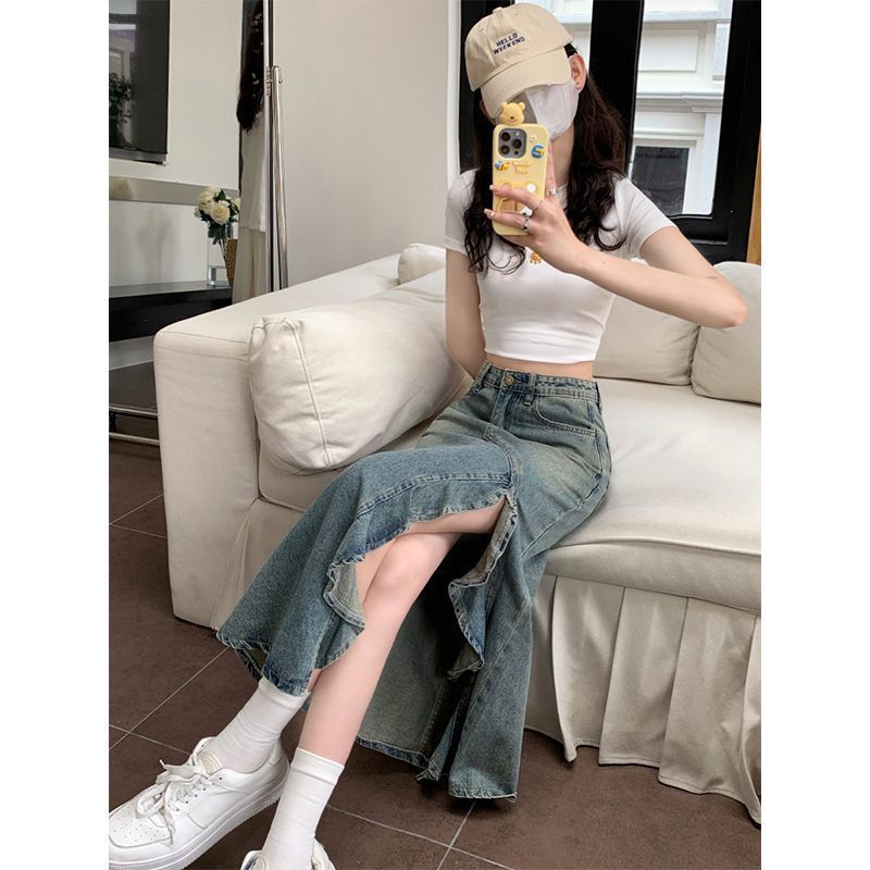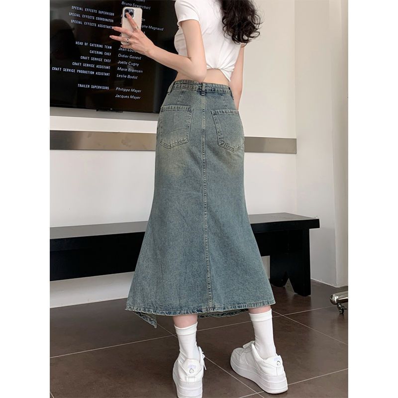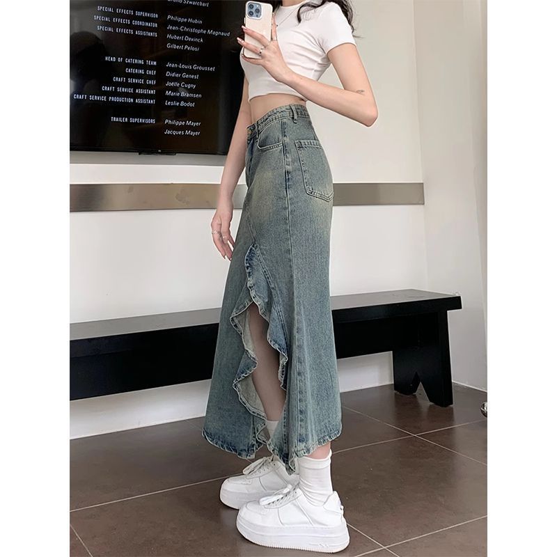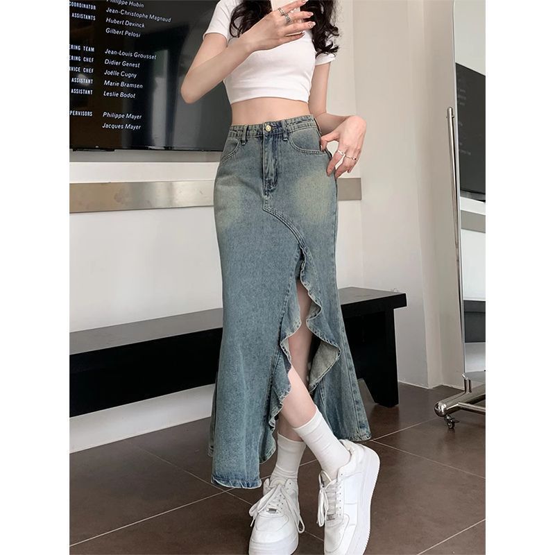 여아 봄 러플 데님 스커트, 봄 여름 하이웨이스트 피쉬테일 스커트, 여아용 힙 커버 스커트스토어 가기