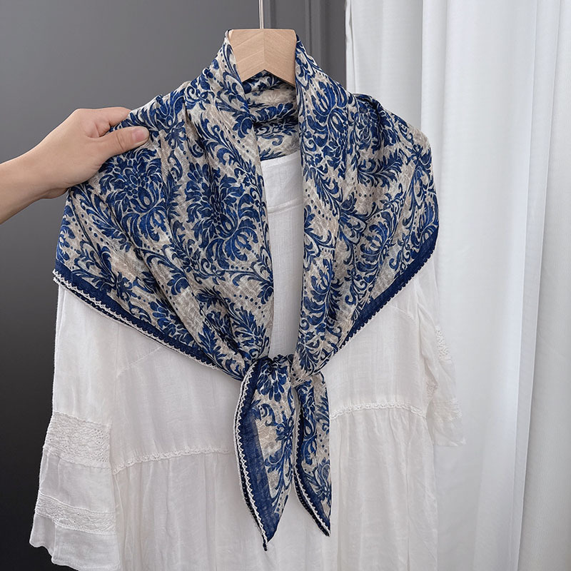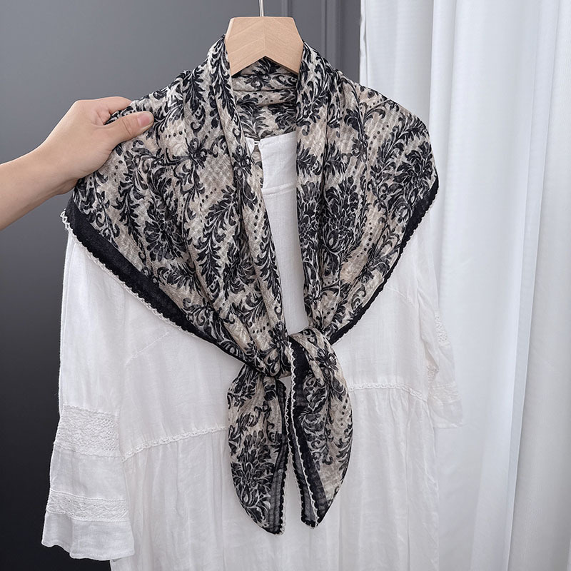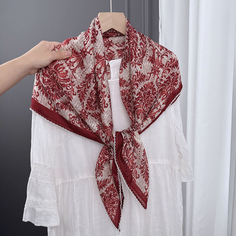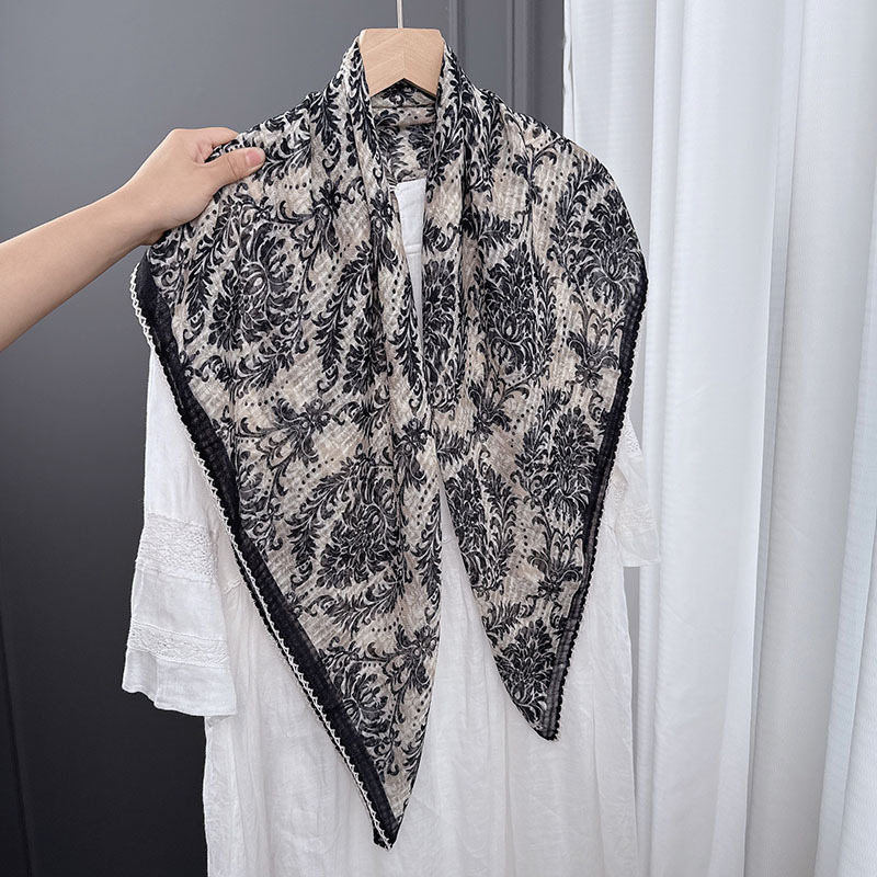 여성용 곡선 가장자리 면 및 린넨 느낌 대형 사각형 스카프 90x90 공장 가격 궁전 스타일 꽃 얇은 스카프 부드러운 스카프